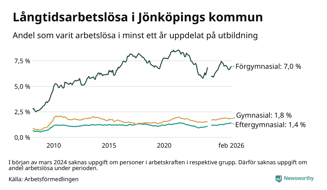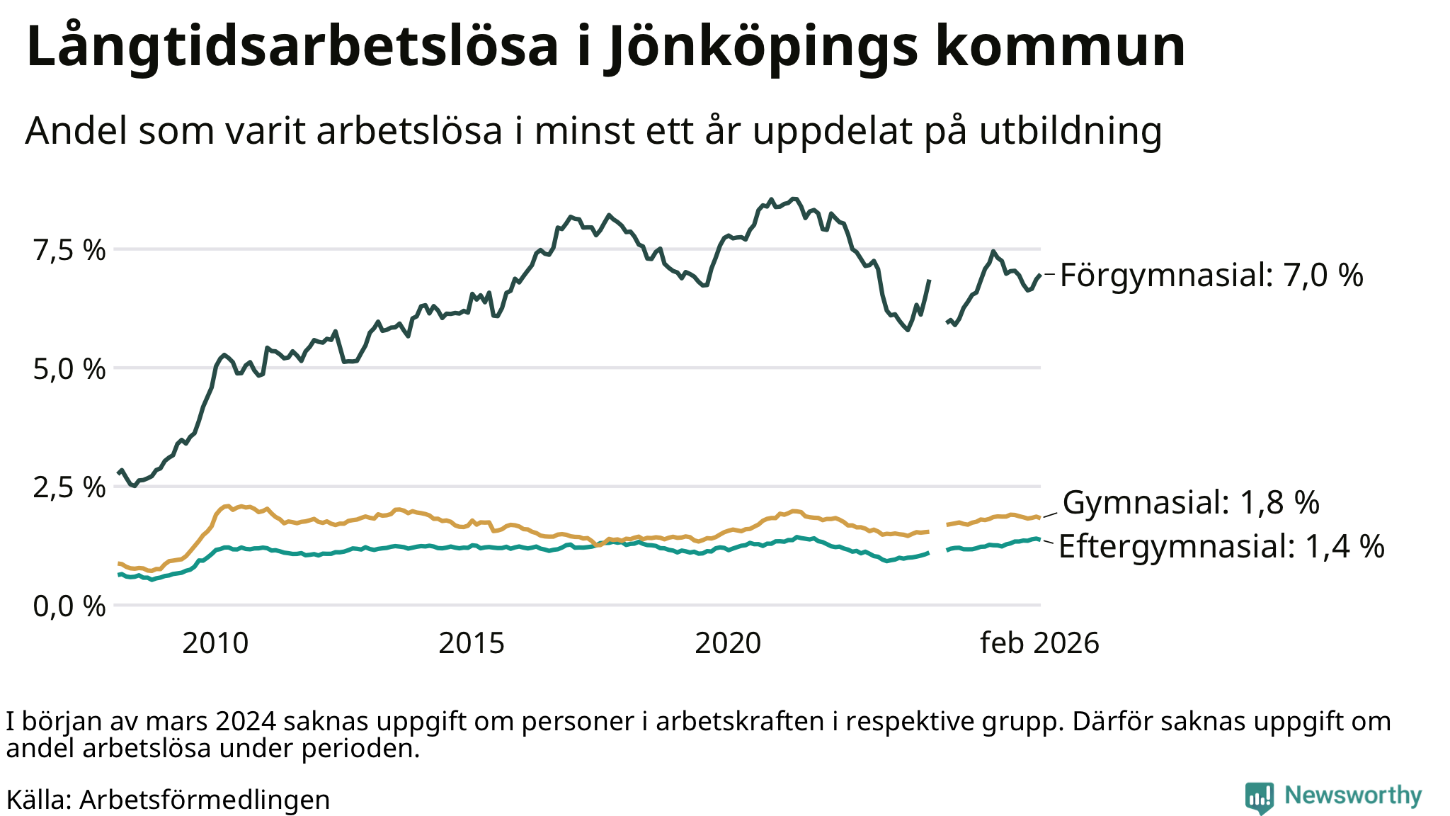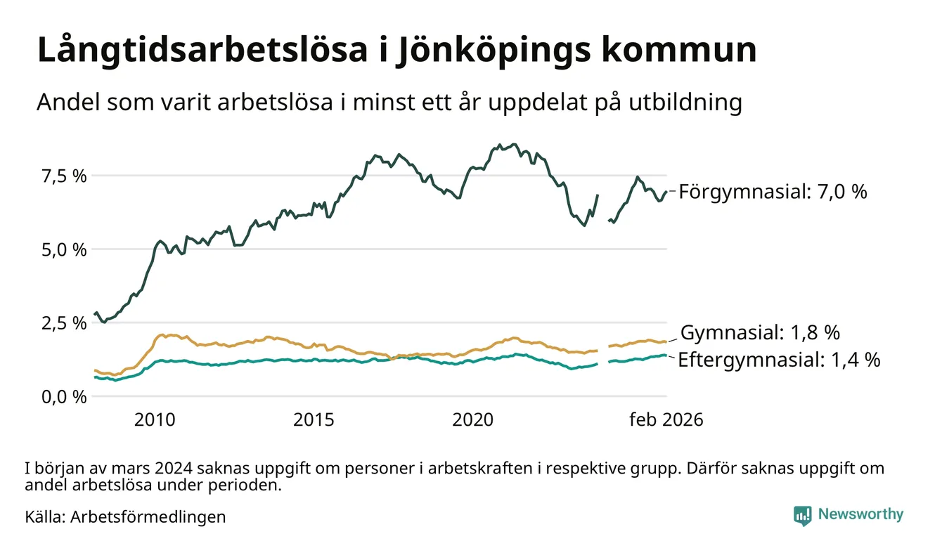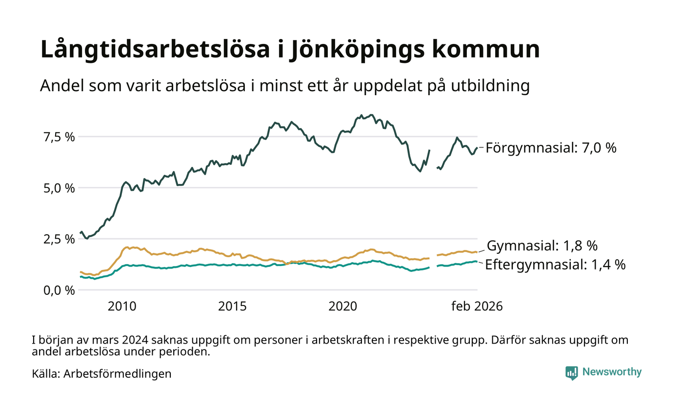 I februari hade 1 731 Jönköpingsbor varit arbetslösa i minst ett år, vilket är nio färre än månaden innan. 1 731 personer motsvarar 2,3 procent av arbetskraften i kommunen – andelen långtidsarbetslösa är ungefär på samma nivå som för ett år sedan.