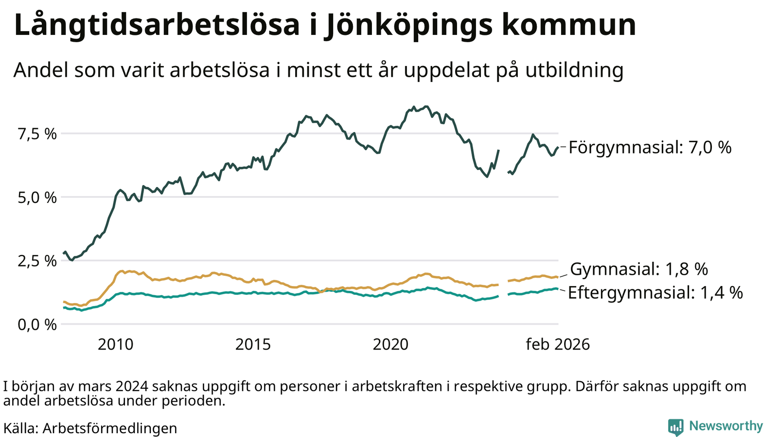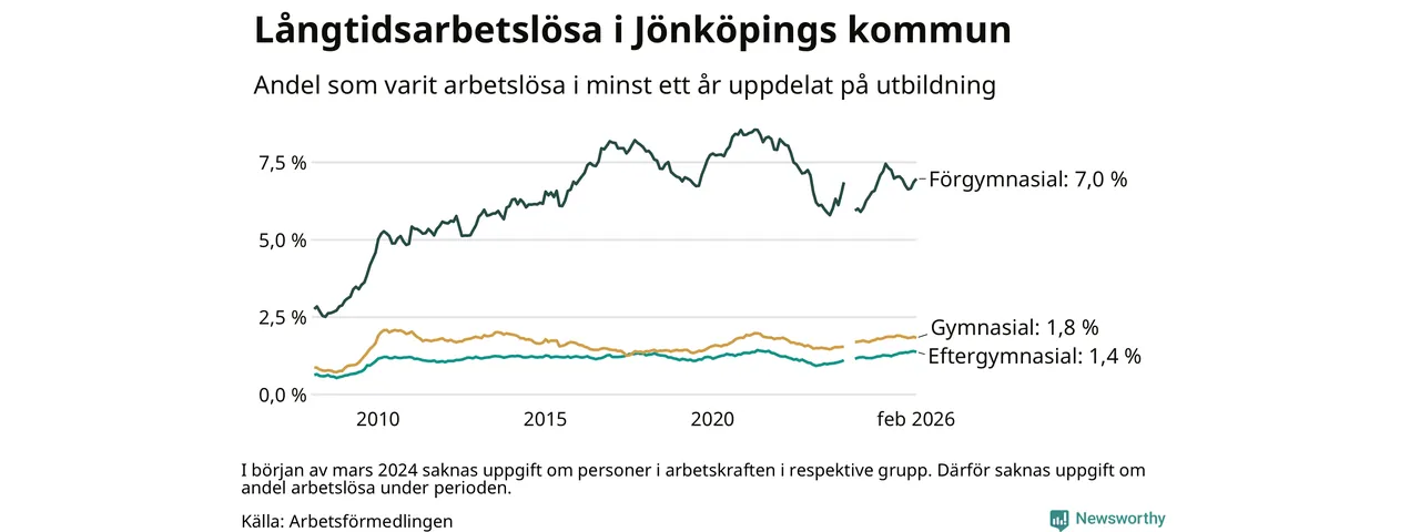 Andelen som varit utan arbete i minst ett år i Jönköpings kommun var ungefär lika stor i februari jämfört med samma månad för ett år sedan. Det visar Arbetsfömedlingens senaste månadsstatistik.