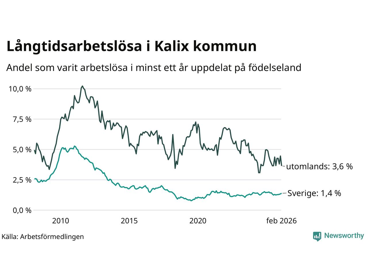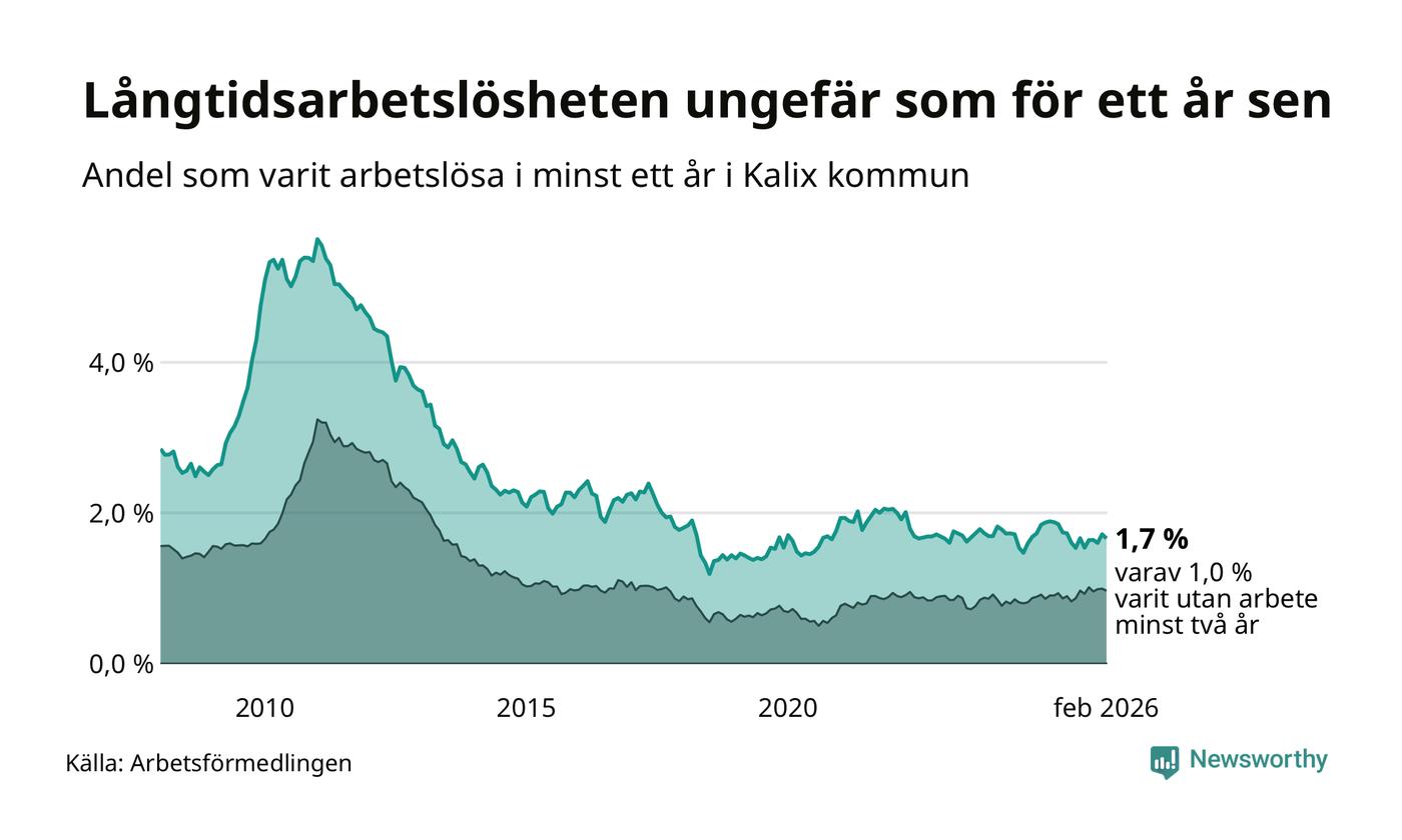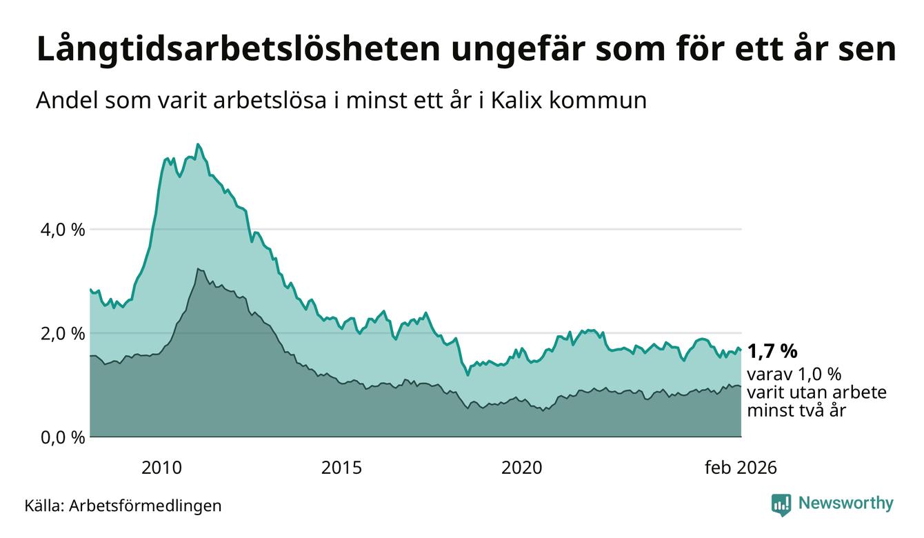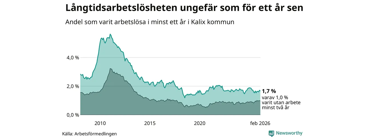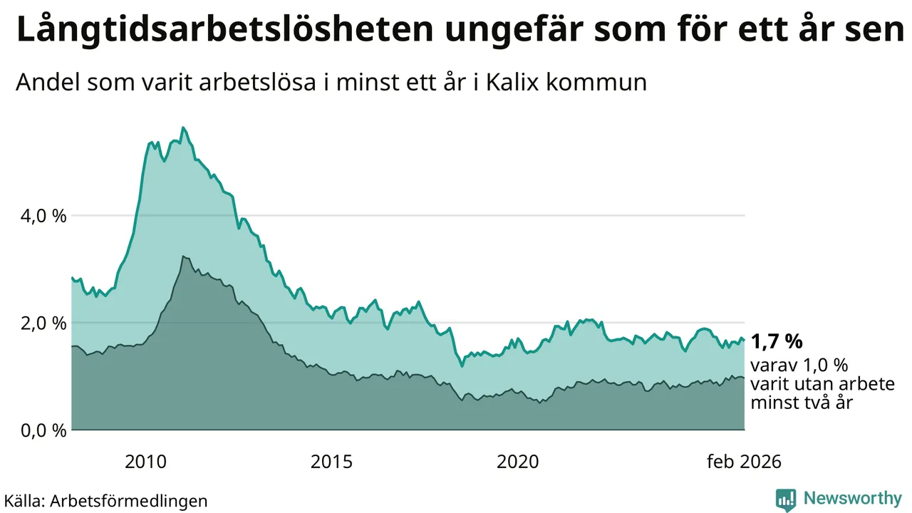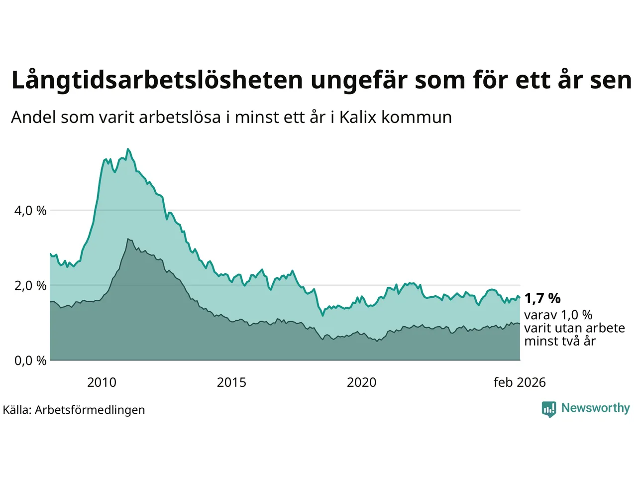 I februari hade 117 Kalixbor varit arbetslösa i minst ett år, vilket är fyra färre än månaden innan. 117 personer motsvarar 1,7 procent av arbetskraften i kommunen – andelen långtidsarbetslösa är ungefär på samma nivå som för ett år sedan.