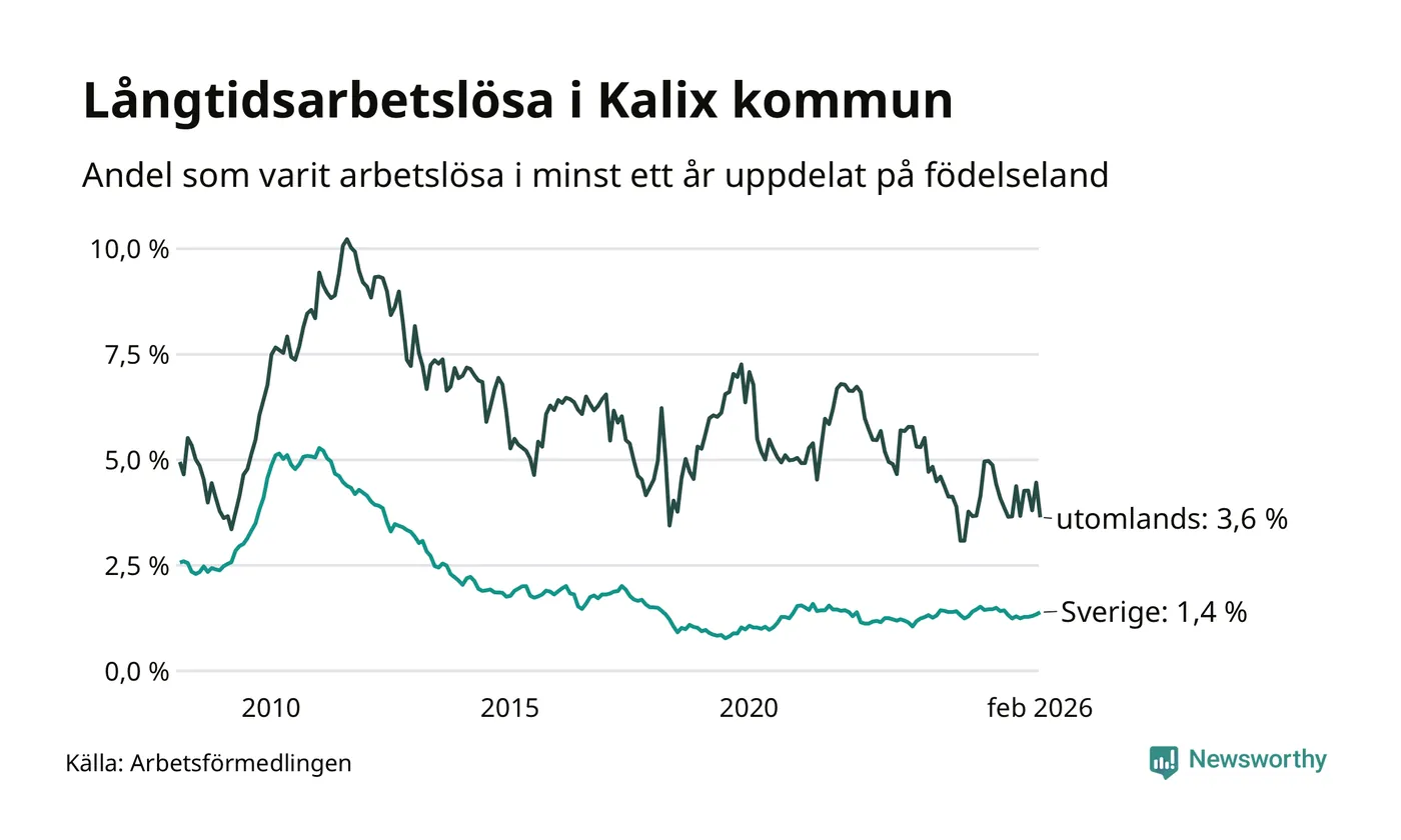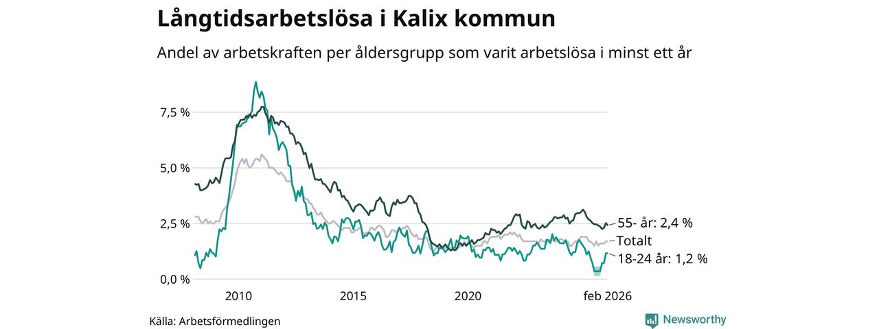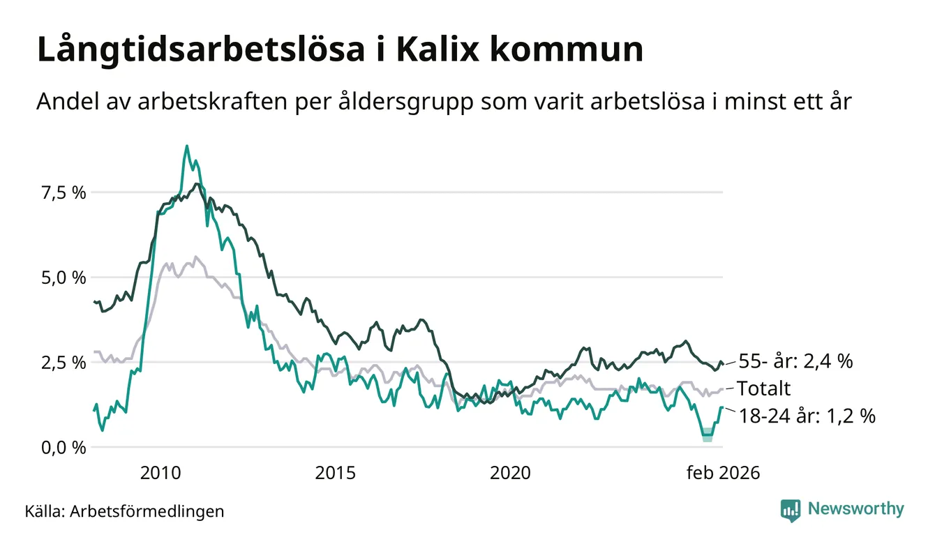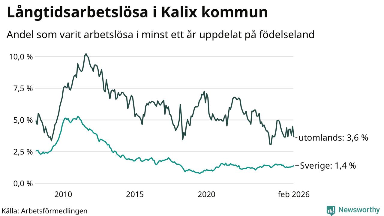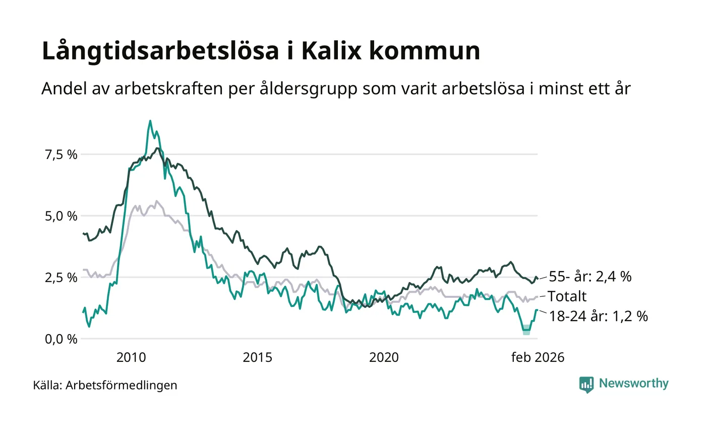 I februari hade 117 Kalixbor varit arbetslösa i minst ett år, vilket är fyra färre än månaden innan. 117 personer motsvarar 1,7 procent av arbetskraften i kommunen – andelen långtidsarbetslösa är ungefär på samma nivå som för ett år sedan.