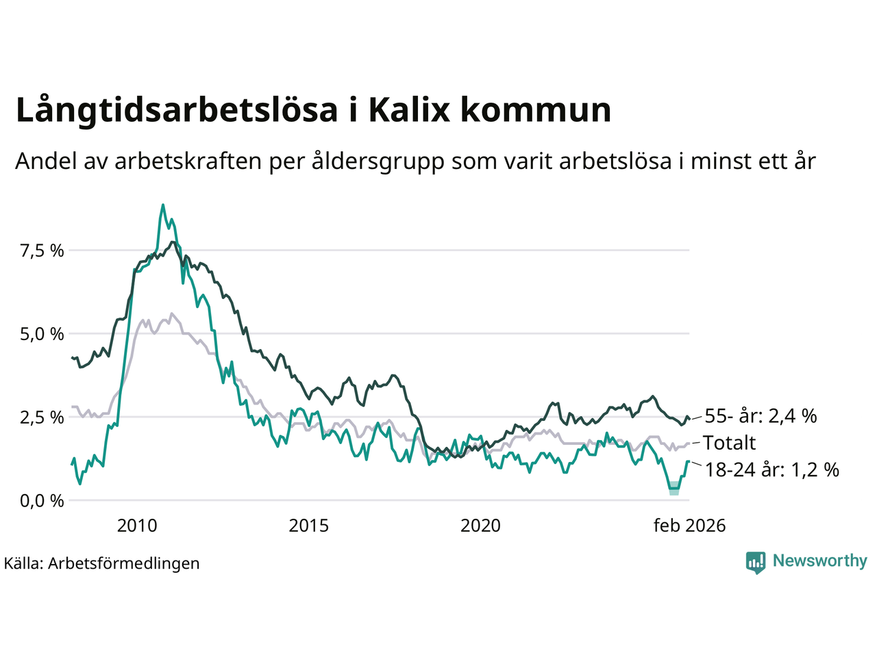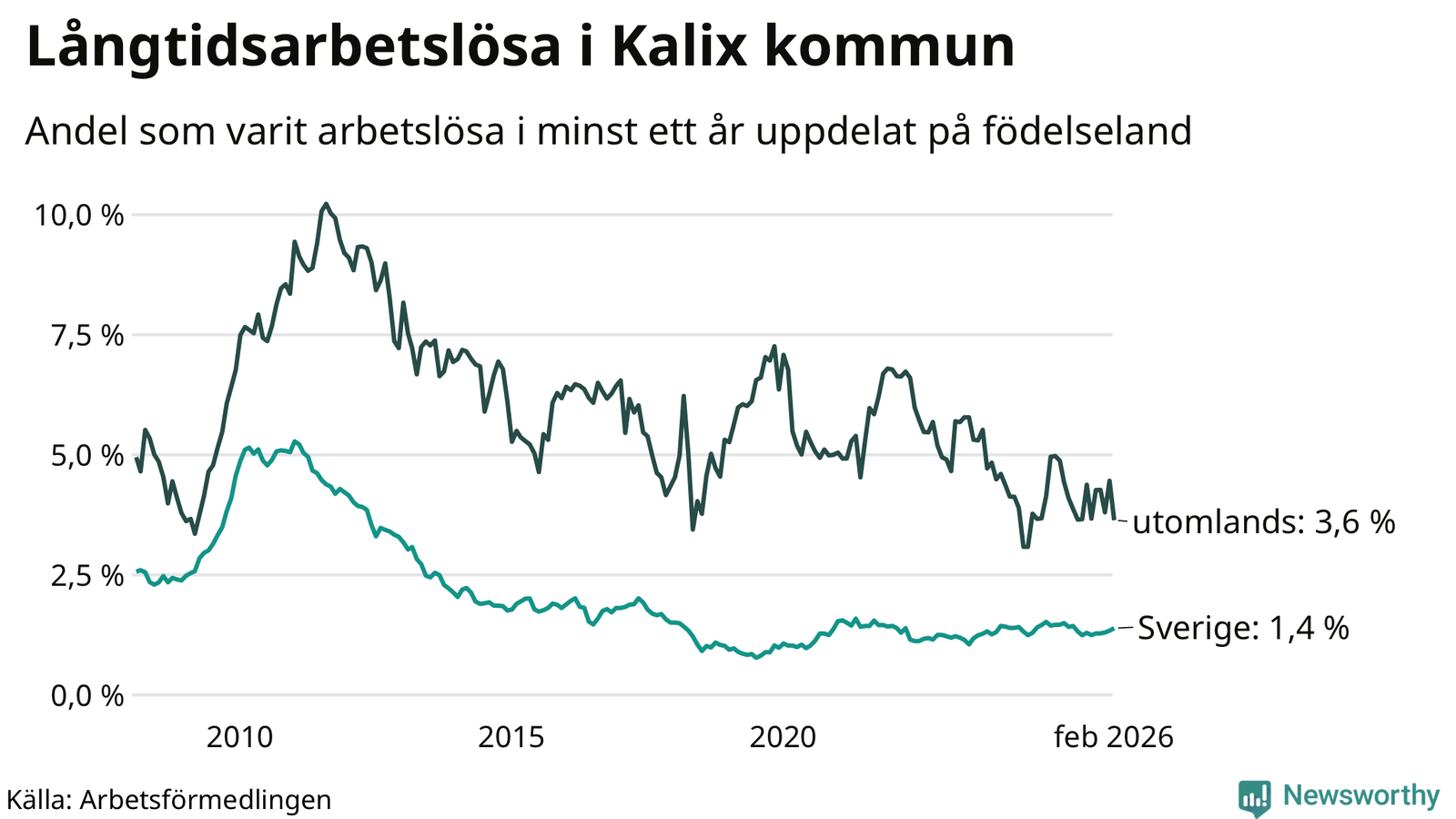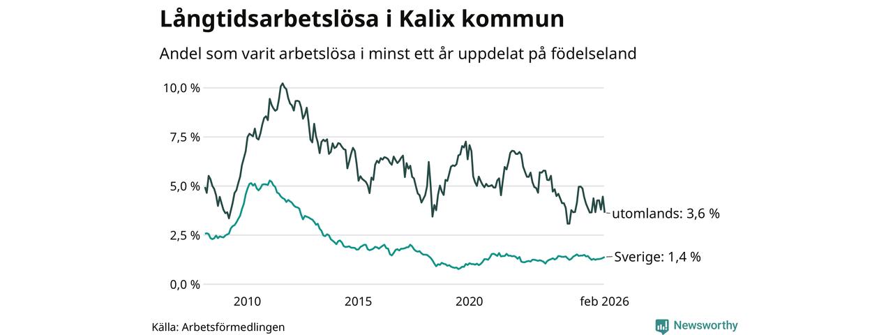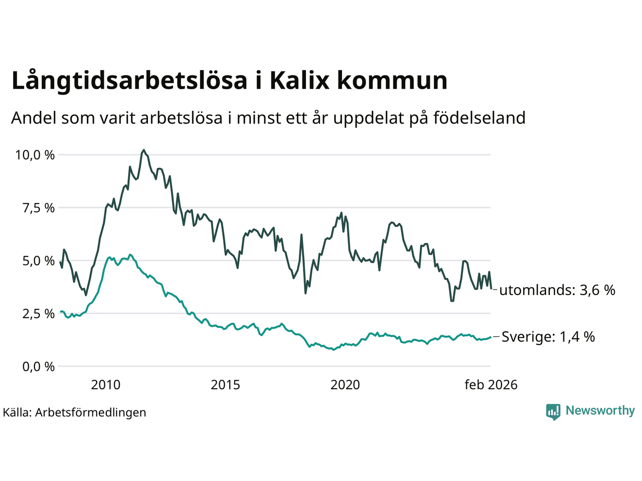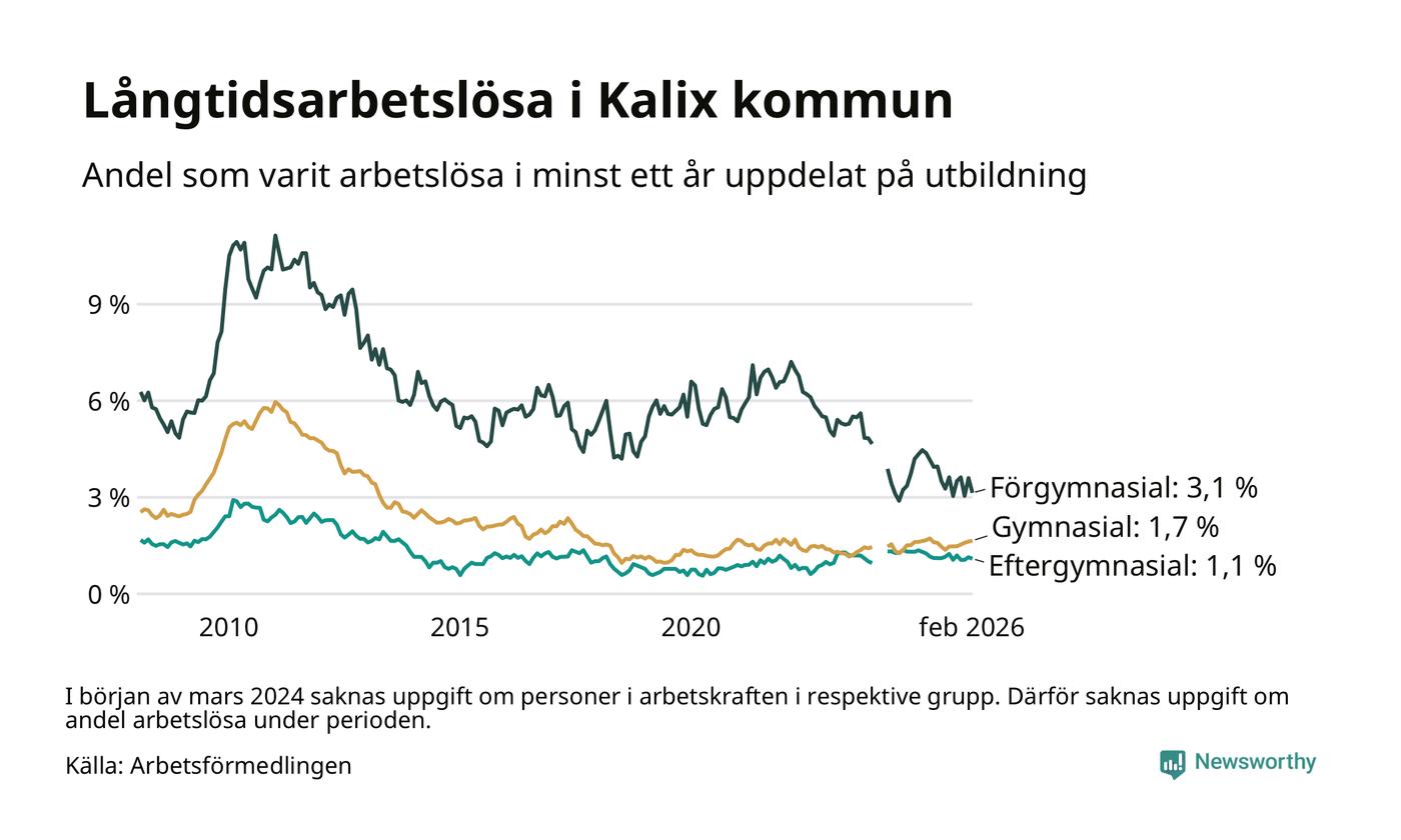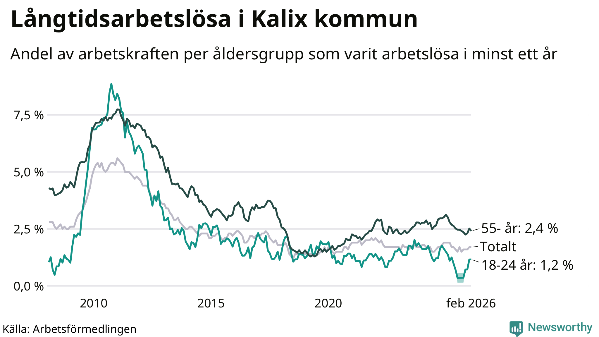 I februari hade 117 Kalixbor varit arbetslösa i minst ett år, vilket är fyra färre än månaden innan. 117 personer motsvarar 1,7 procent av arbetskraften i kommunen – andelen långtidsarbetslösa är ungefär på samma nivå som för ett år sedan.