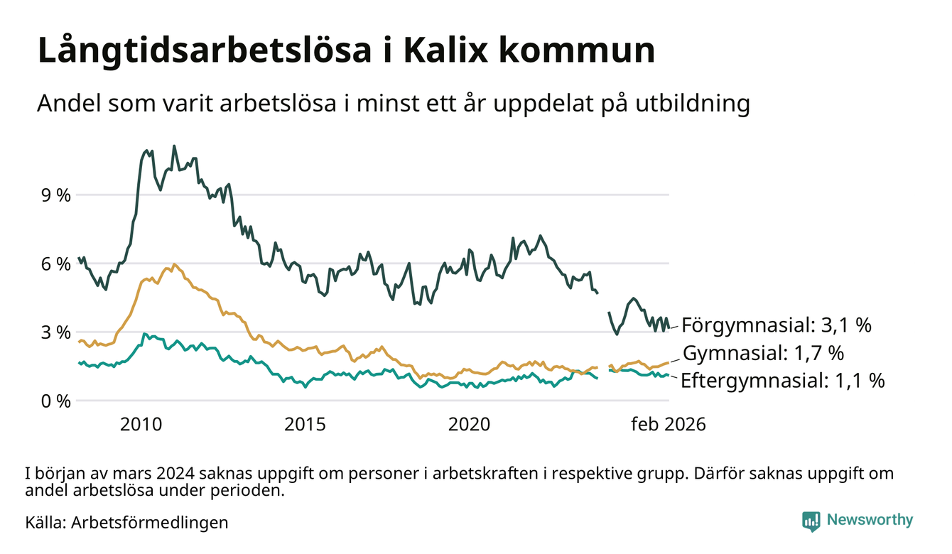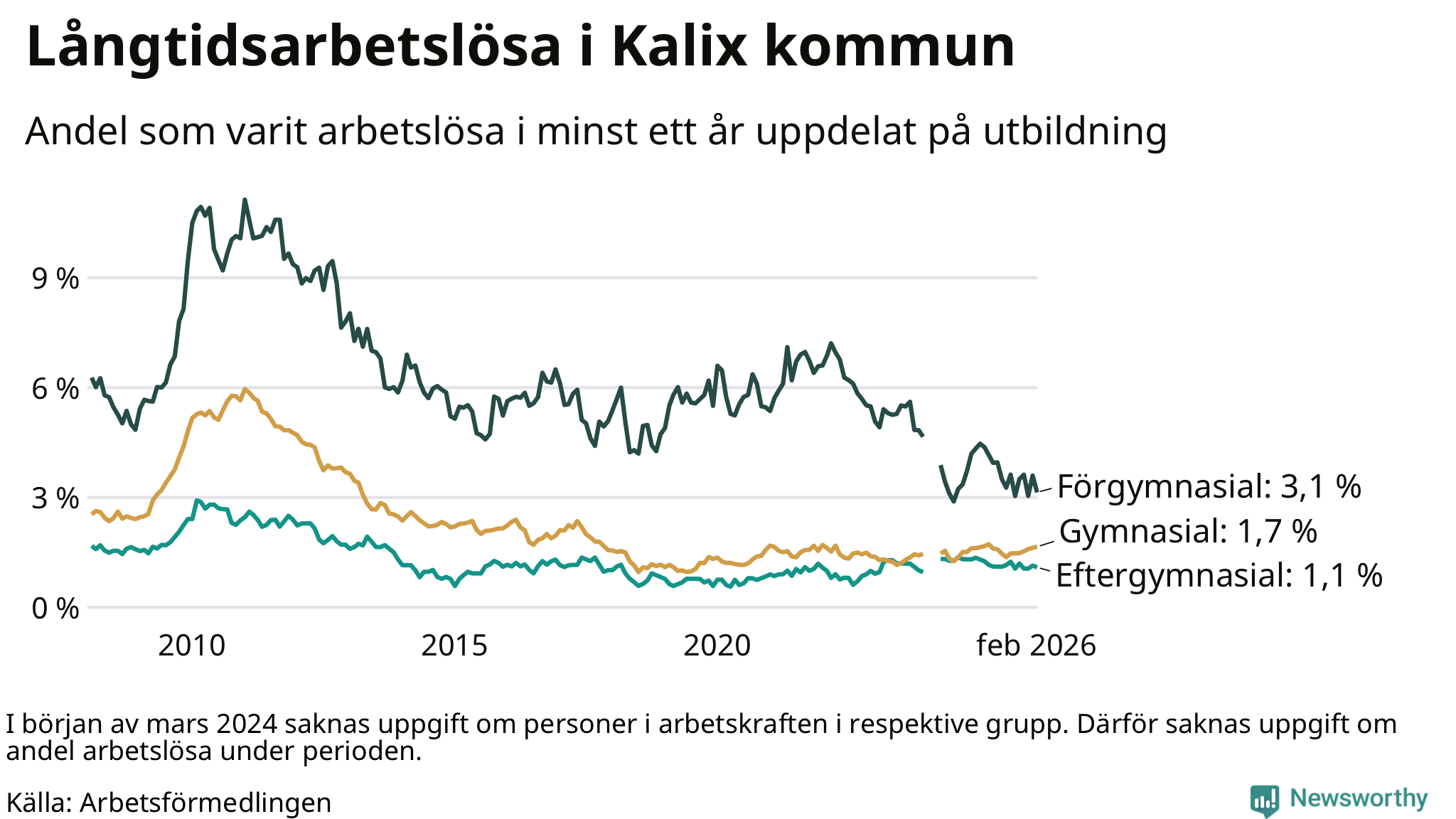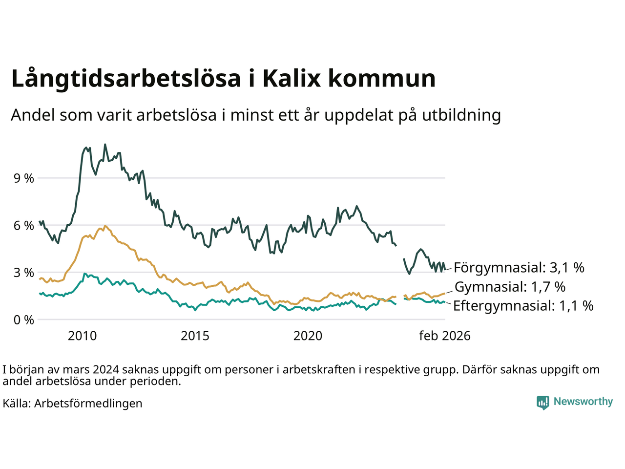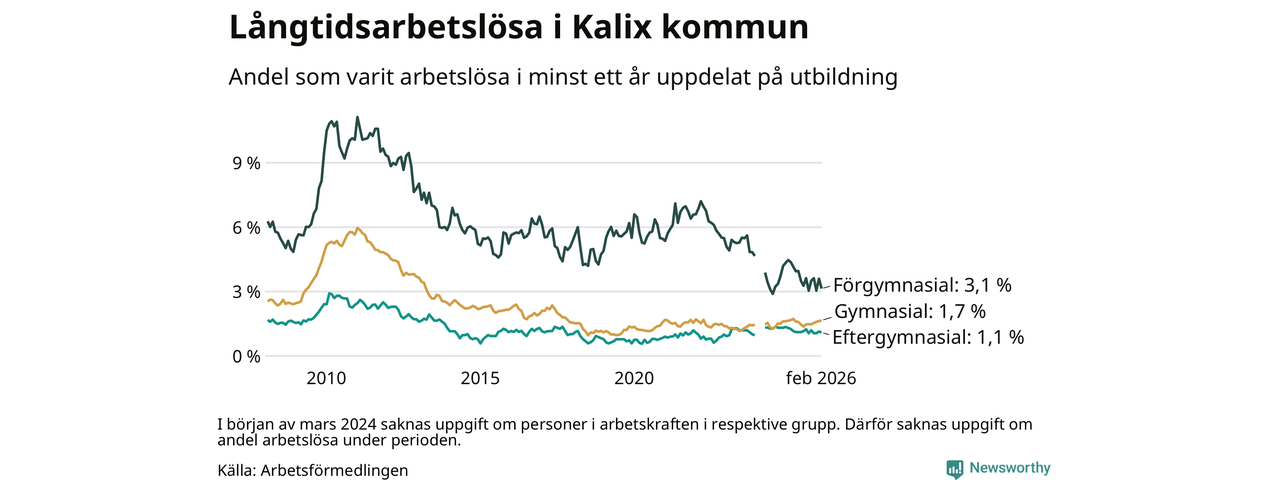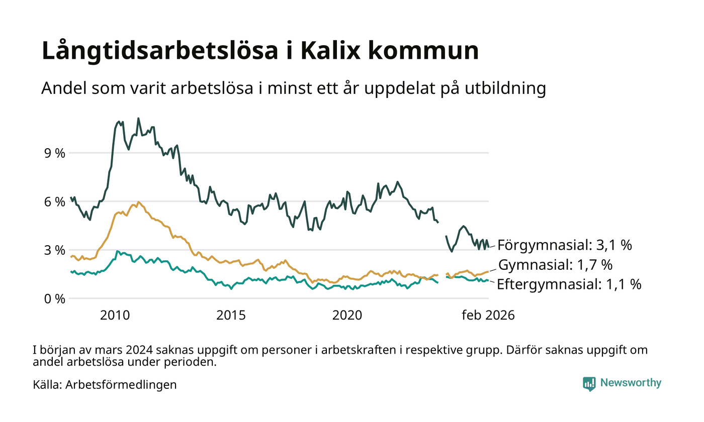 I februari hade 117 Kalixbor varit arbetslösa i minst ett år, vilket är fyra färre än månaden innan. 117 personer motsvarar 1,7 procent av arbetskraften i kommunen – andelen långtidsarbetslösa är ungefär på samma nivå som för ett år sedan.