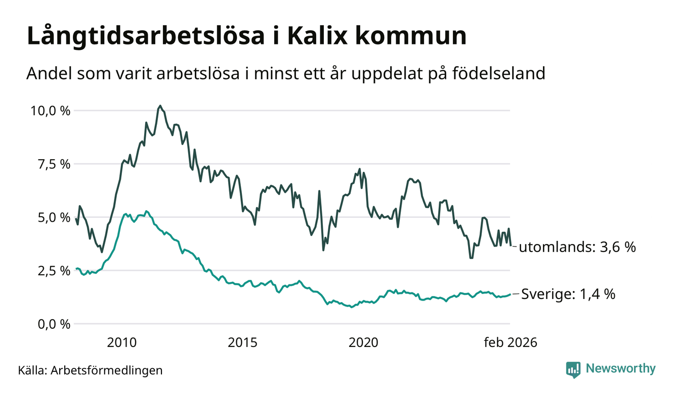 86 av de långtidsarbetslösa i Kalix är födda i Sverige, medan 31 är födda utomlands. Det innebär att långtidsarbetslösheten bland Sverigefödda är 1,4 procent, medan den är tre gånger så hög – 3,6 procent – bland födda utomlands. Även i riket som helhet är arbetslösheten högre bland utrikesfödda.