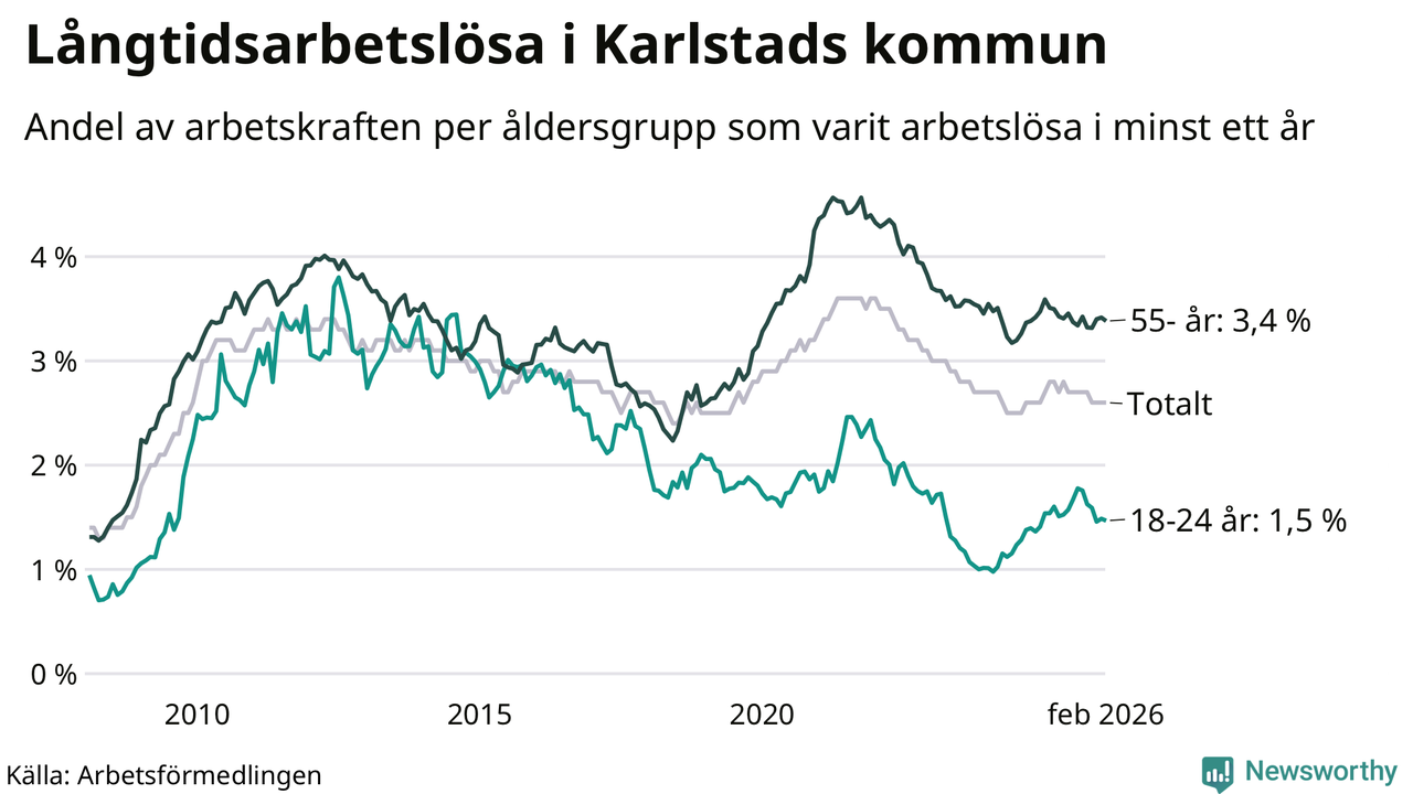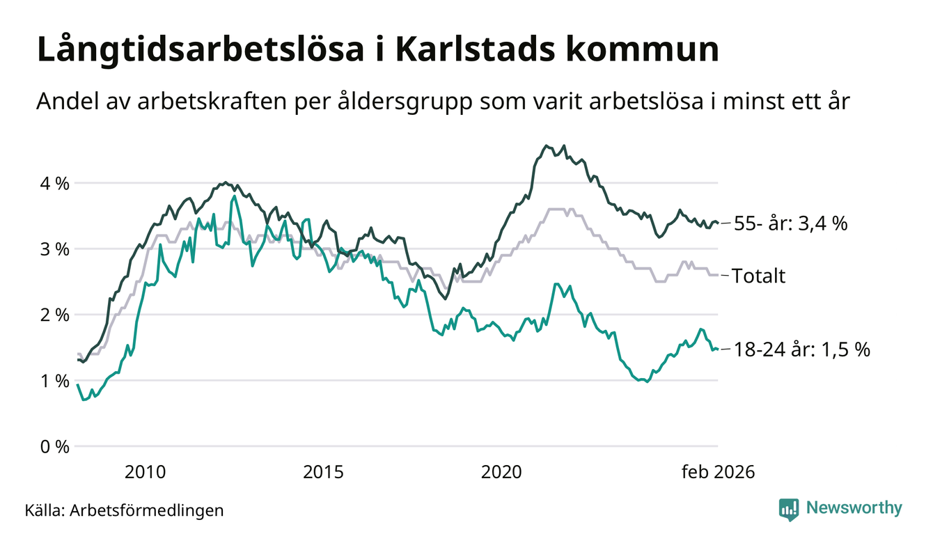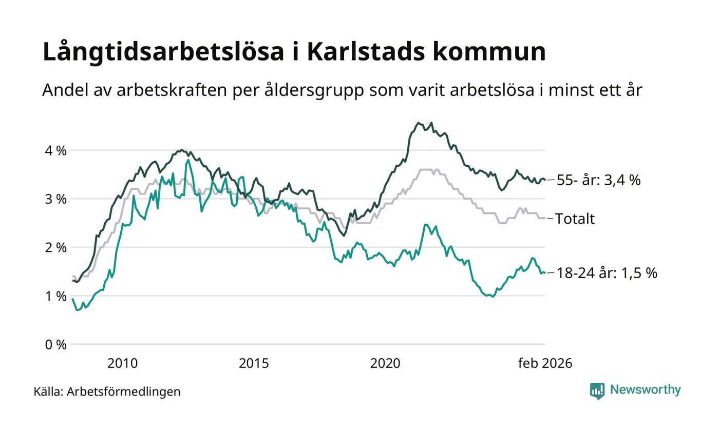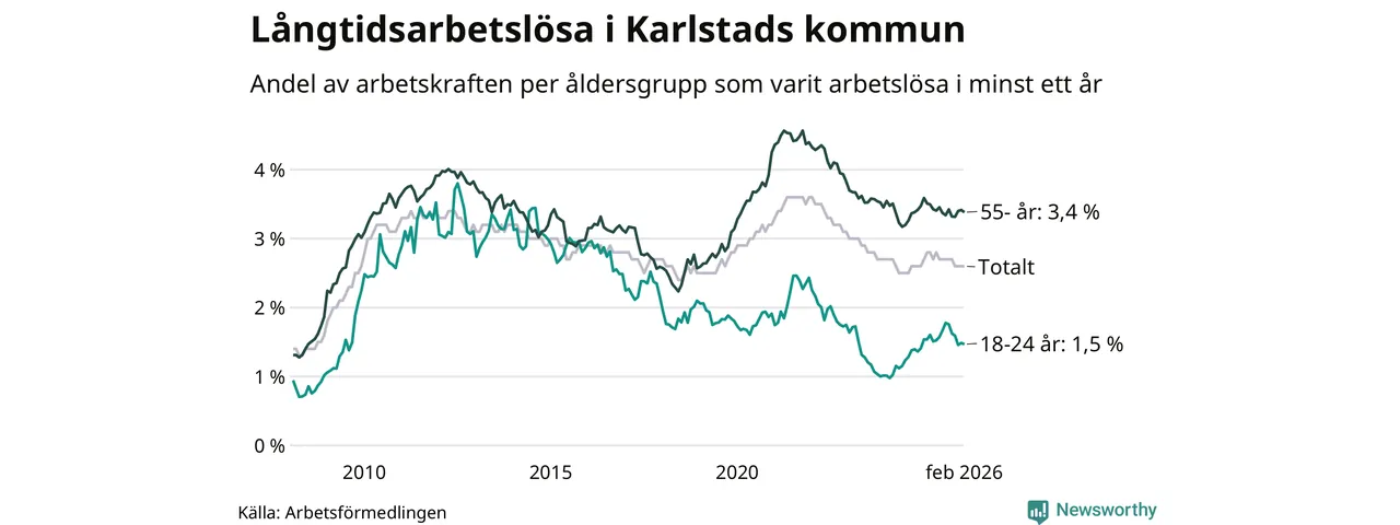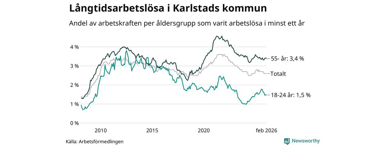 Av de 1 307 personerna som varit arbetslösa i mer än ett år i Karlstads kommun är 346 personer mellan 55 och 661 år och 93 är mellan 18 och 24 år. För den äldre gruppen är andelen arbetslösa 3,4 procent medan den i den yngre gruppen är 1,5 procent. Även i riket som helhet är långtidsarbetslösheten högre i gruppen äldre.