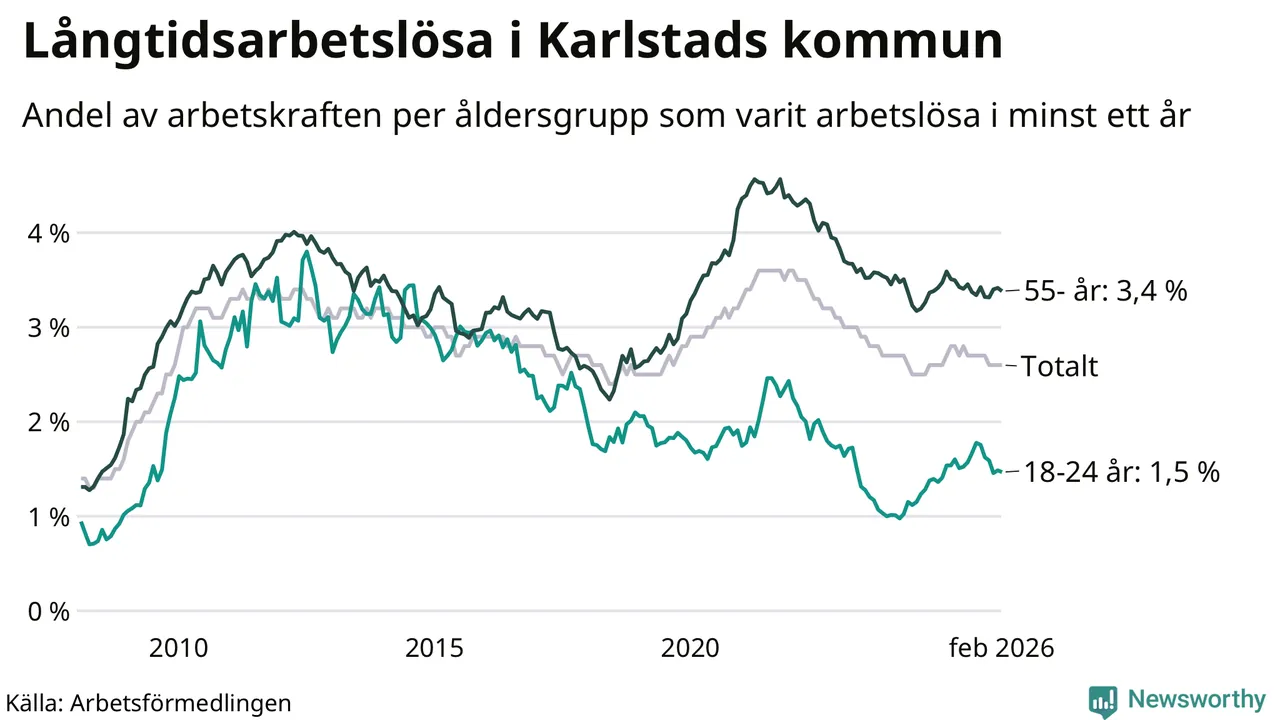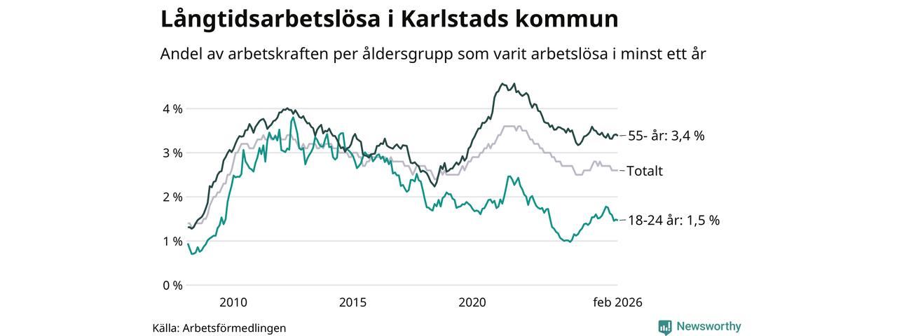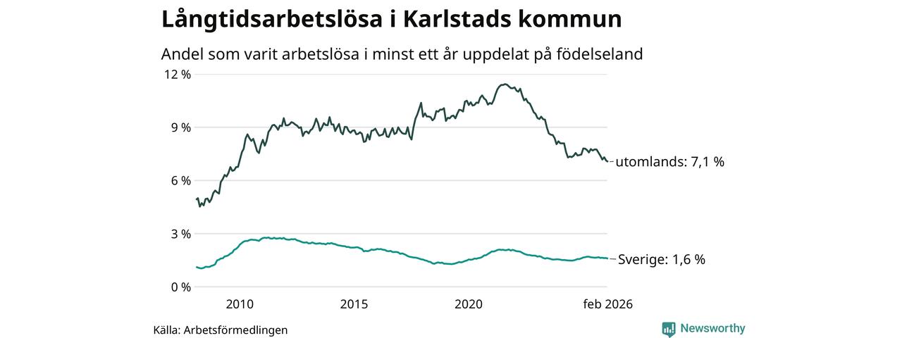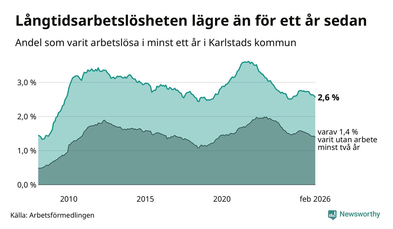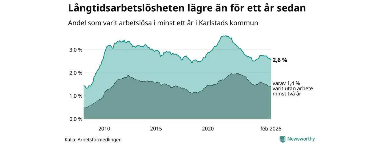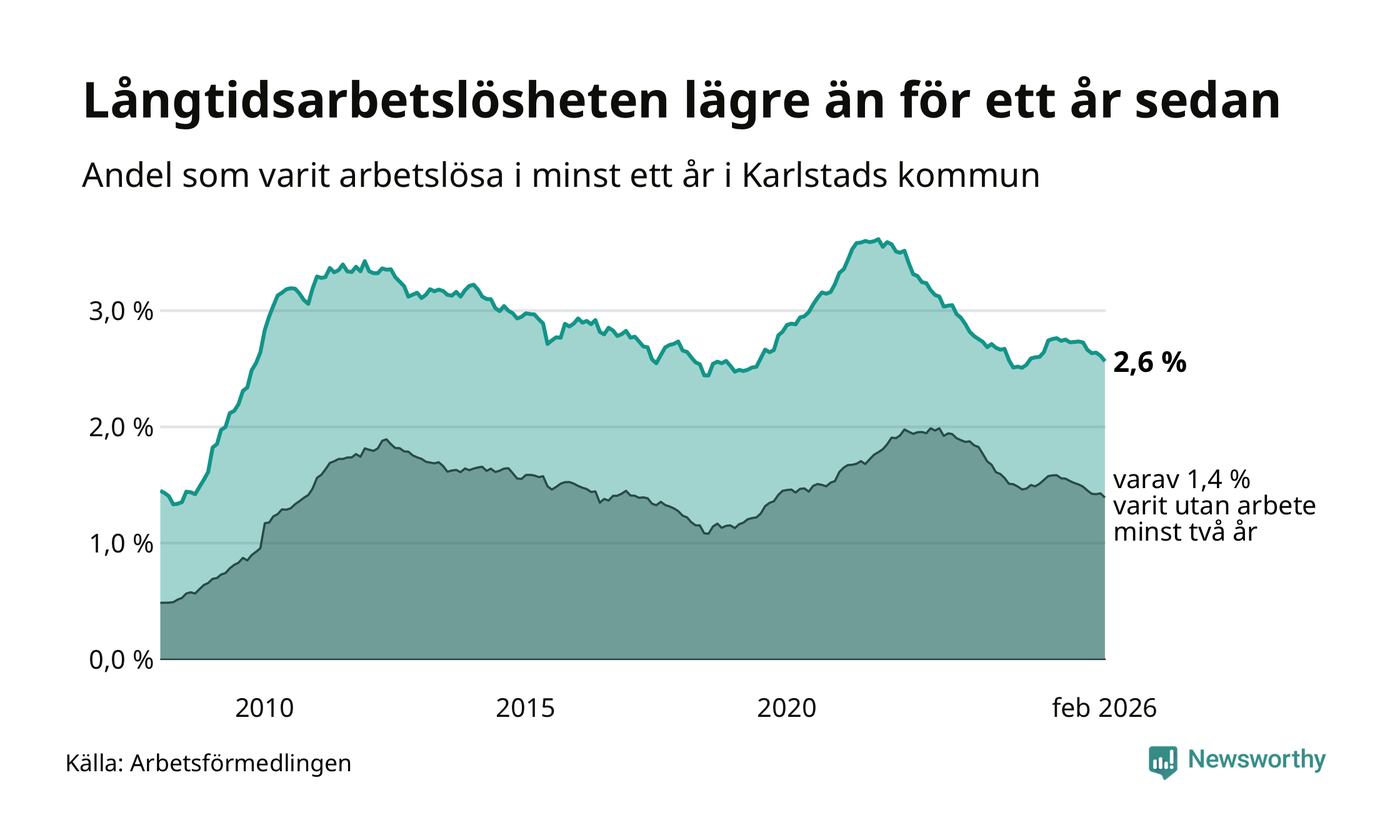 I februari hade 1 307 Karlstadsbor varit arbetslösa i minst ett år, vilket är 23 färre än månaden innan. 1 307 personer motsvarar 2,6 procent av arbetskraften i kommunen – andelen långtidsarbetslösa är 0,2 procentenheter lägre än samma månad för ett år sedan.