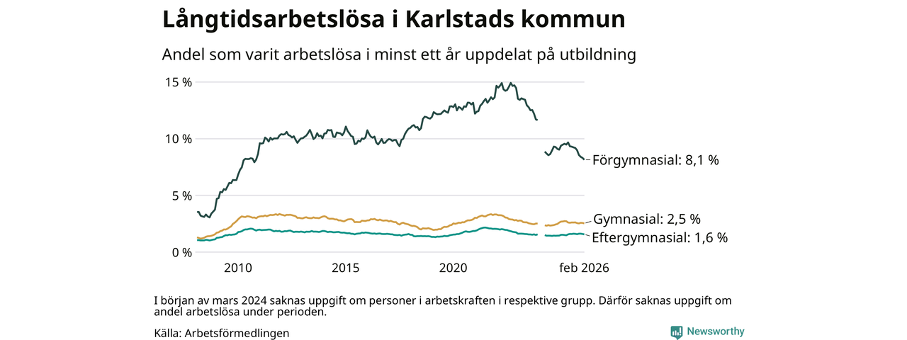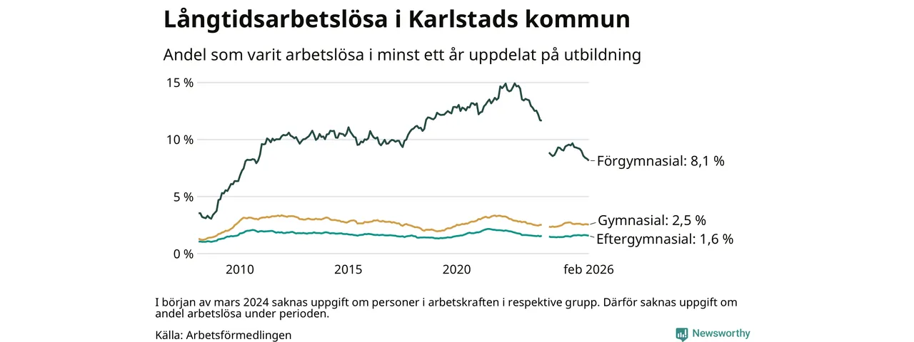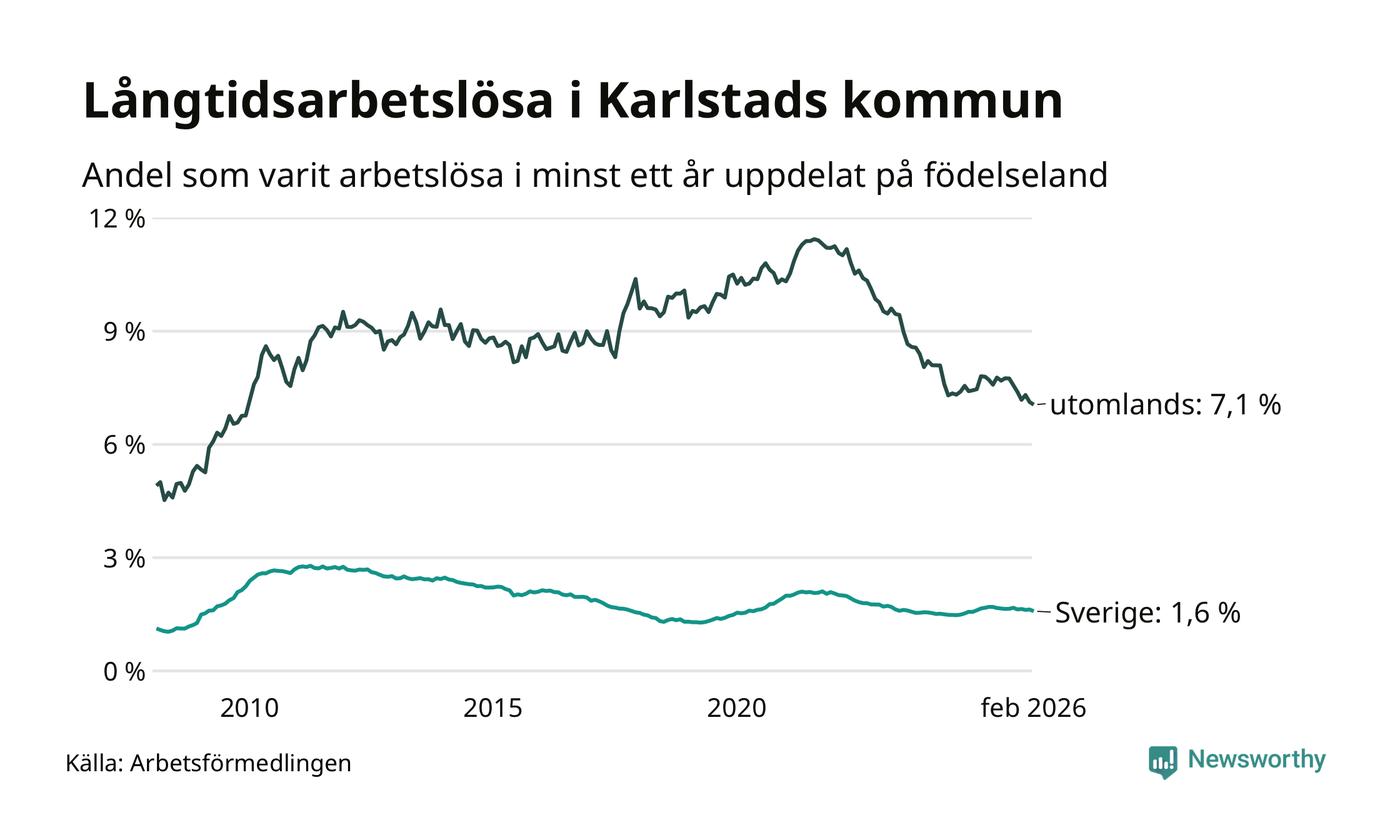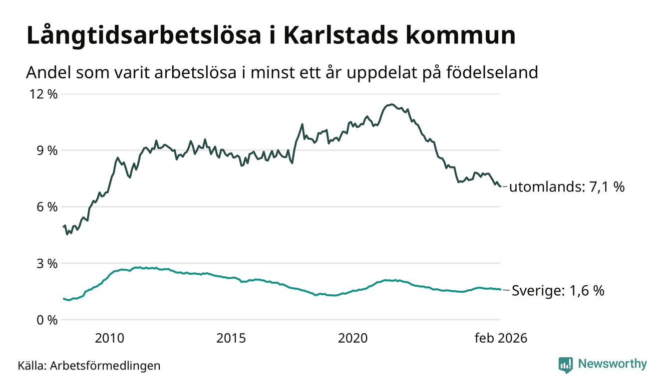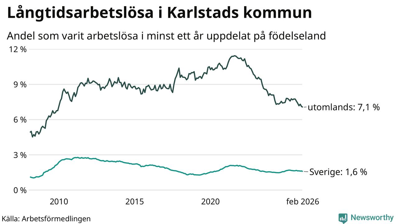 I februari hade 1 307 Karlstadsbor varit arbetslösa i minst ett år, vilket är 23 färre än månaden innan. 1 307 personer motsvarar 2,6 procent av arbetskraften i kommunen – andelen långtidsarbetslösa är 0,2 procentenheter lägre än samma månad för ett år sedan.