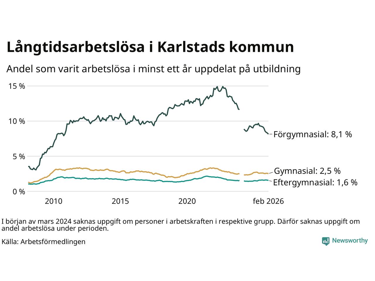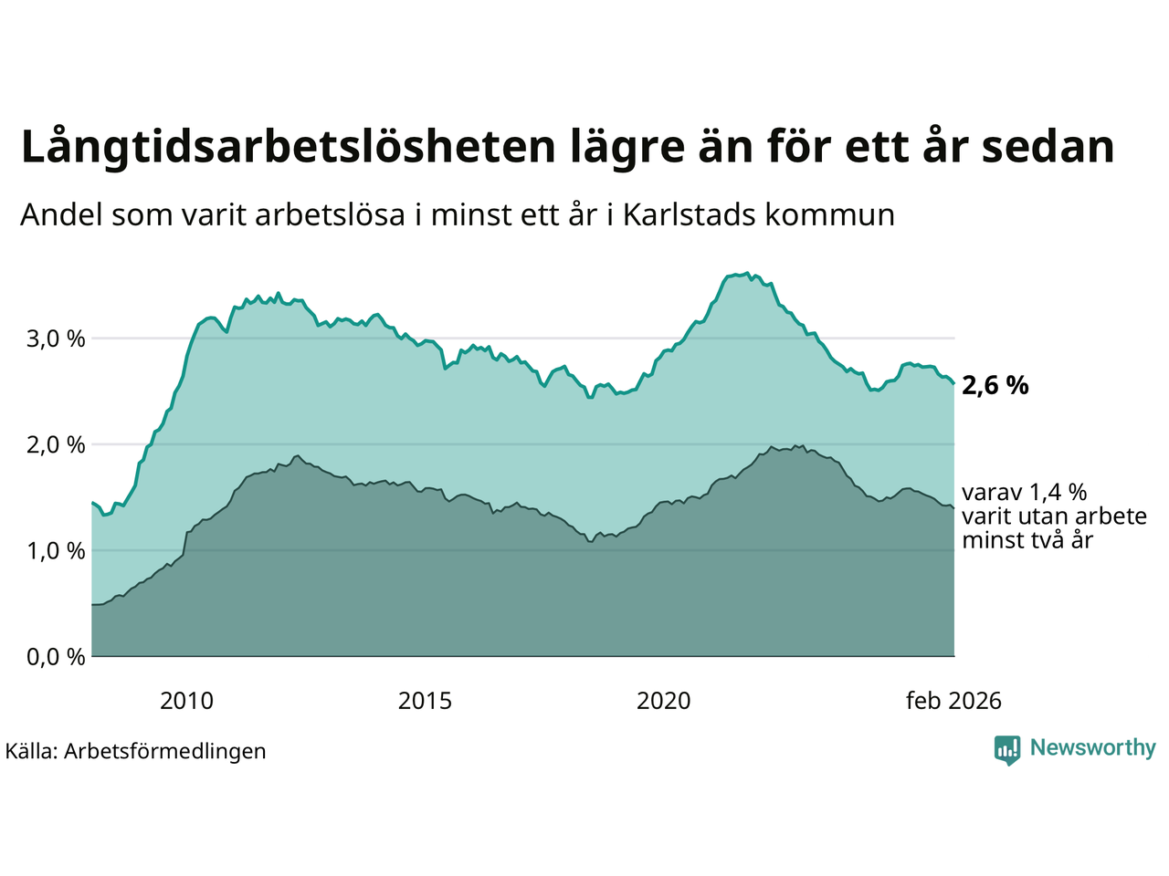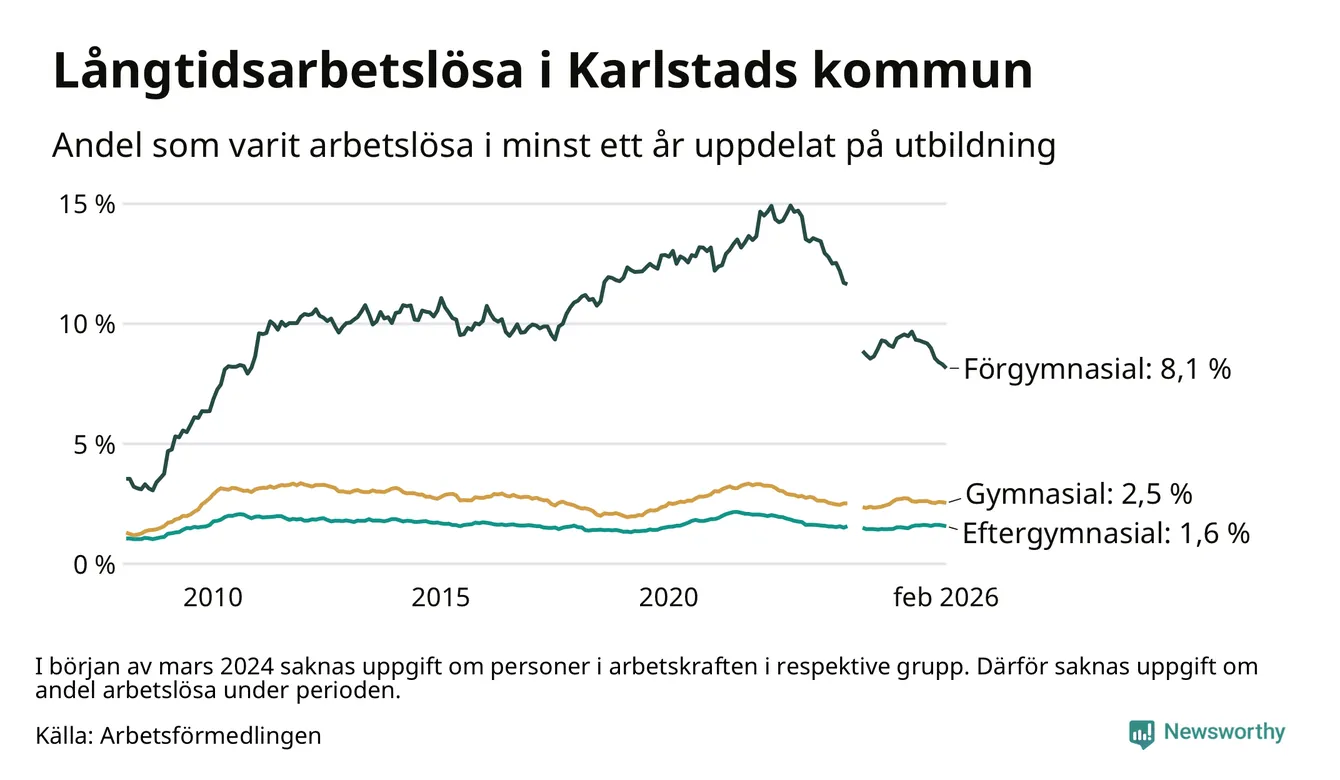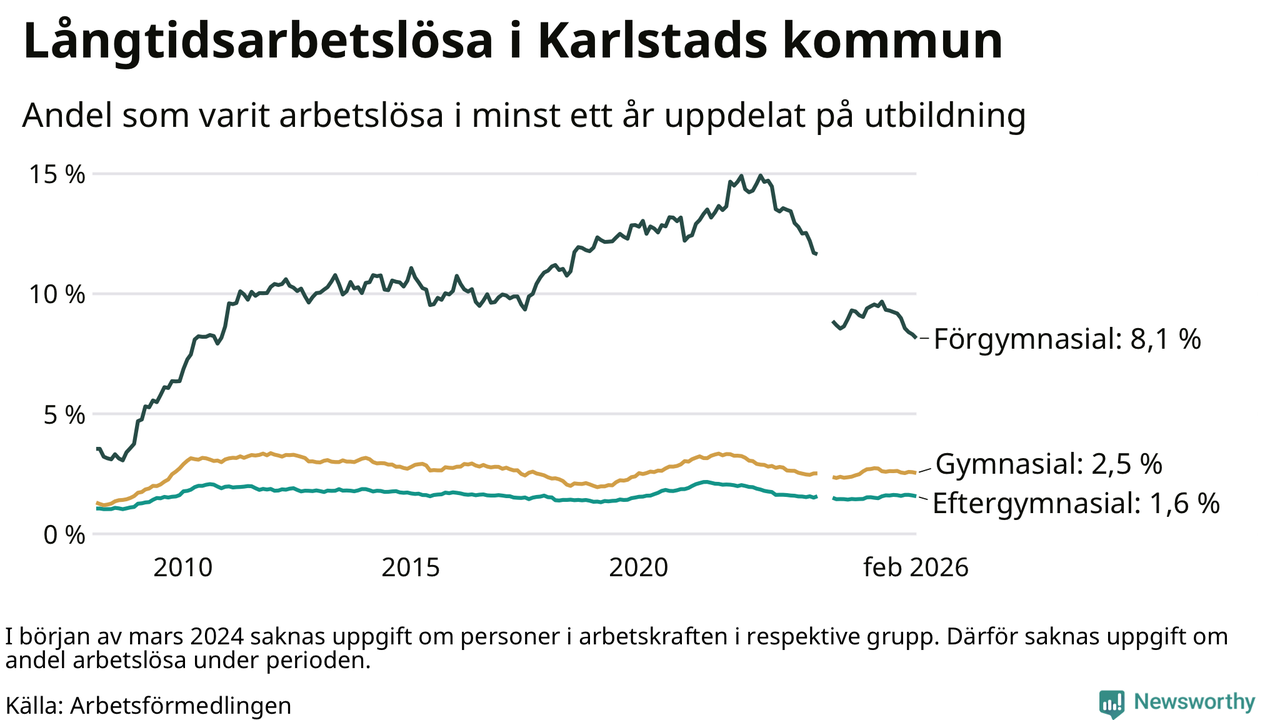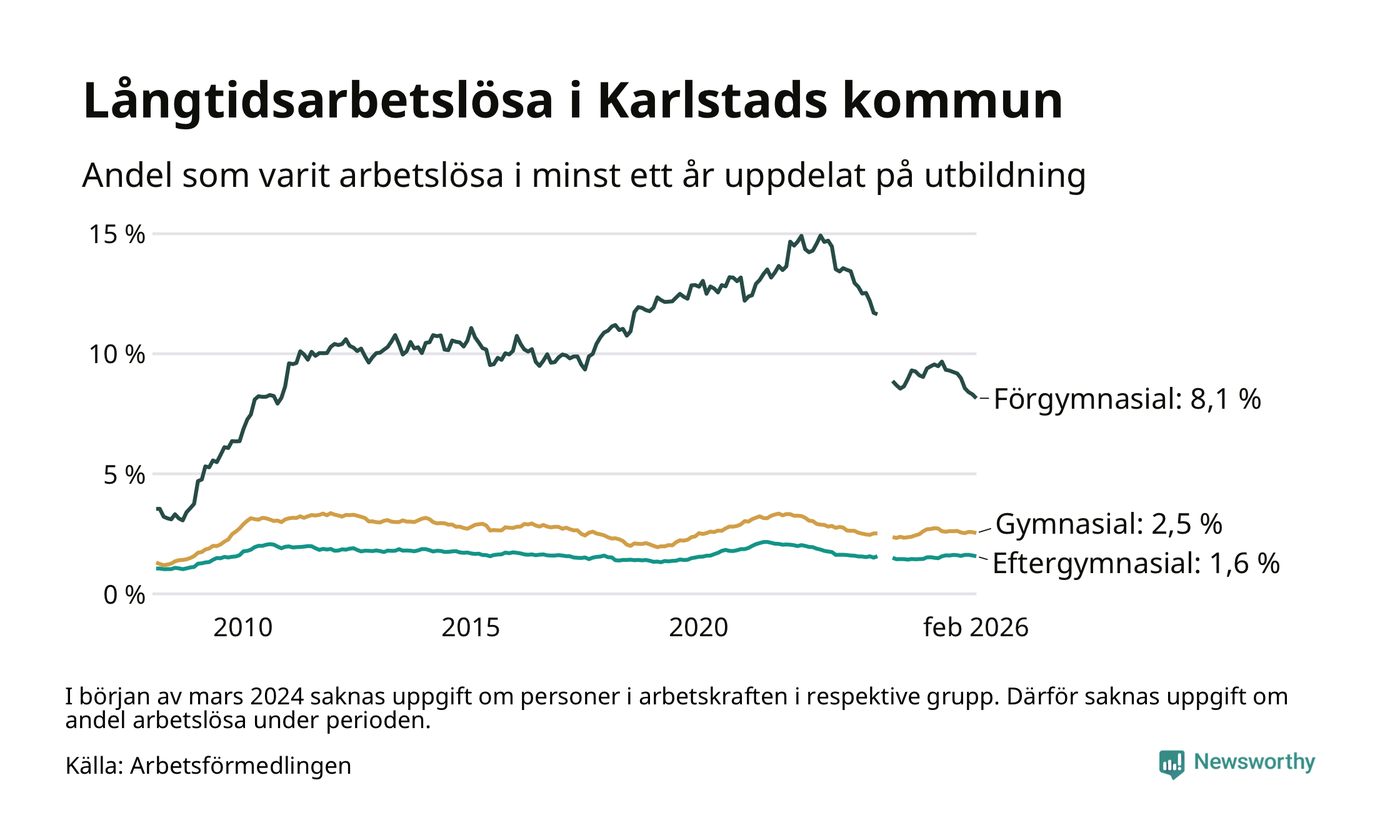 I februari hade 1 307 Karlstadsbor varit arbetslösa i minst ett år, vilket är 23 färre än månaden innan. 1 307 personer motsvarar 2,6 procent av arbetskraften i kommunen – andelen långtidsarbetslösa är 0,2 procentenheter lägre än samma månad för ett år sedan.
