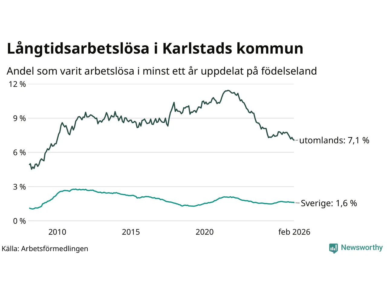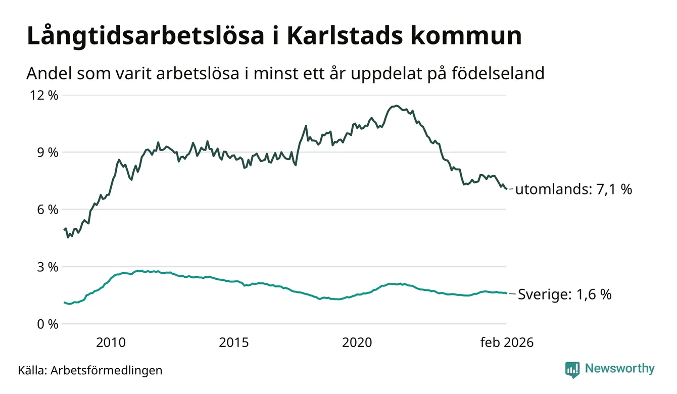 661 av de långtidsarbetslösa i Karlstad är födda i Sverige, medan 646 är födda utomlands. Det innebär att långtidsarbetslösheten bland Sverigefödda är 1,6 procent, medan den är fyra gånger så hög – 7,1 procent – bland födda utomlands. Även i riket som helhet är arbetslösheten högre bland utrikesfödda.