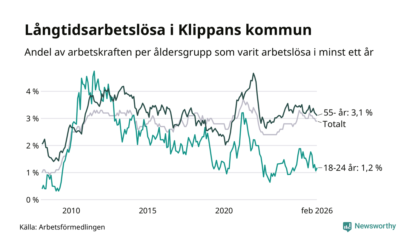 Av de 248 personerna som varit arbetslösa i mer än ett år i Klippans kommun är 62 personer mellan 55 och 661 år och tio är mellan 18 och 24 år. För den äldre gruppen är andelen arbetslösa 3,1 procent medan den i den yngre gruppen är 1,2 procent. Även i riket som helhet är långtidsarbetslösheten högre i gruppen äldre.
