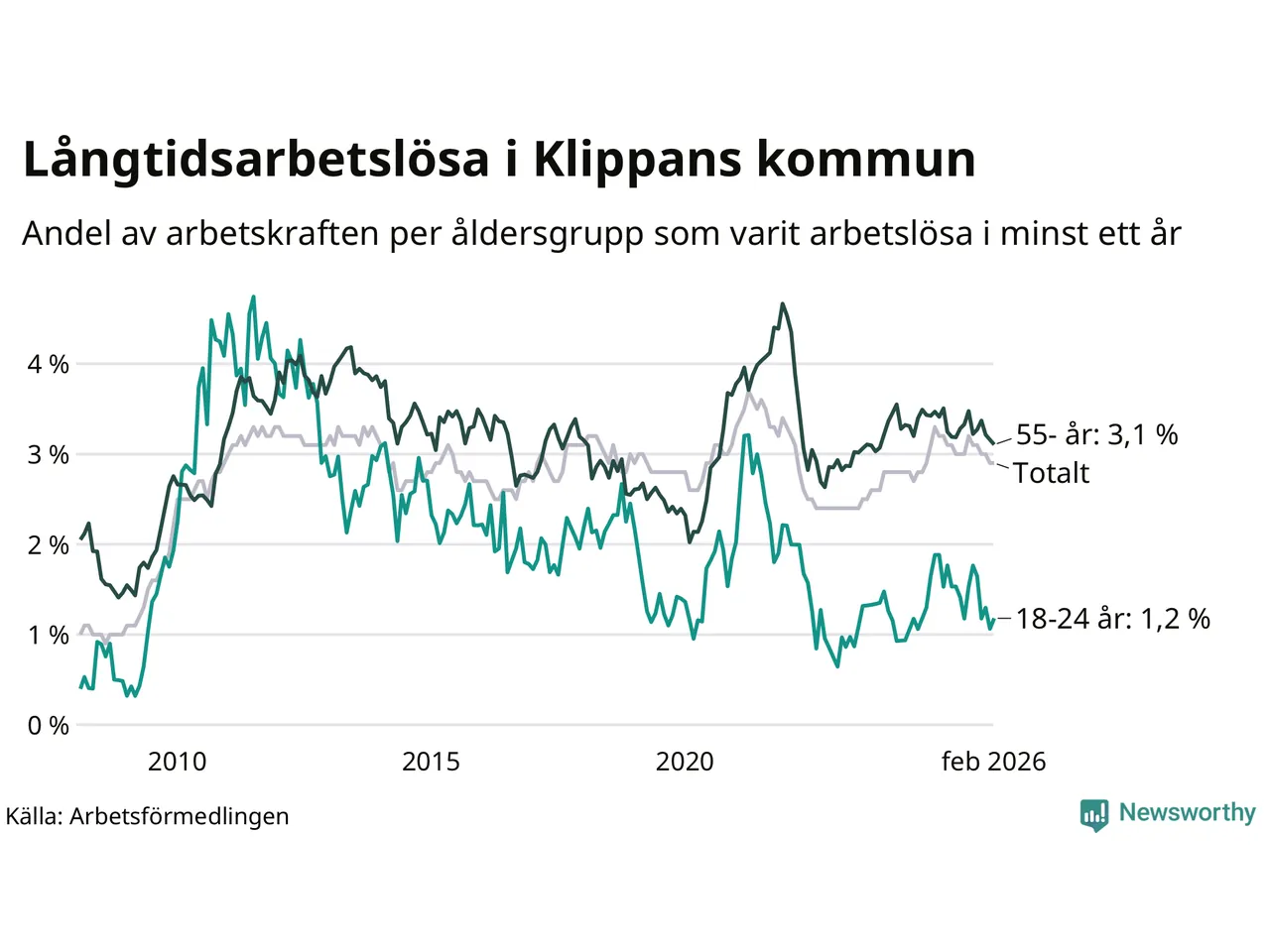 Graf: Andel arbetslösa uppdelat i åldersgrupper i Klippan