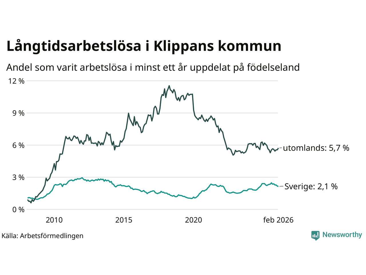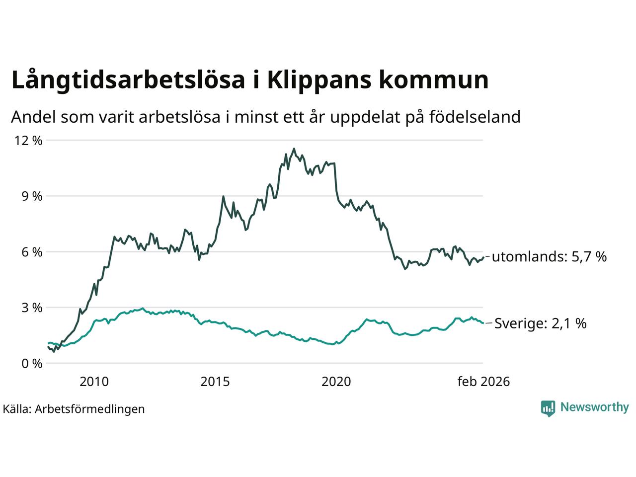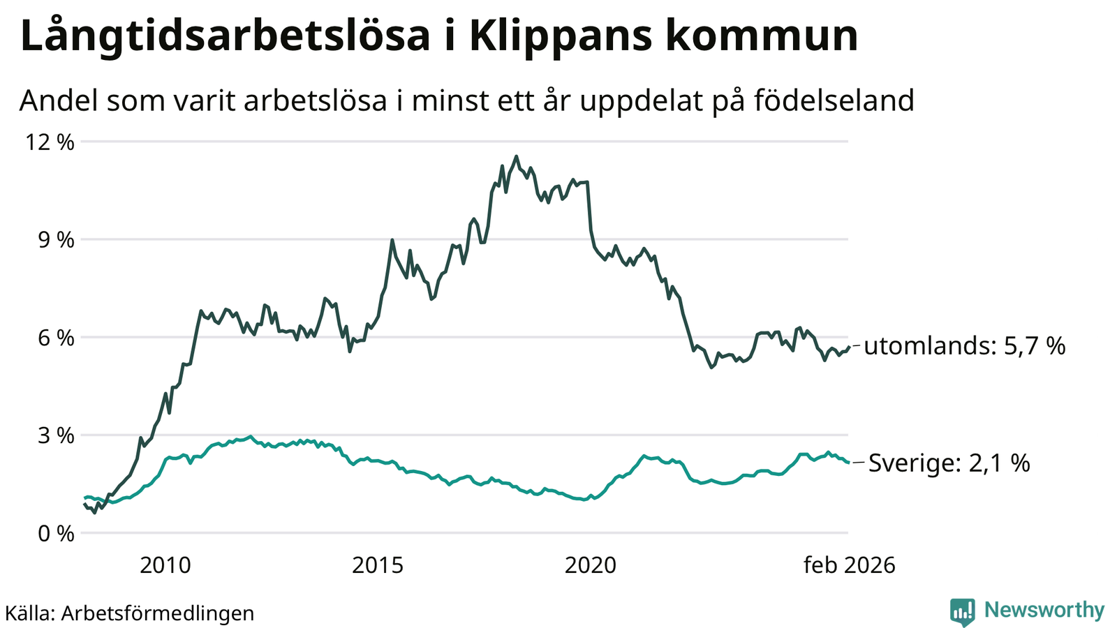 Graf: Andel arbetslösa uppdelat på födelseland i Klippan