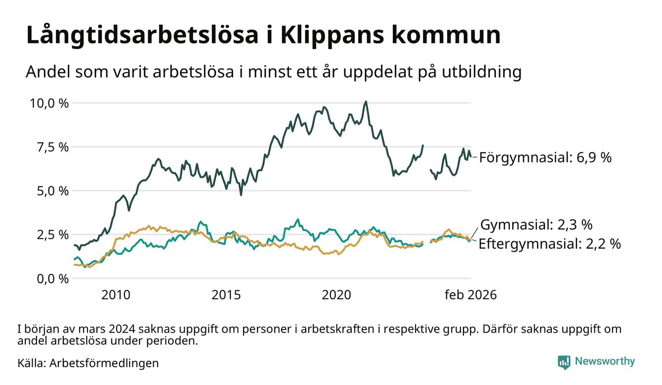 Andelen som varit utan arbete i minst ett år i Klippan var lägre i februari jämfört med samma månad för ett år sedan. Det visar Arbetsfömedlingens senaste månadsstatistik.