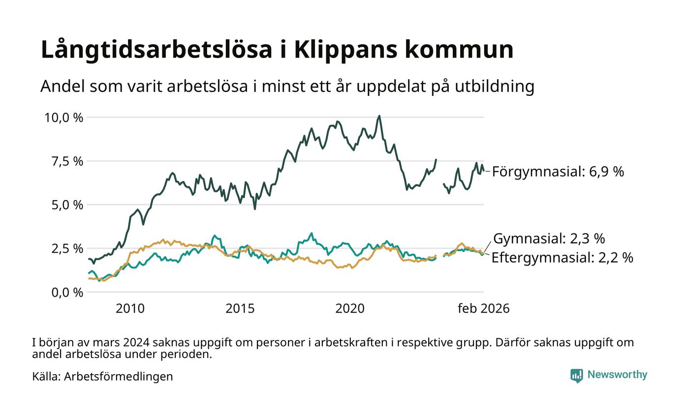 Graf: Andel arbetslösa i Klippan som varit utan arbete i minst 12 månader