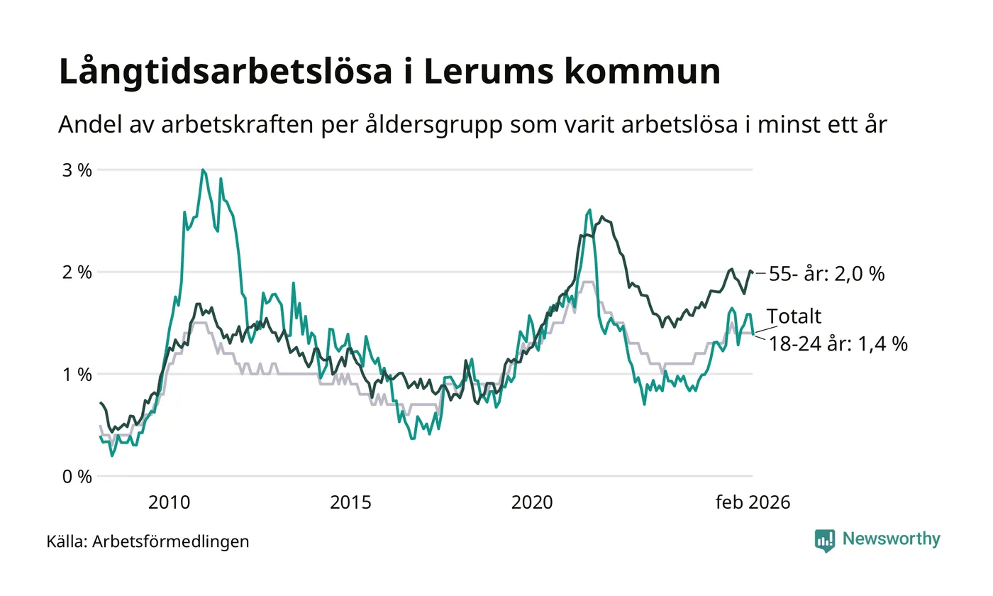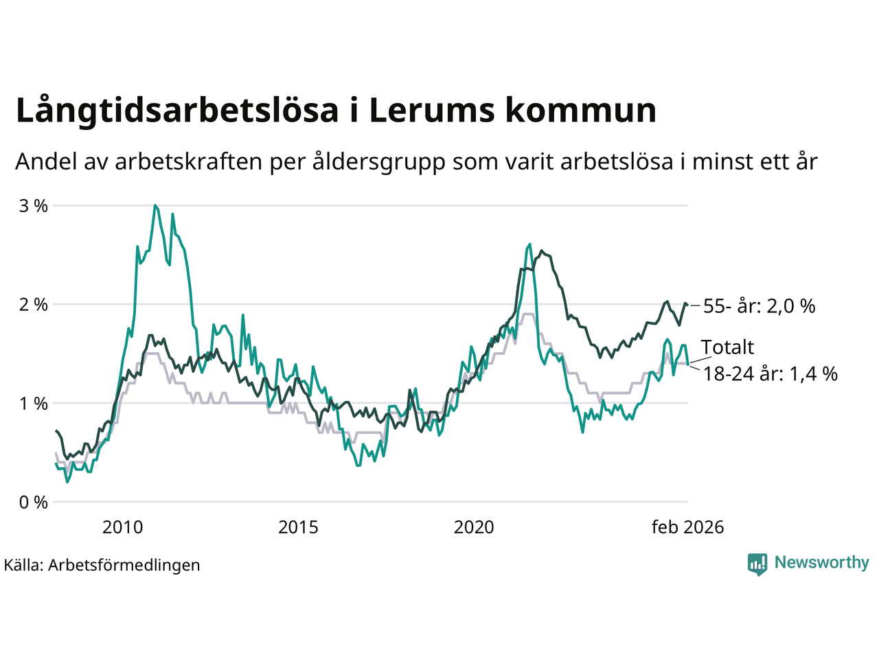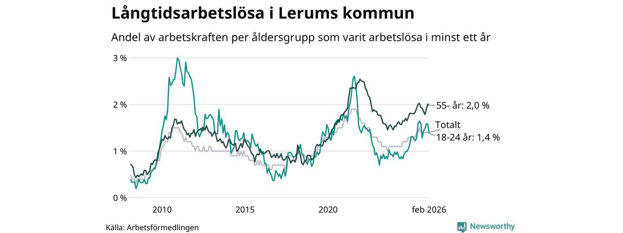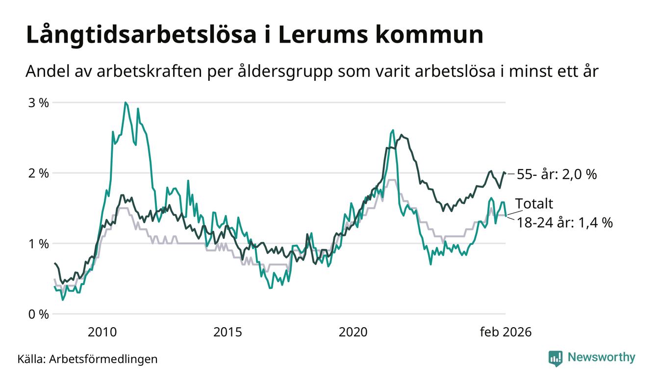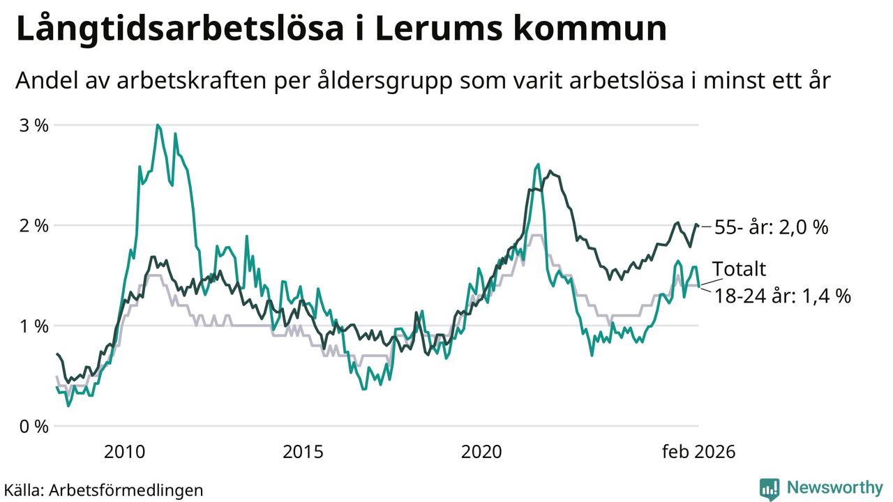 Av de 299 personerna som varit arbetslösa i mer än ett år i Lerums kommun är 95 personer mellan 55 och 661 år och 27 är mellan 18 och 24 år. För den äldre gruppen är andelen arbetslösa 2,0 procent medan den i den yngre gruppen är 1,4 procent. Även i riket som helhet är långtidsarbetslösheten högre i gruppen äldre.
