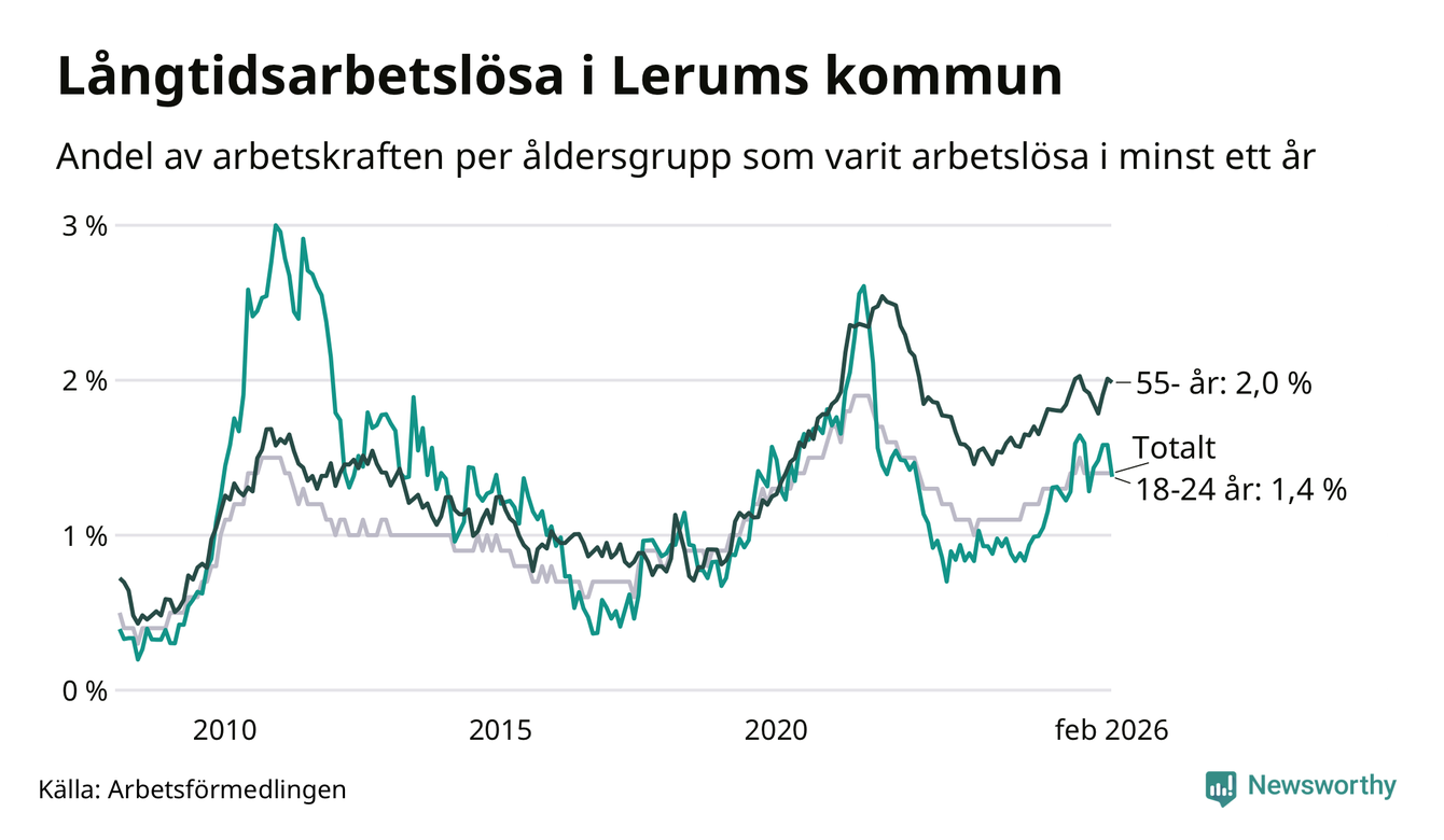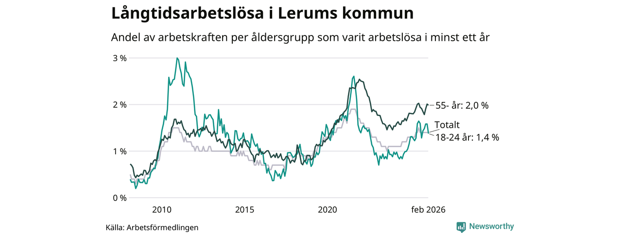 I februari hade 299 Lerumsbor varit arbetslösa i minst ett år, vilket är sex färre än månaden innan. 299 personer motsvarar 1,4 procent av arbetskraften i kommunen – andelen långtidsarbetslösa är ungefär på samma nivå som för ett år sedan.