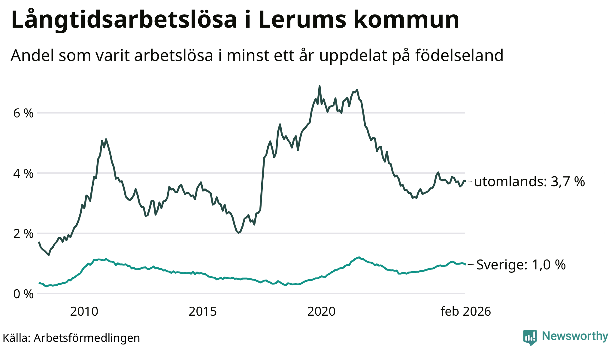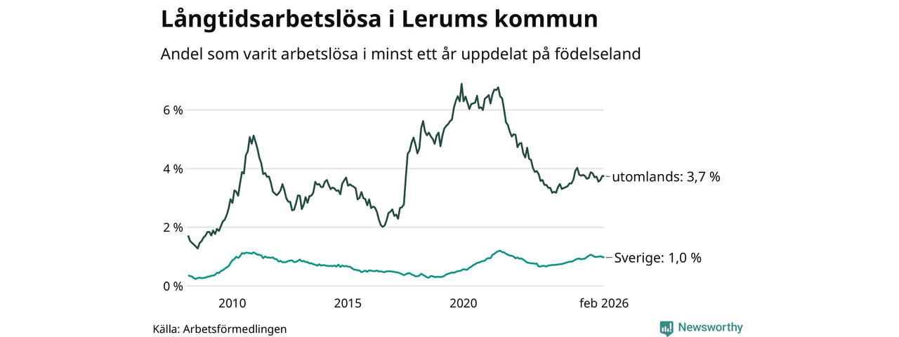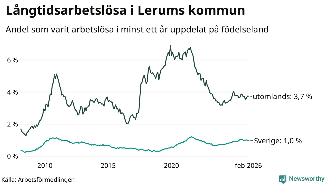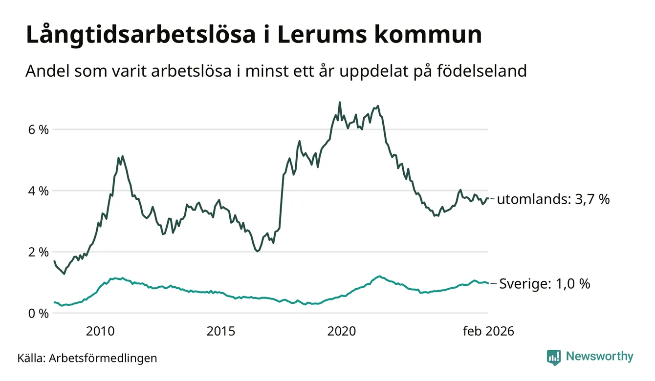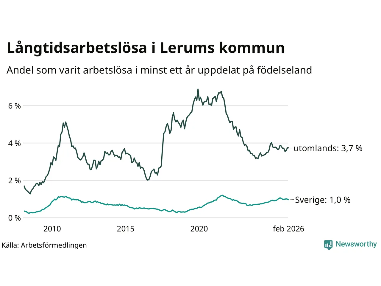 183 av de långtidsarbetslösa i Lerum är födda i Sverige, medan 116 är födda utomlands. Det innebär att långtidsarbetslösheten bland Sverigefödda är 1,0 procent, medan den är fyra gånger så hög – 3,7 procent – bland födda utomlands. Även i riket som helhet är arbetslösheten högre bland utrikesfödda.
