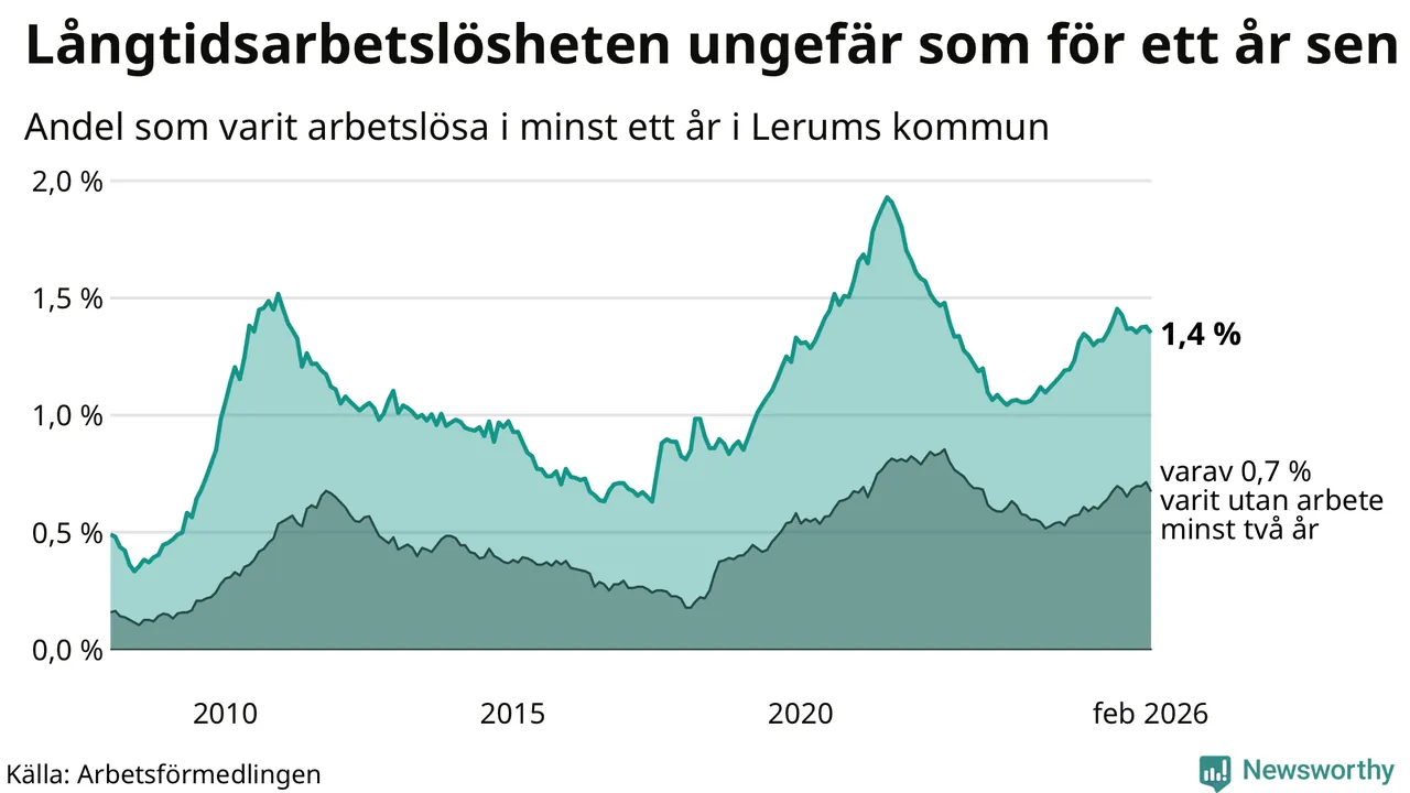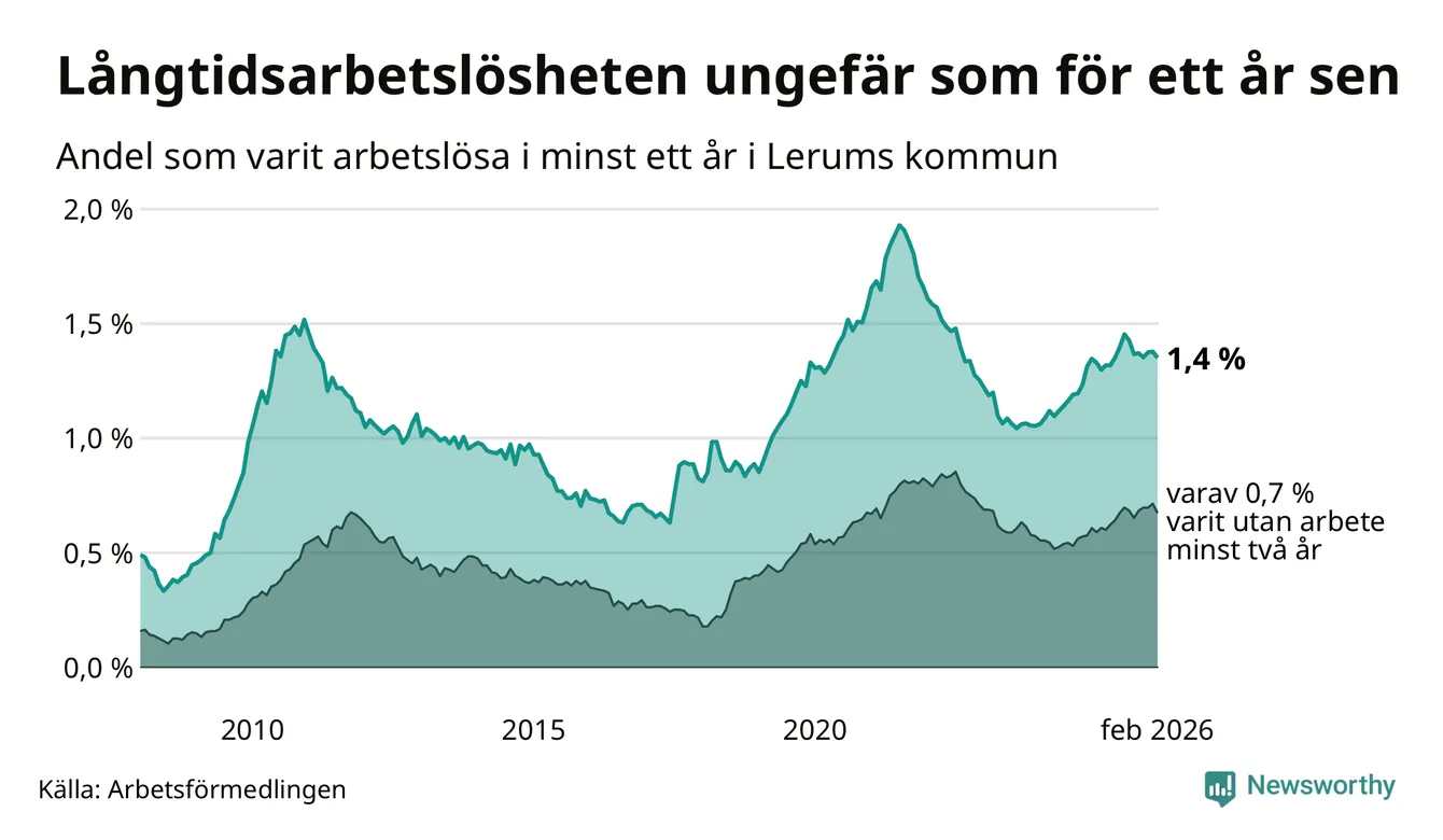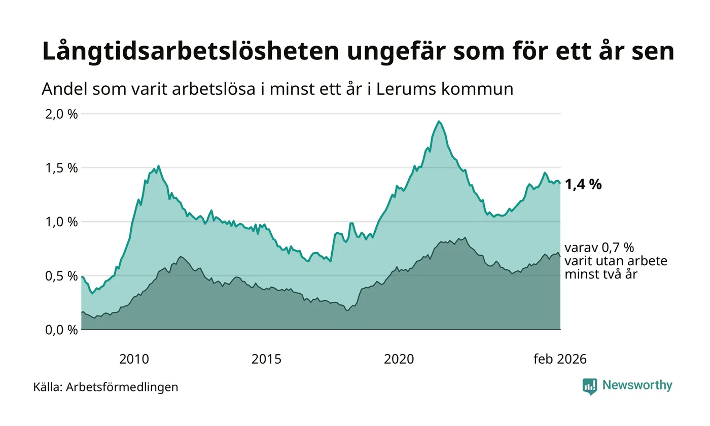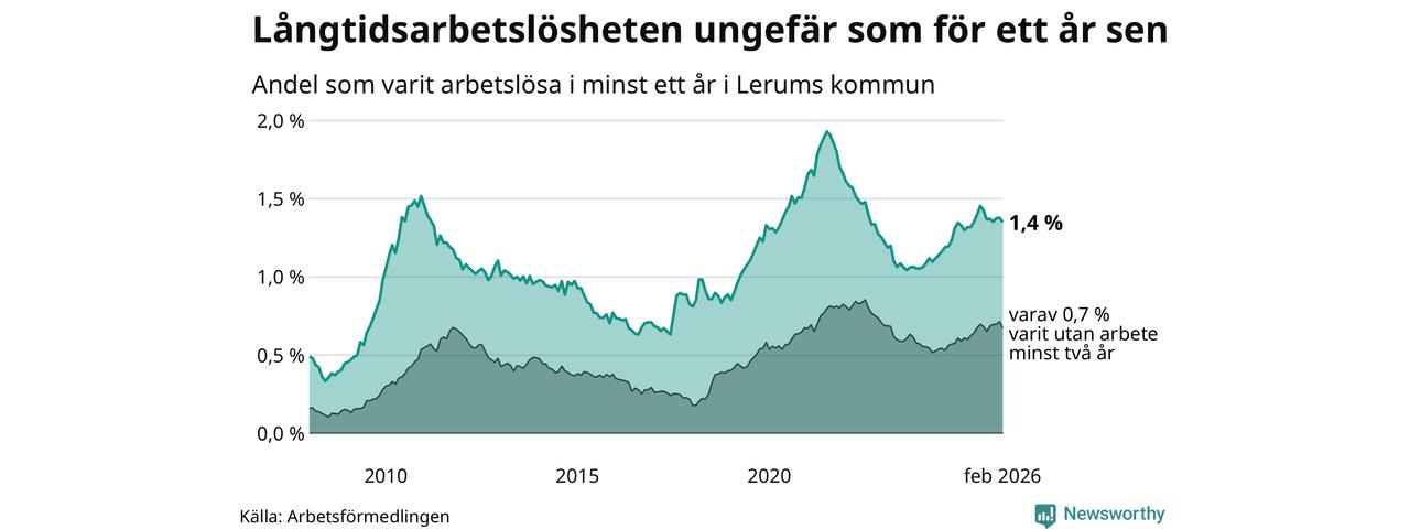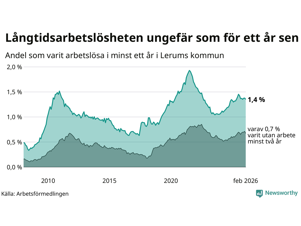 Andelen som varit utan arbete i minst ett år i Lerum var ungefär lika stor i februari jämfört med samma månad för ett år sedan. Det visar Arbetsfömedlingens senaste månadsstatistik.