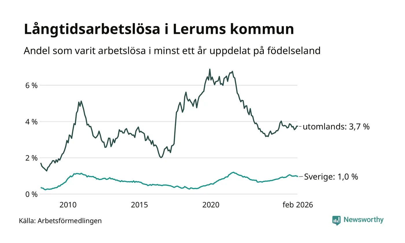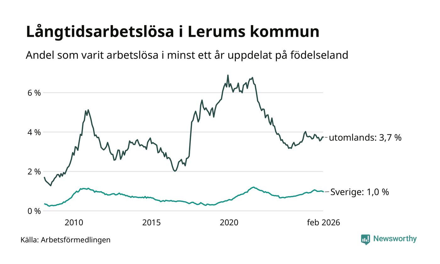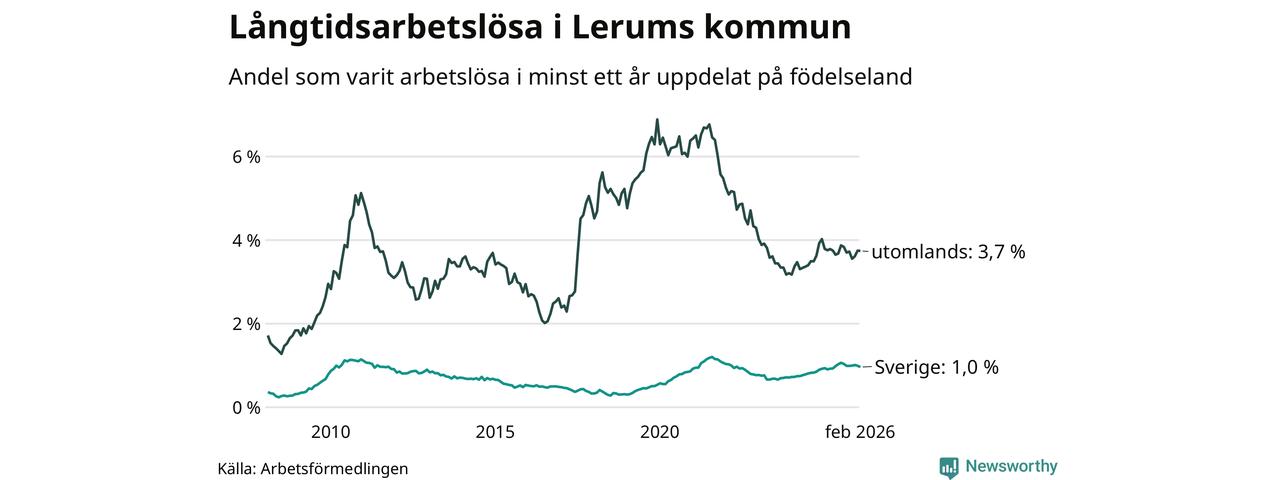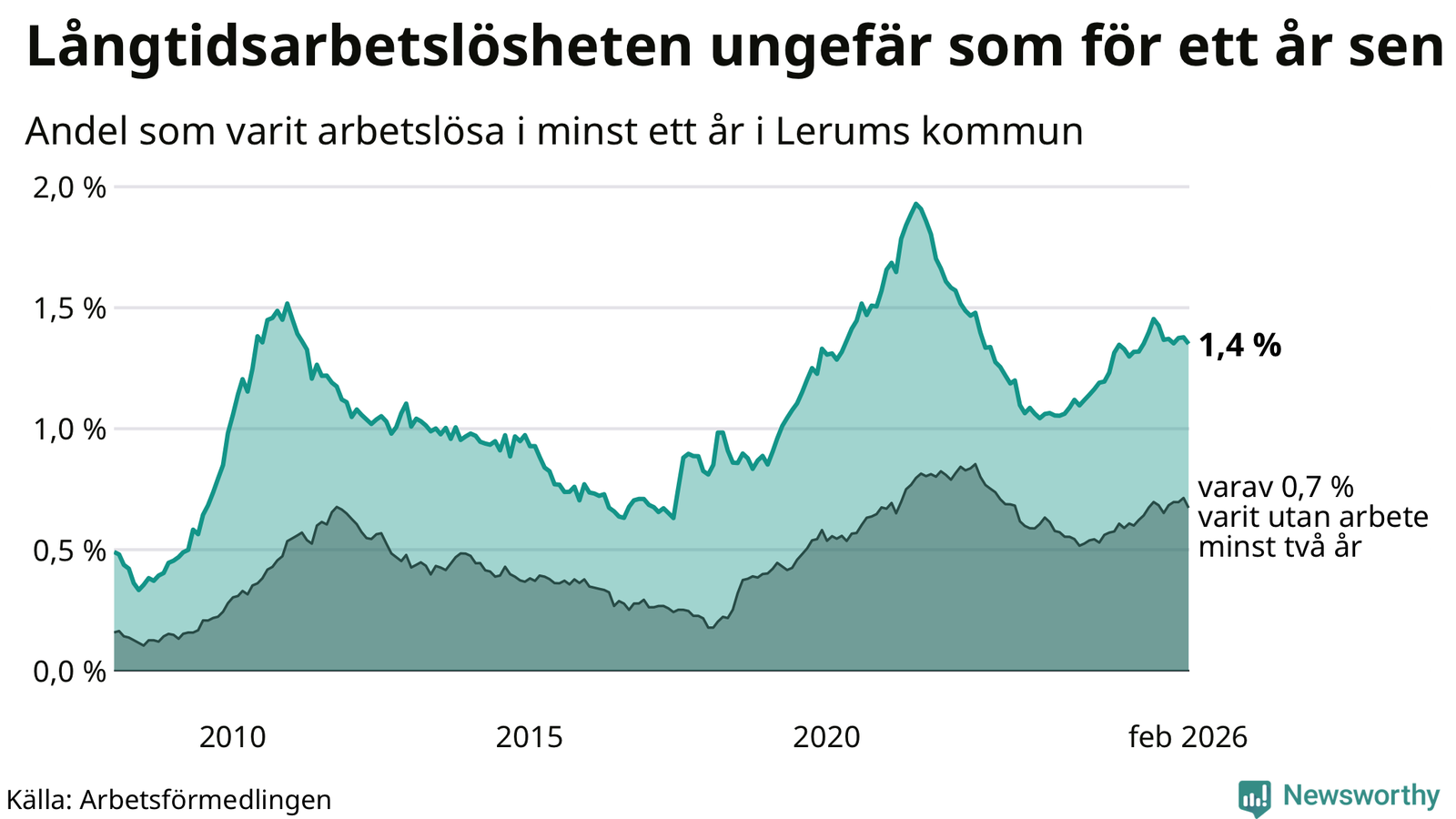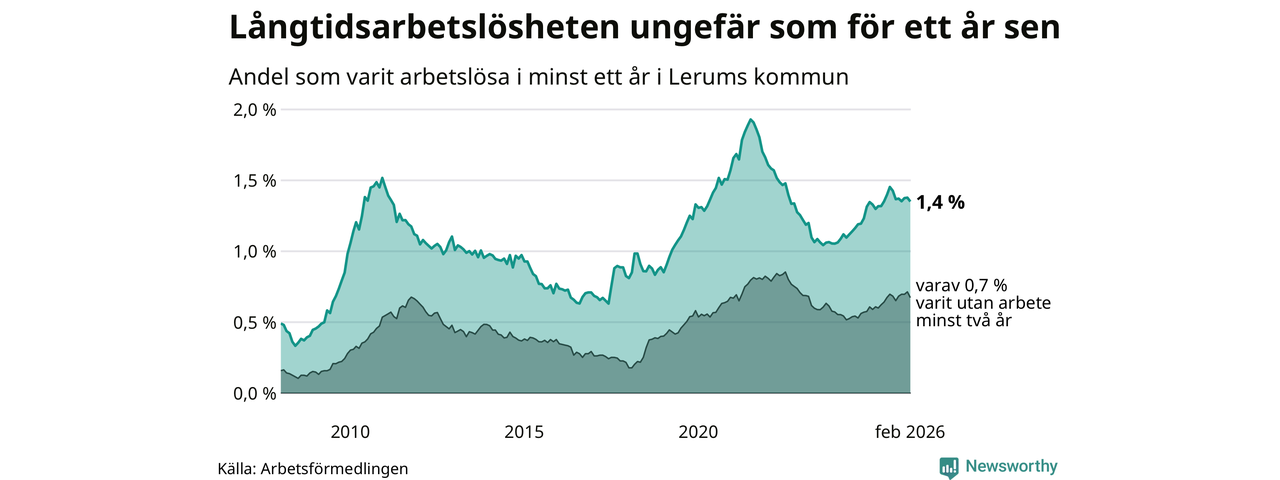 Andelen som varit utan arbete i minst ett år i Lerum var ungefär lika stor i februari jämfört med samma månad för ett år sedan. Det visar Arbetsfömedlingens senaste månadsstatistik.