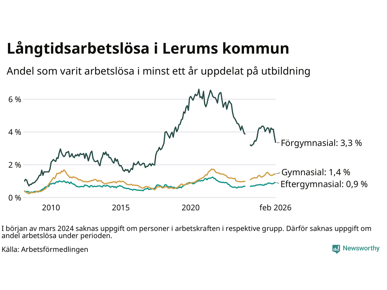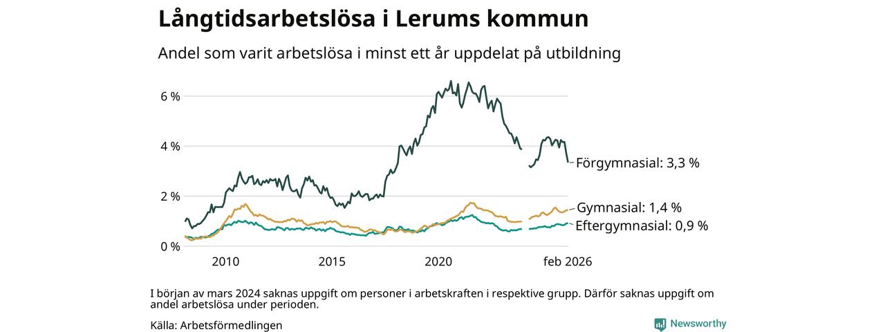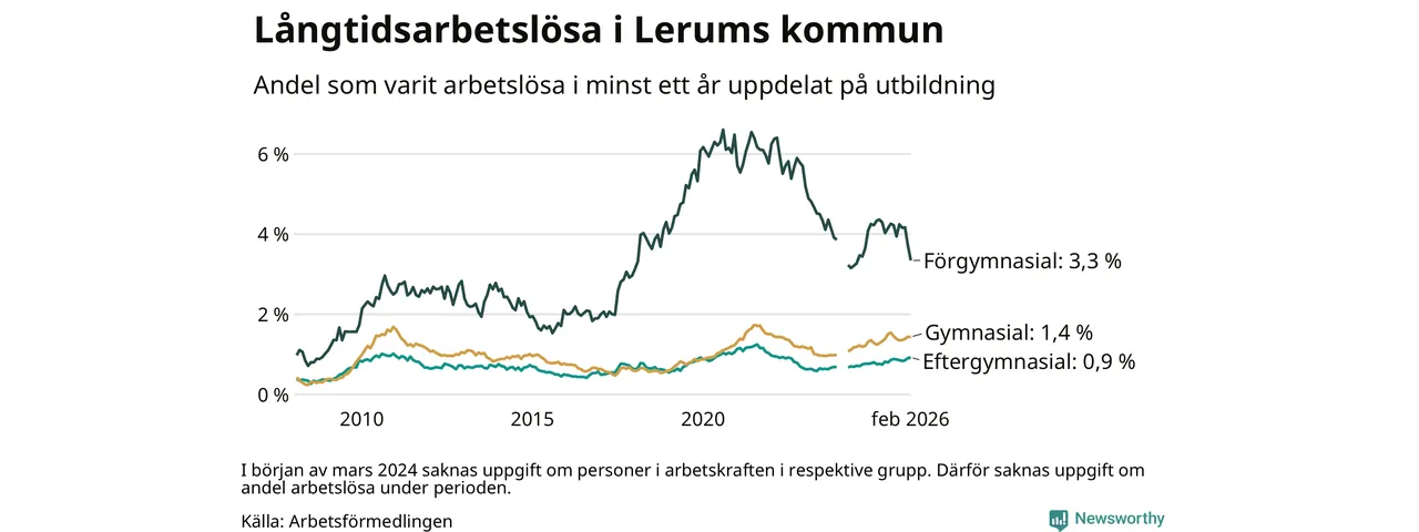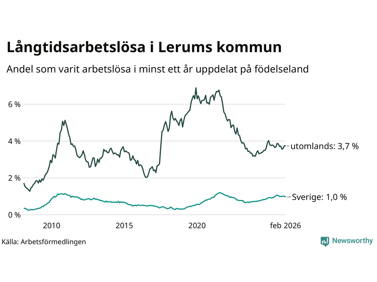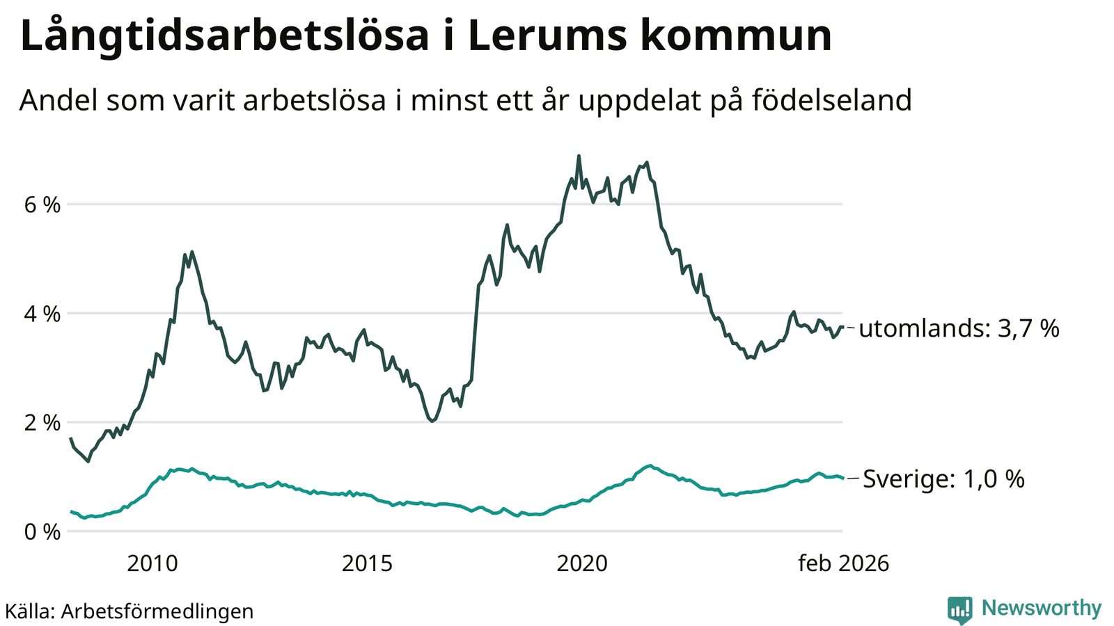 Andelen som varit utan arbete i minst ett år i Lerum var ungefär lika stor i februari jämfört med samma månad för ett år sedan. Det visar Arbetsfömedlingens senaste månadsstatistik.