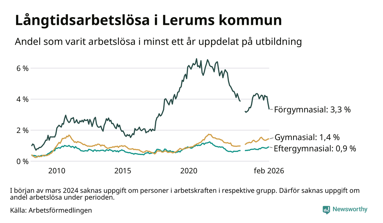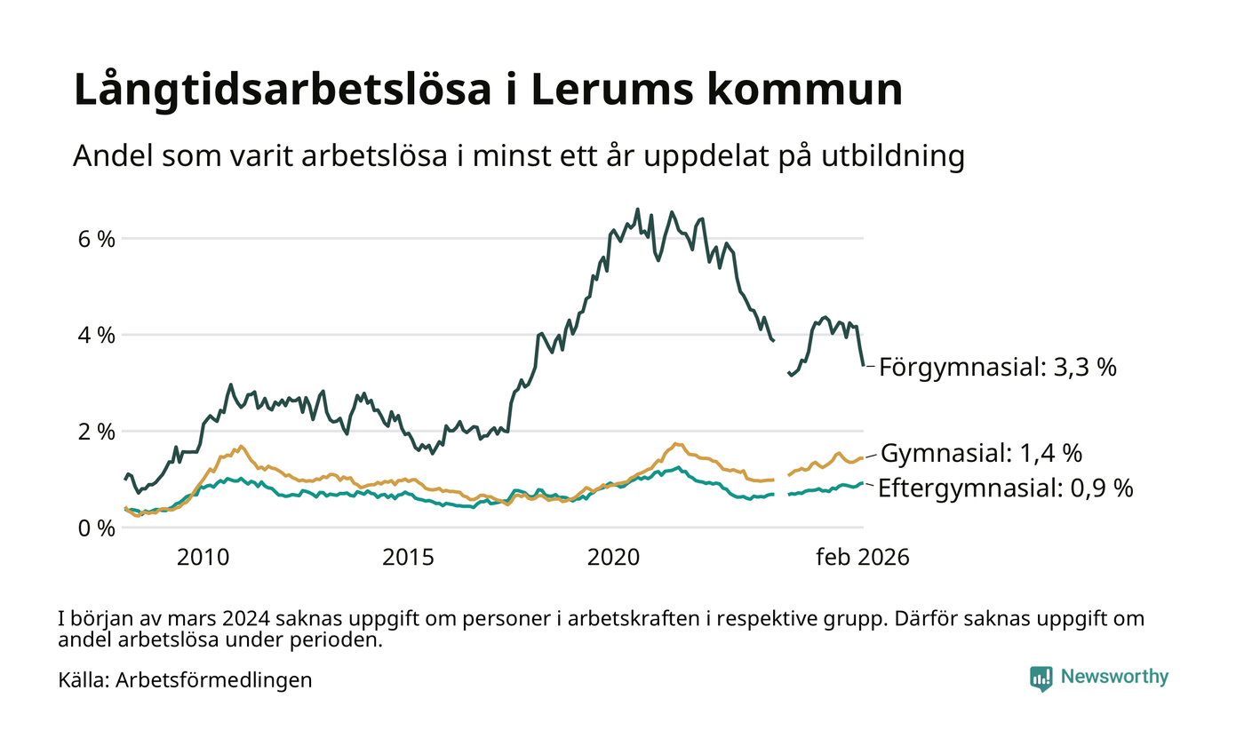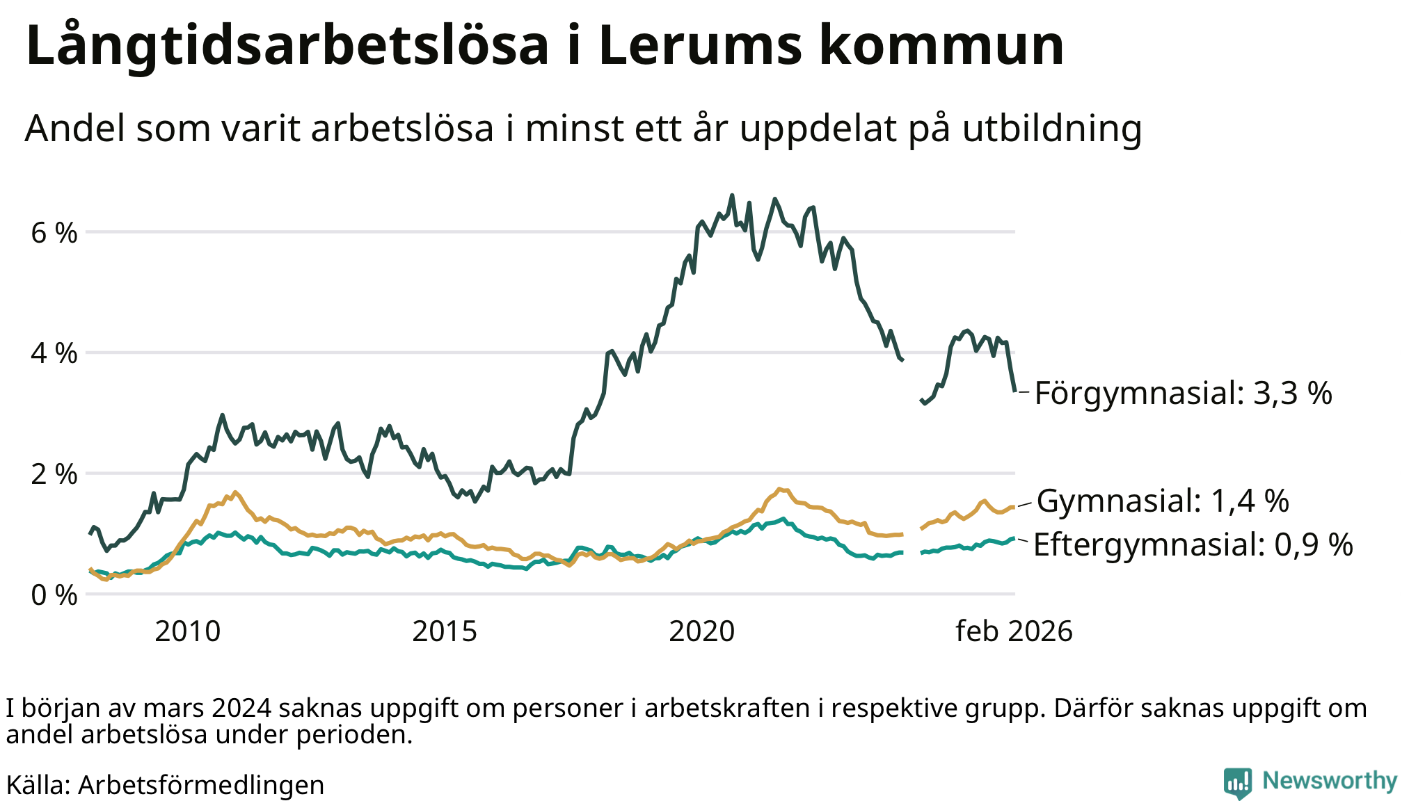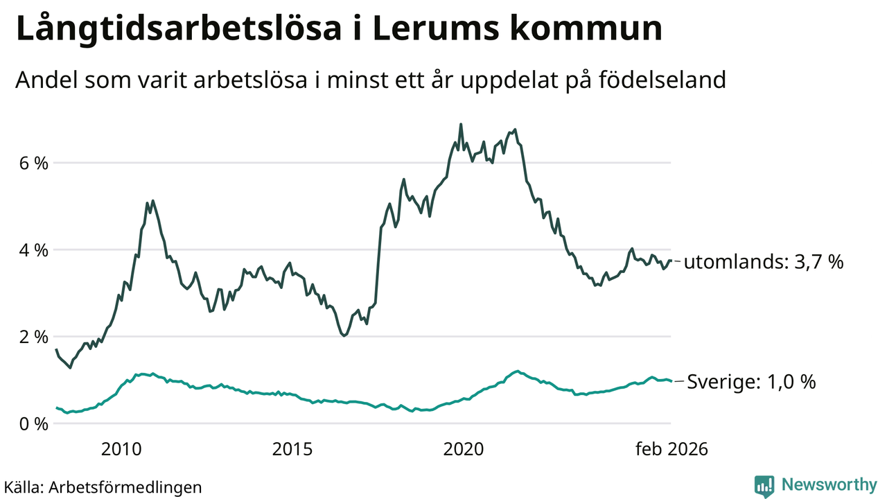 Andelen som varit utan arbete i minst ett år i Lerum var ungefär lika stor i februari jämfört med samma månad för ett år sedan. Det visar Arbetsfömedlingens senaste månadsstatistik.