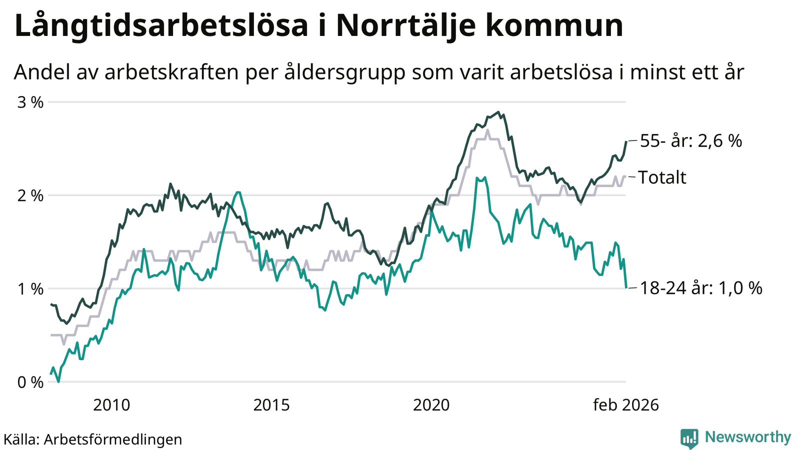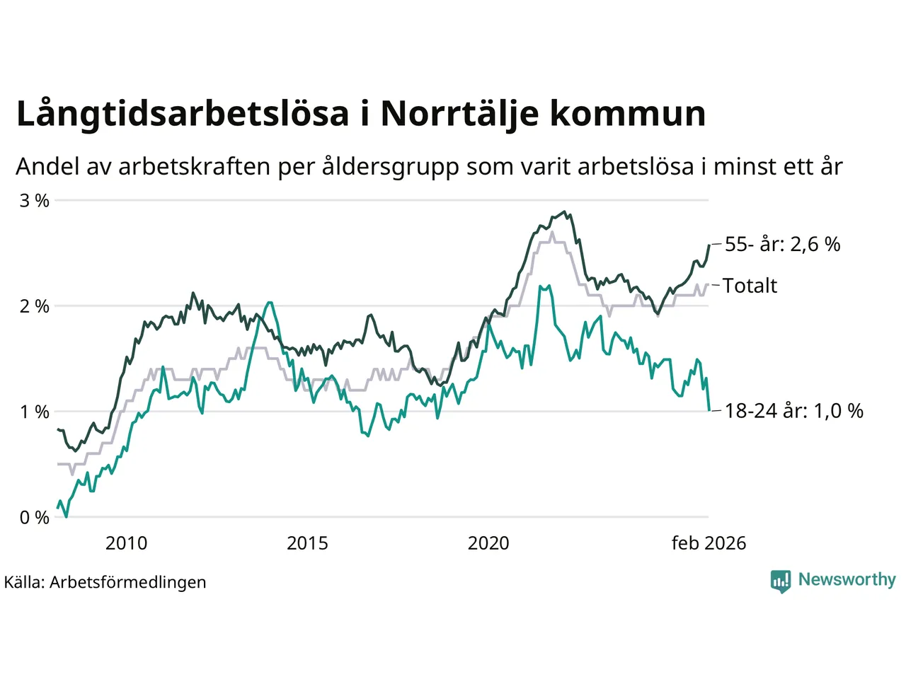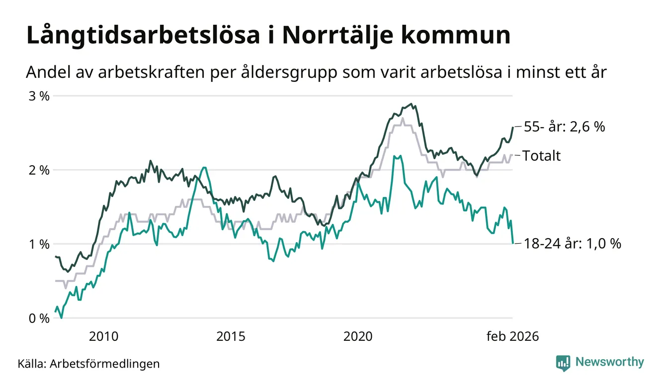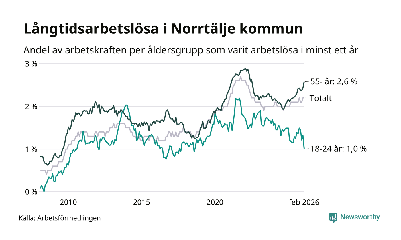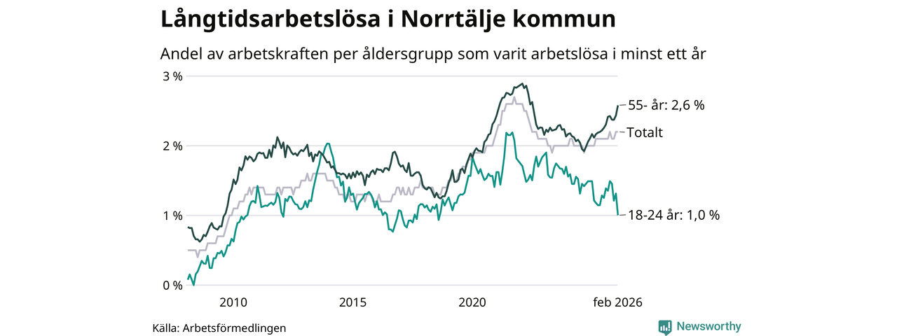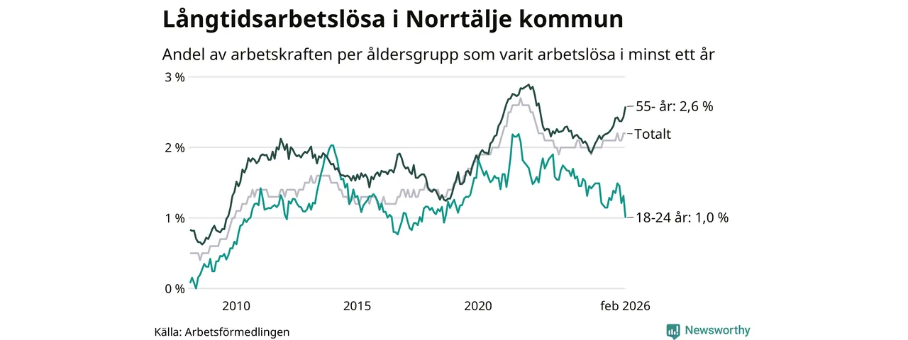 Av de 683 personerna som varit arbetslösa i mer än ett år i Norrtälje kommun är 206 personer mellan 55 och 661 år och 29 är mellan 18 och 24 år. För den äldre gruppen är andelen arbetslösa 2,6 procent medan den i den yngre gruppen är 1,0 procent. Även i riket som helhet är långtidsarbetslösheten högre i gruppen äldre.