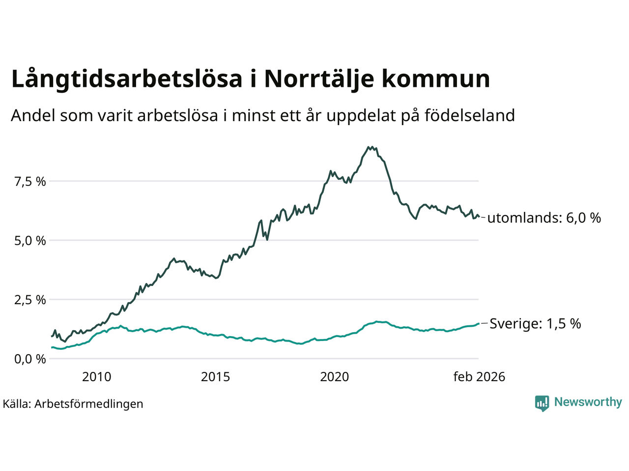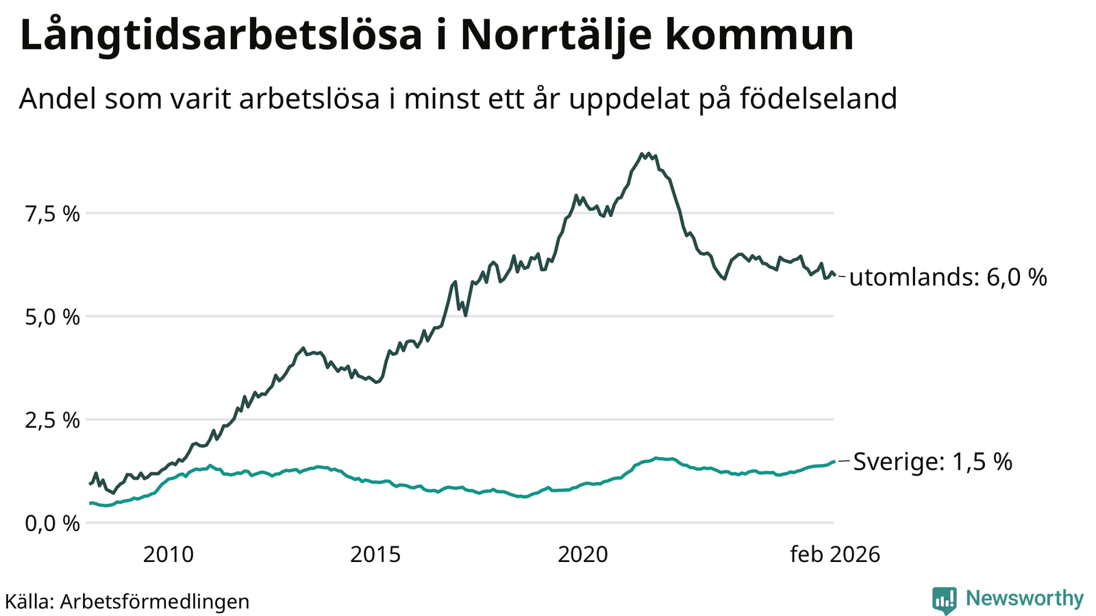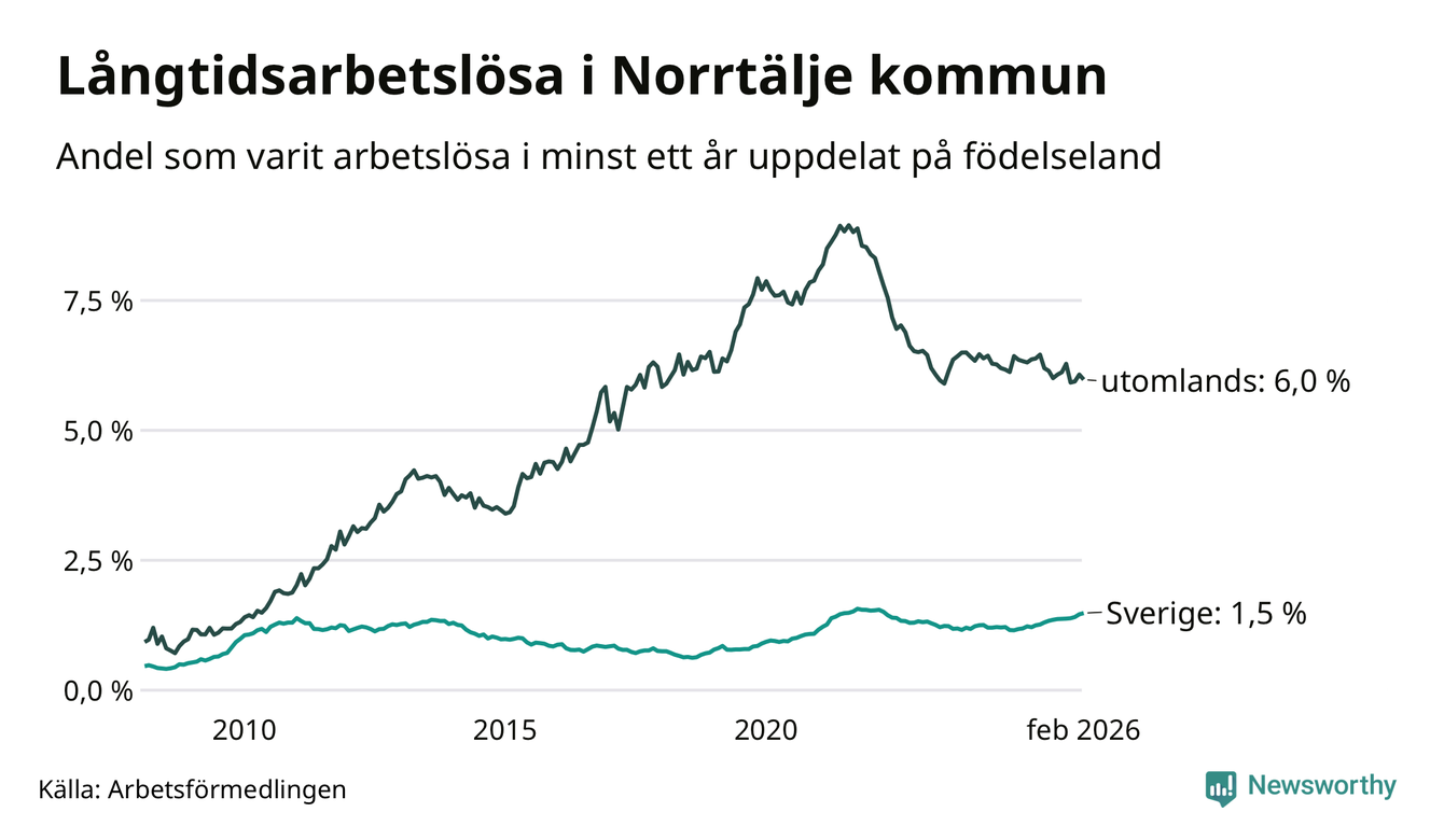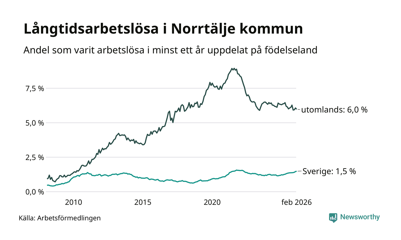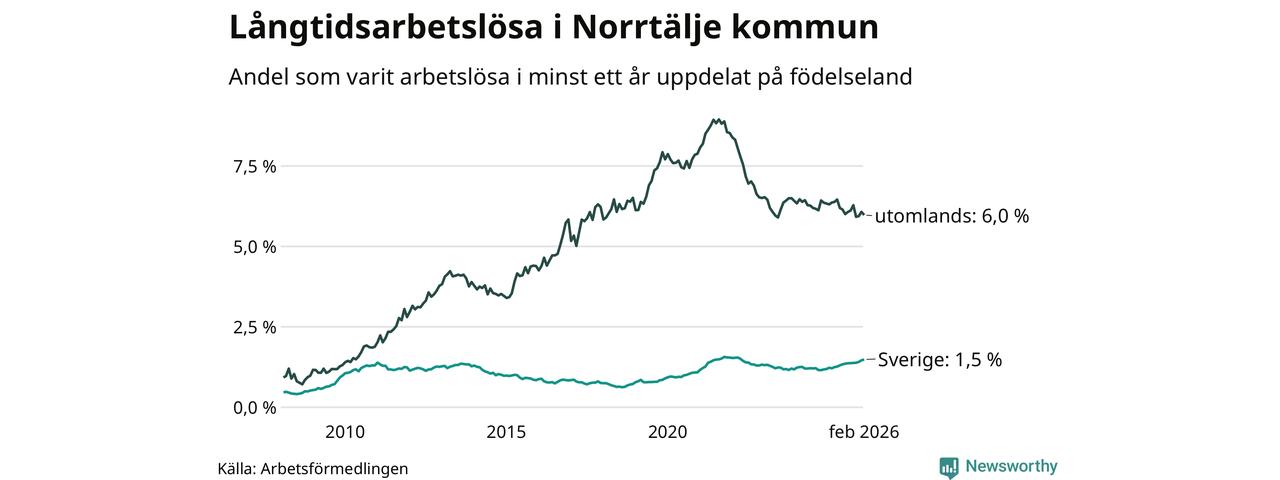 382 av de långtidsarbetslösa i Norrtälje är födda i Sverige, medan 301 är födda utomlands. Det innebär att långtidsarbetslösheten bland Sverigefödda är 1,5 procent, medan den är fyra gånger så hög – 6,0 procent – bland födda utomlands. Även i riket som helhet är arbetslösheten högre bland utrikesfödda.