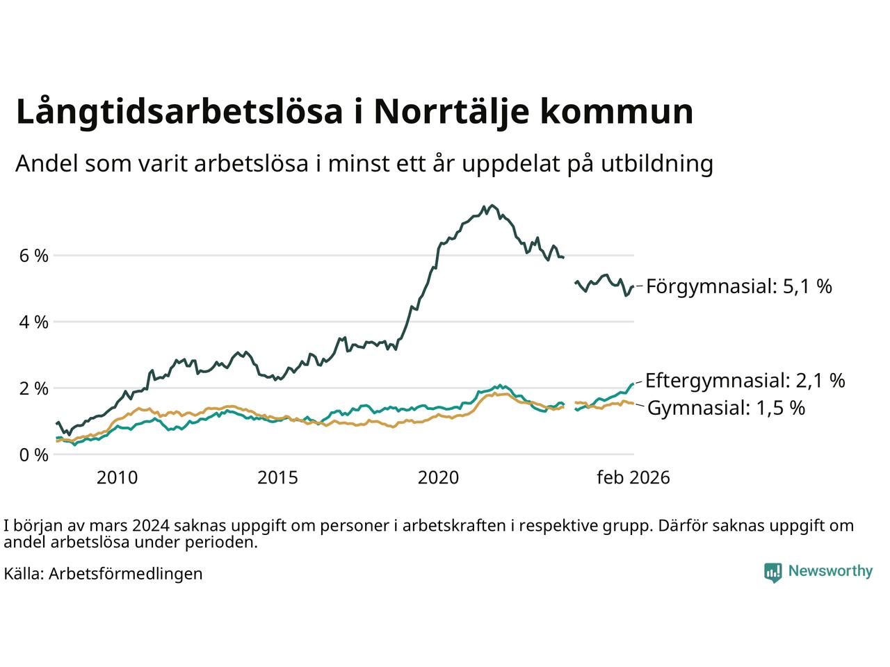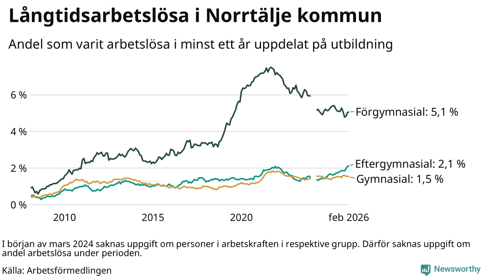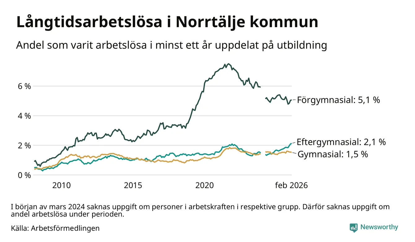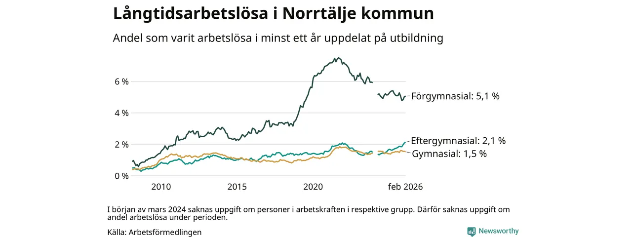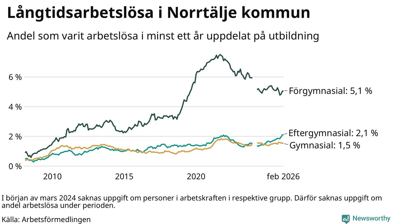 Andelen som varit utan arbete i minst ett år i Norrtälje var ungefär lika stor i februari jämfört med samma månad för ett år sedan. Det visar Arbetsfömedlingens senaste månadsstatistik.