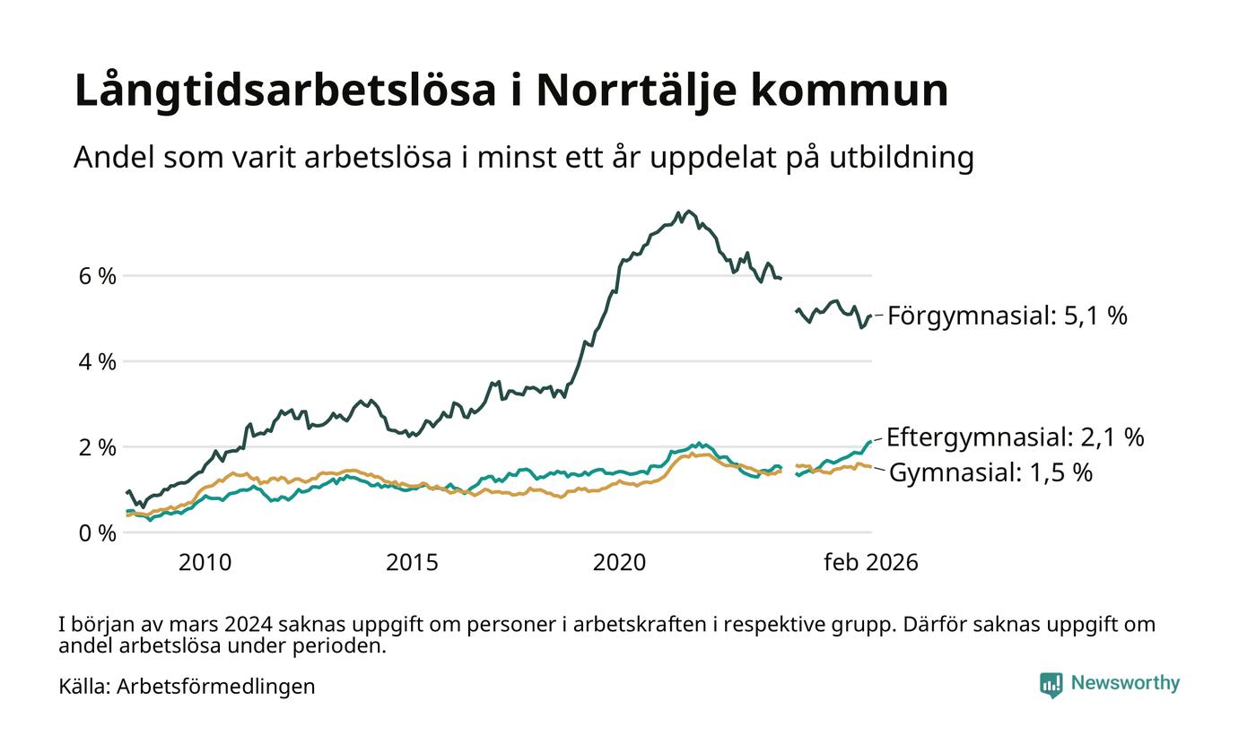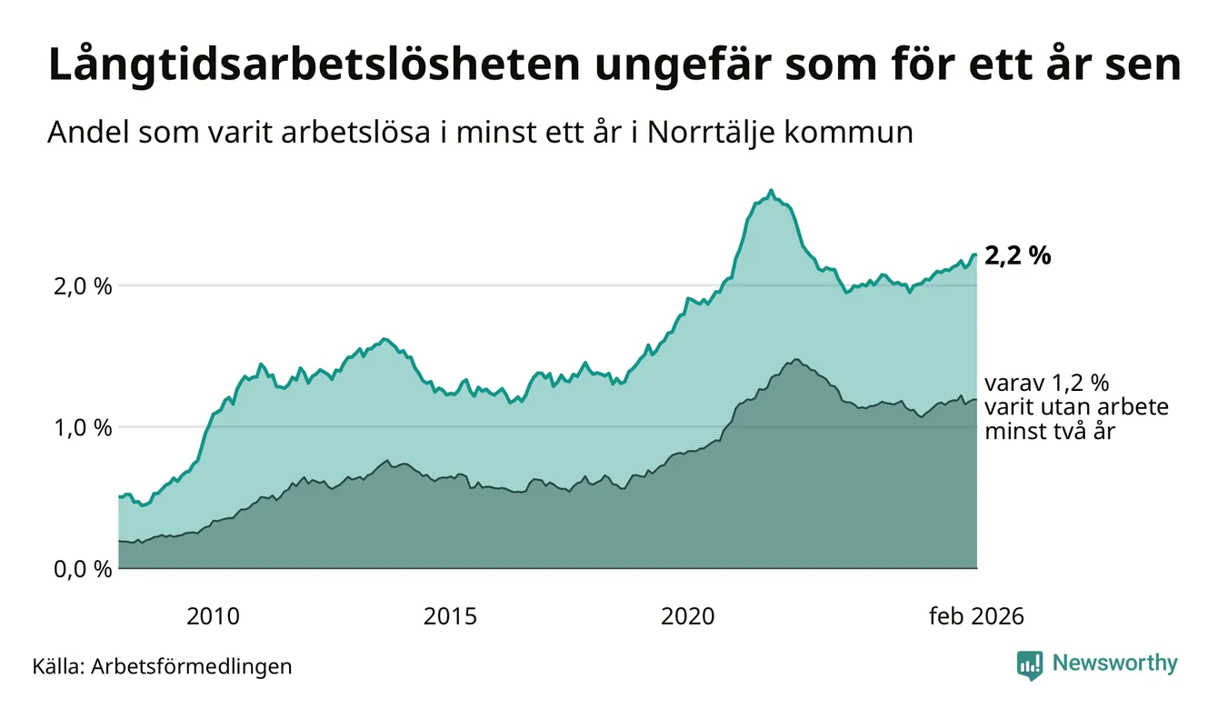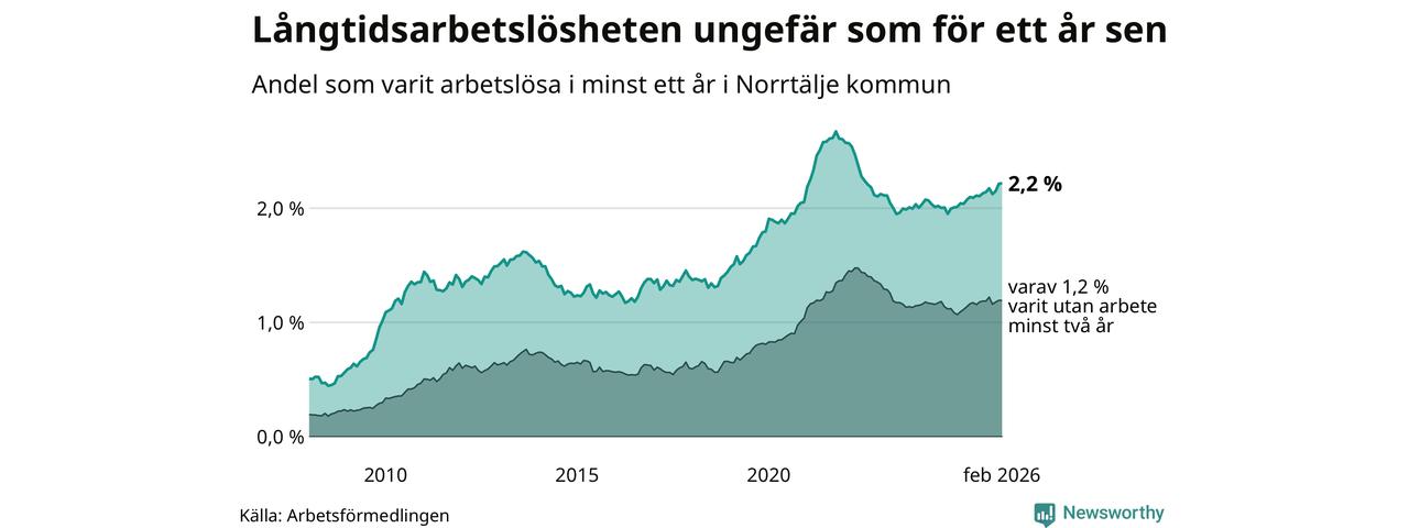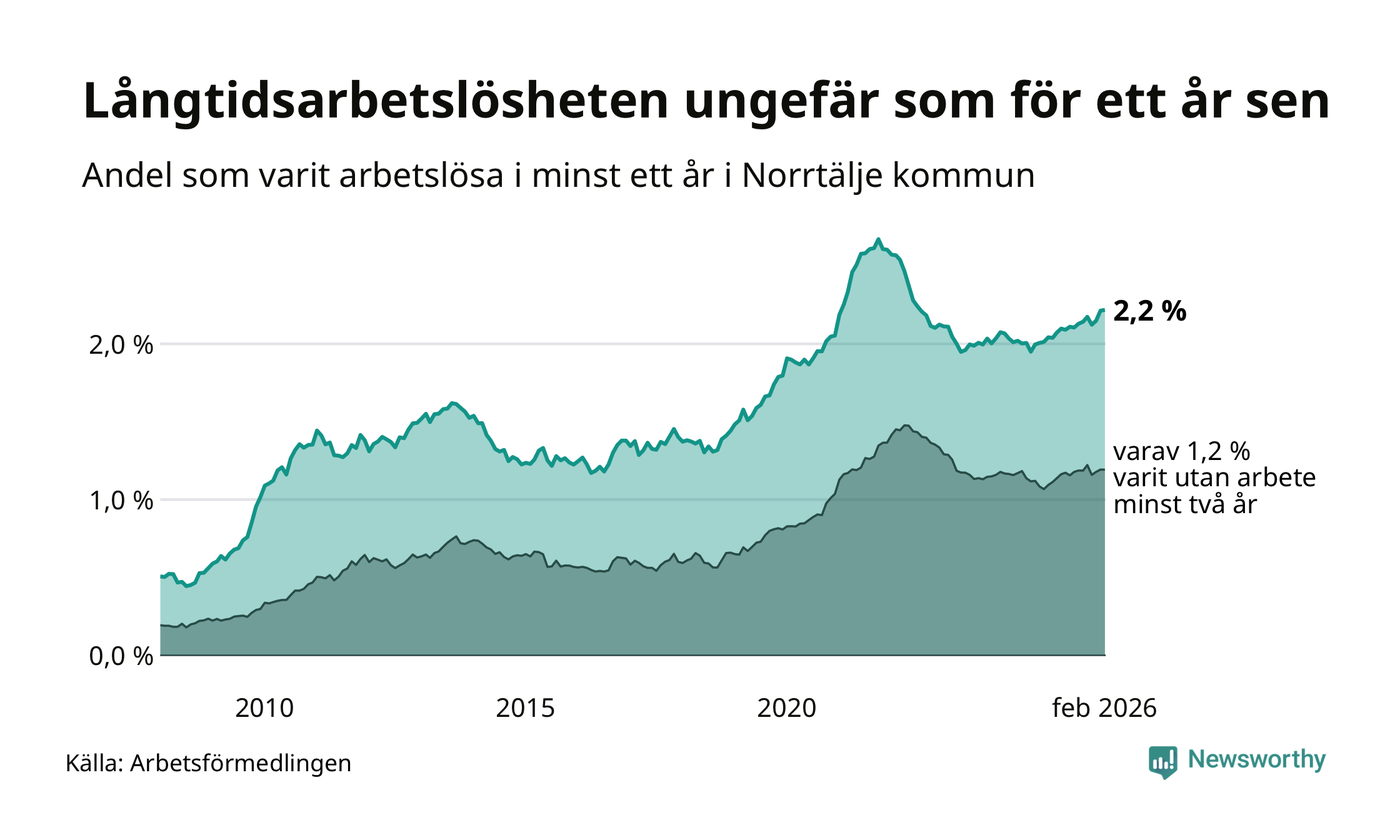 I februari hade 683 Norrtäljebor varit arbetslösa i minst ett år, vilket är två fler än månaden innan. 683 personer motsvarar 2,2 procent av arbetskraften i kommunen – andelen långtidsarbetslösa är ungefär på samma nivå som för ett år sedan.