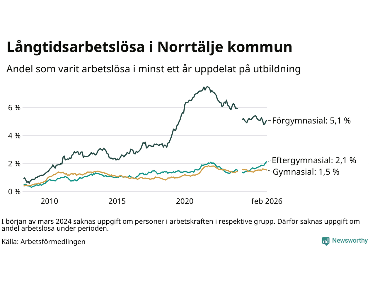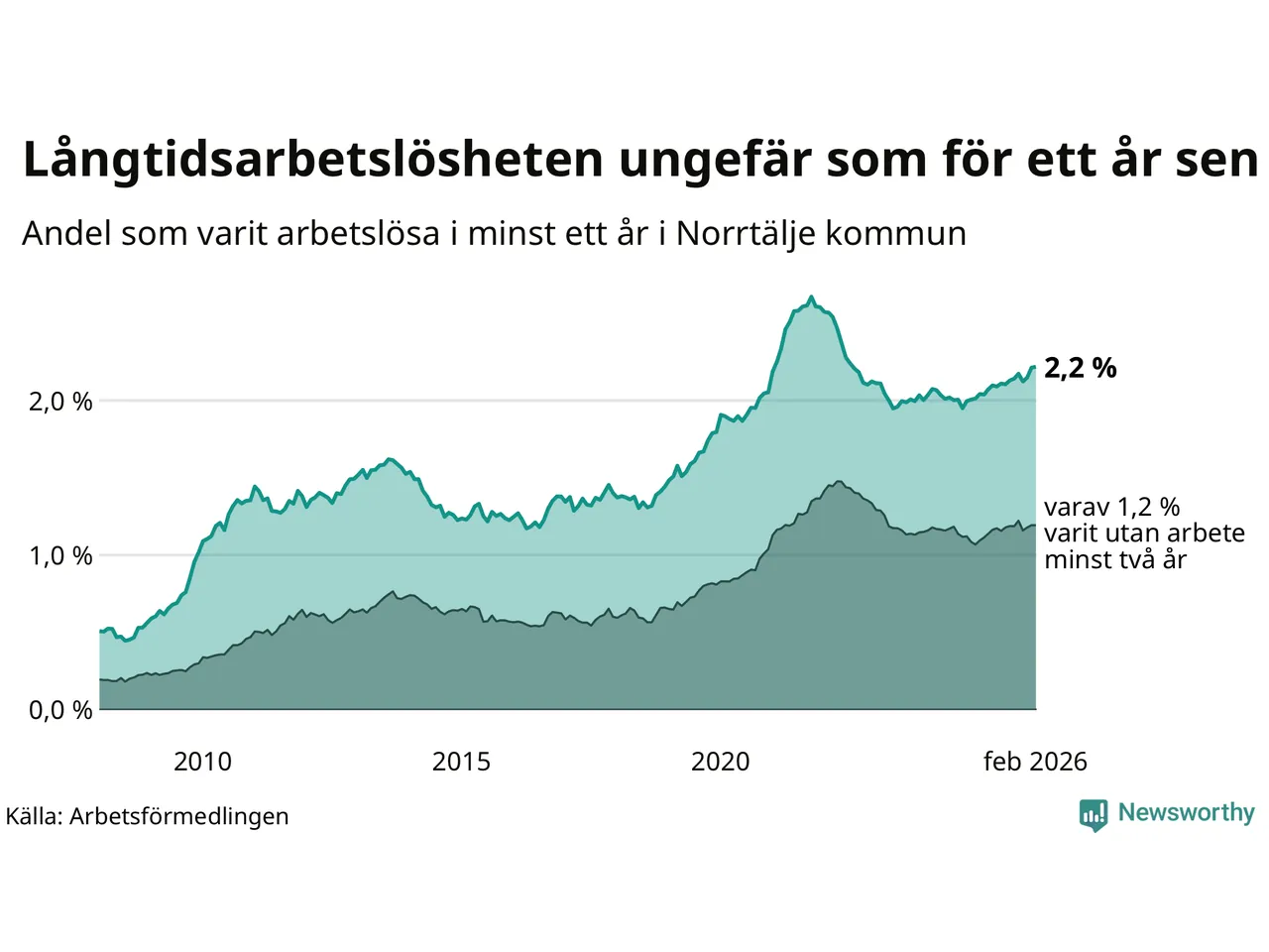 | Andel arbetslösa i minst två år | 1,2 % | 1,6 % | 1,6 % |