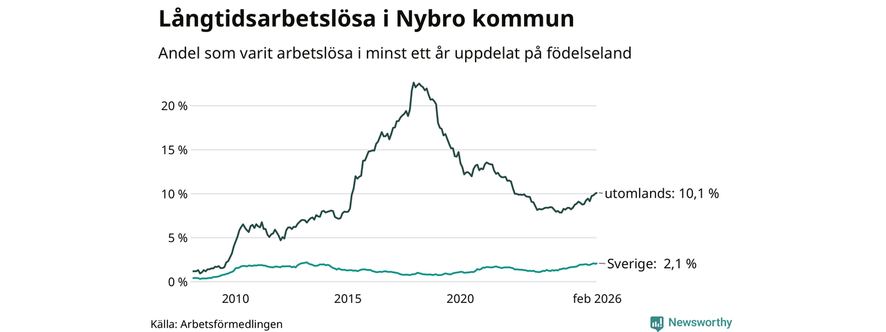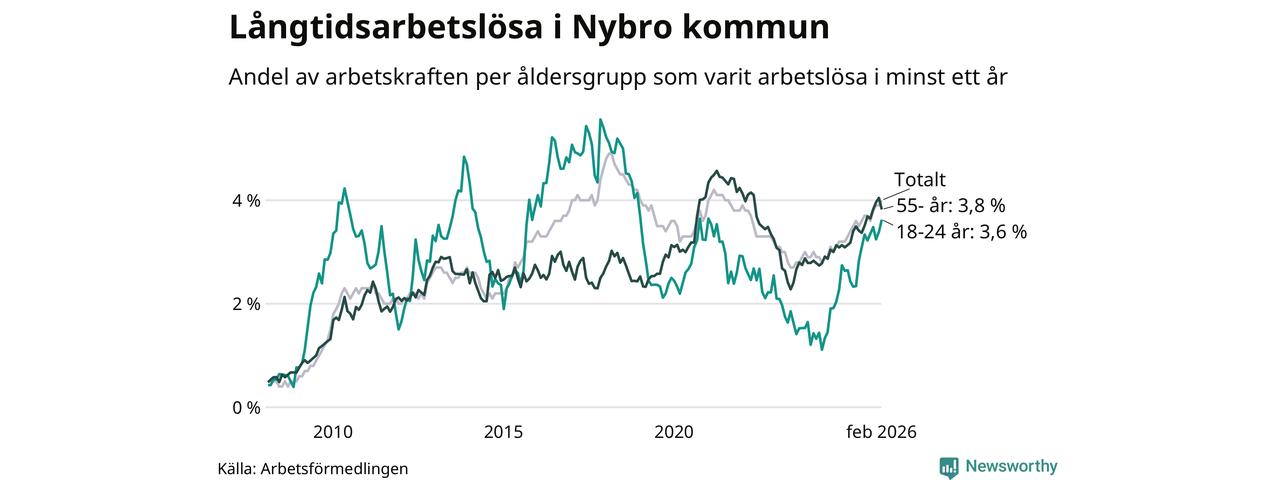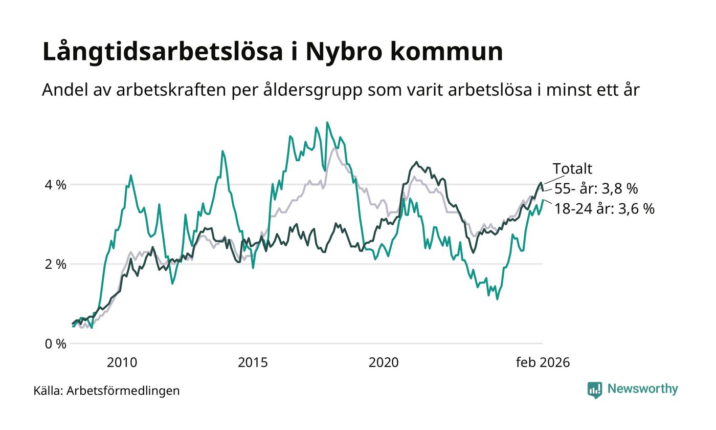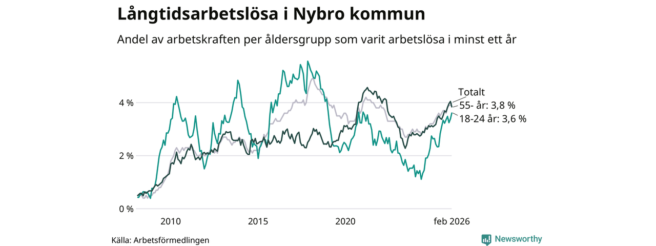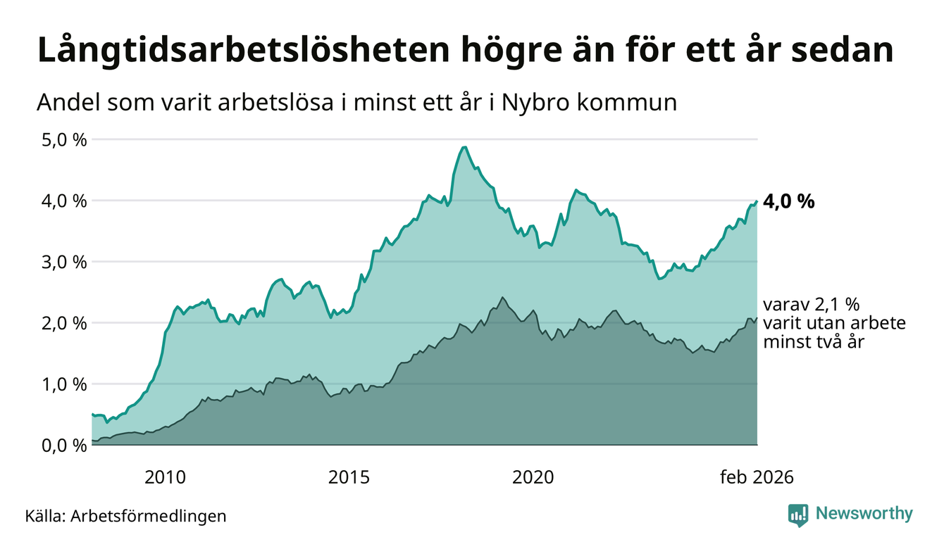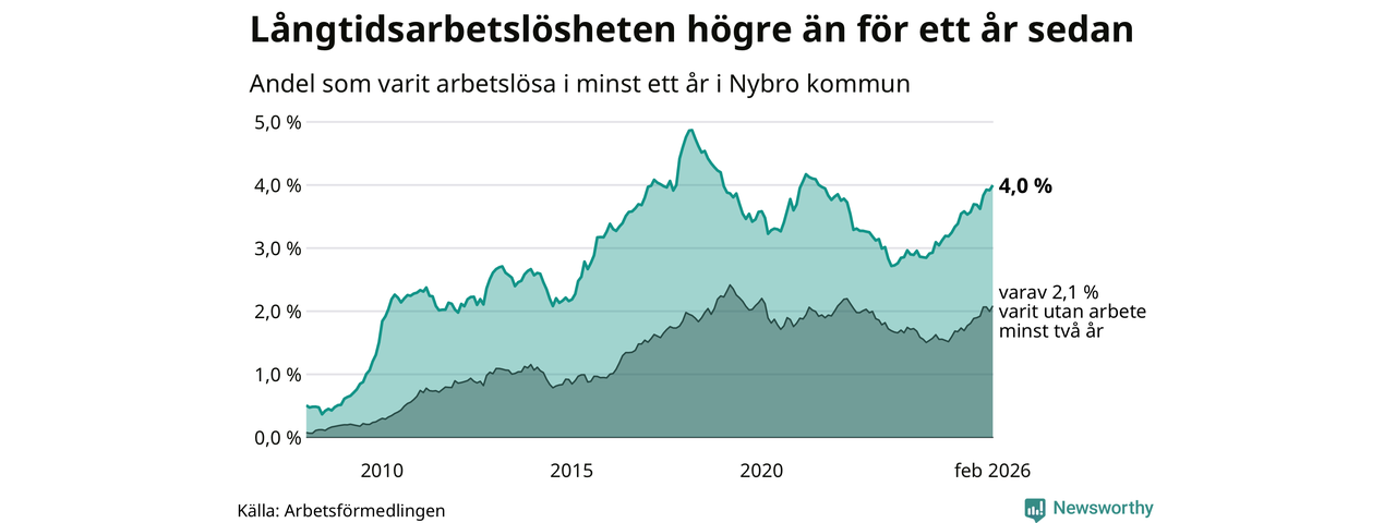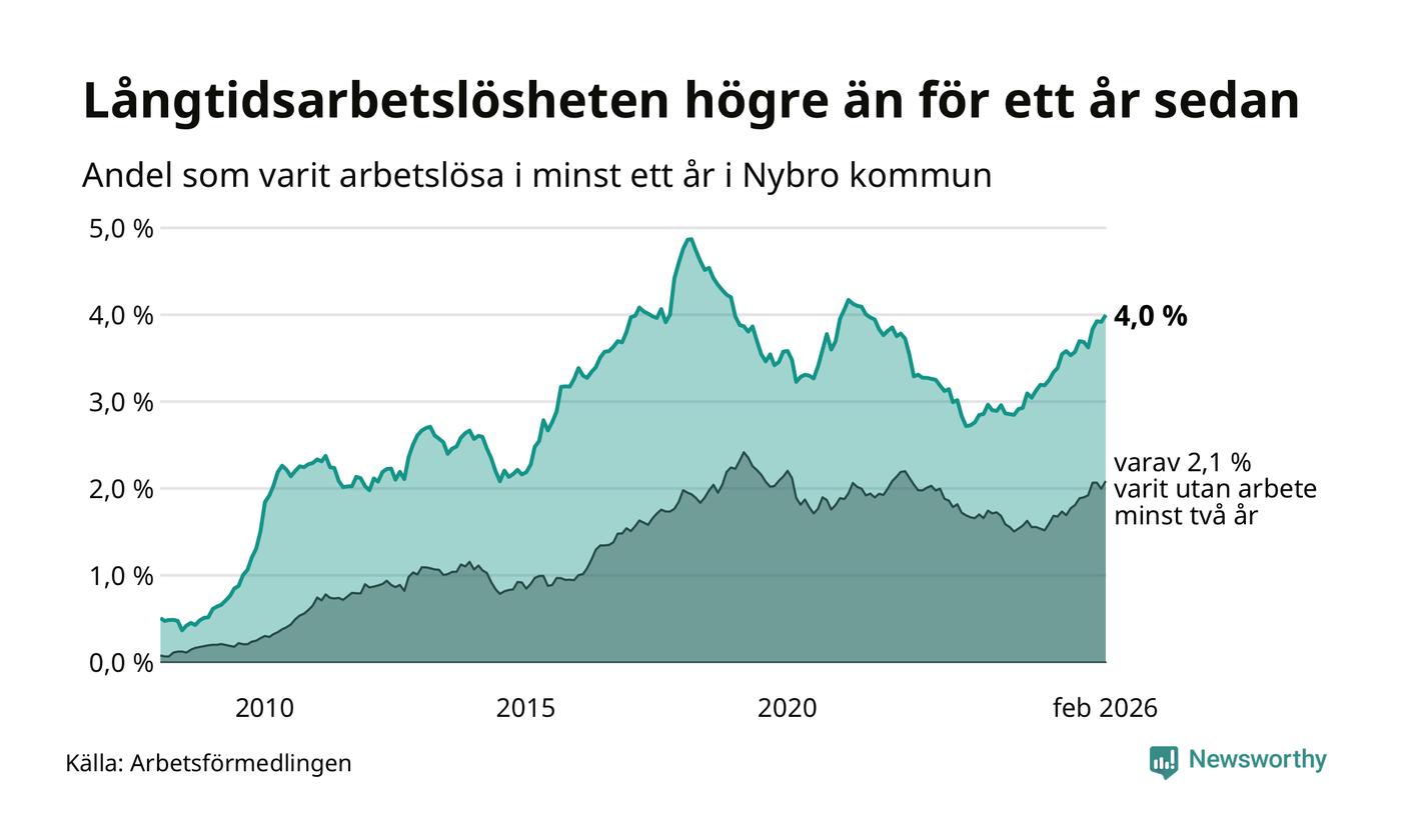 I februari hade 366 Nybrobor varit arbetslösa i minst ett år, vilket är sju fler än månaden innan. Det är den fjärde månaden i rad med ökande antal långtidsarbetslösa. 366 personer motsvarar 4,0 procent av arbetskraften i kommunen – andelen långtidsarbetslösa är 0,7 procentenheter högre än samma månad för ett år sedan.