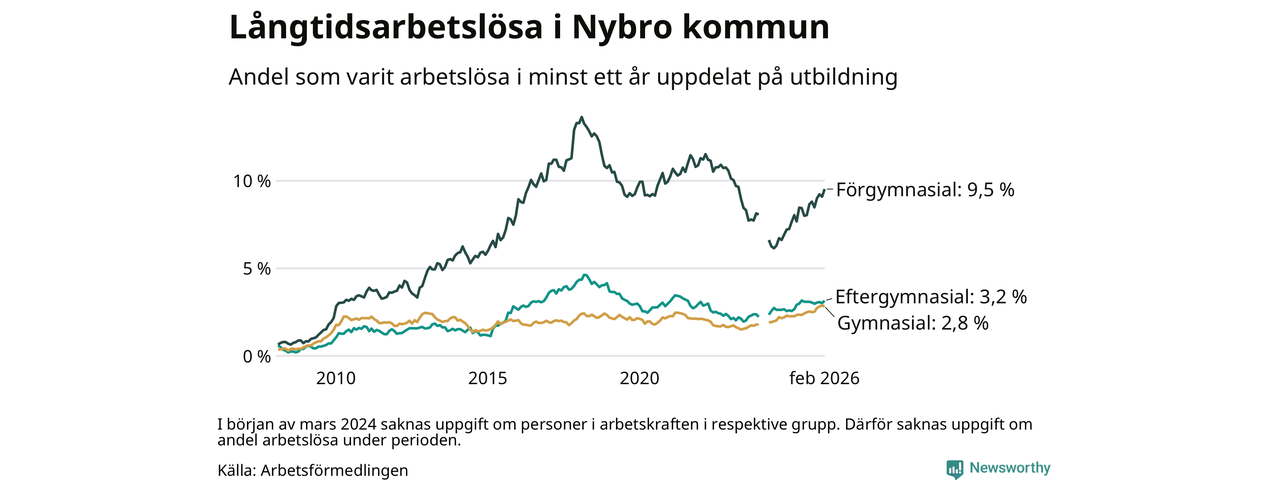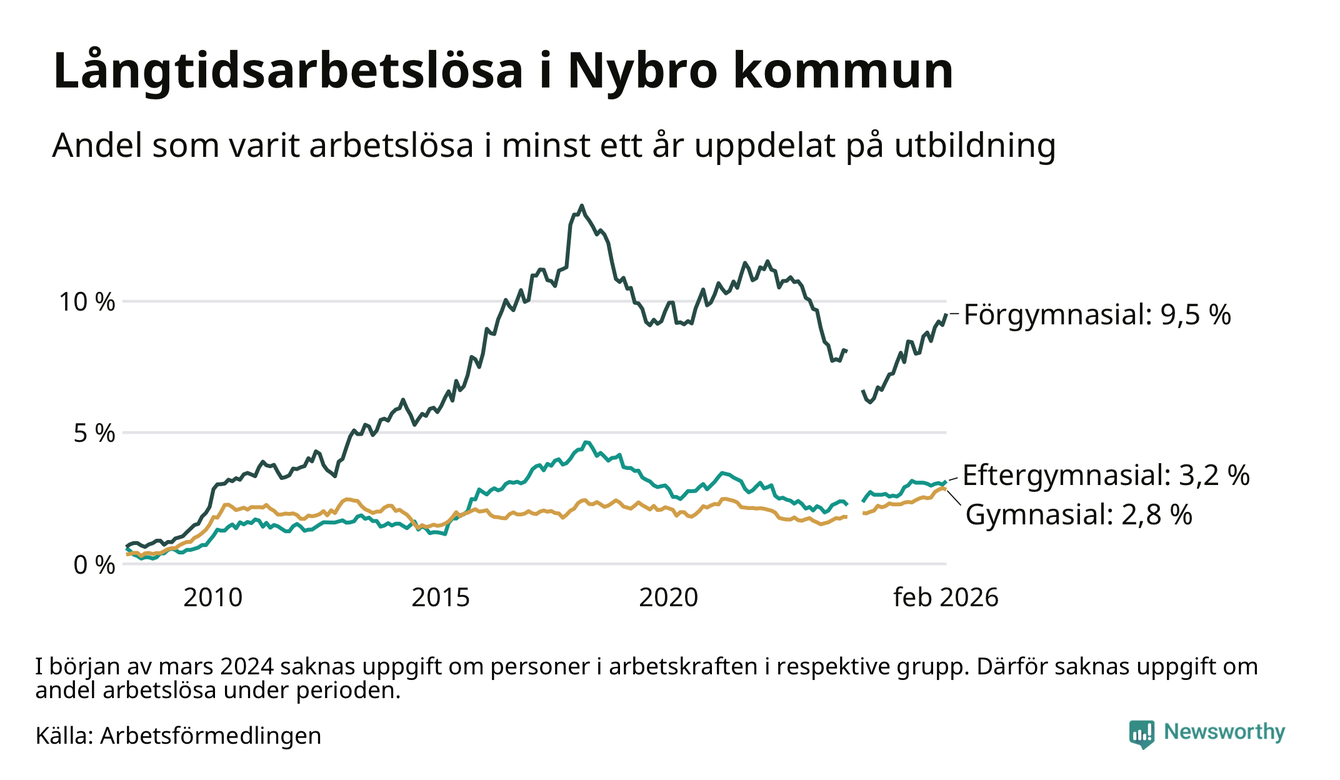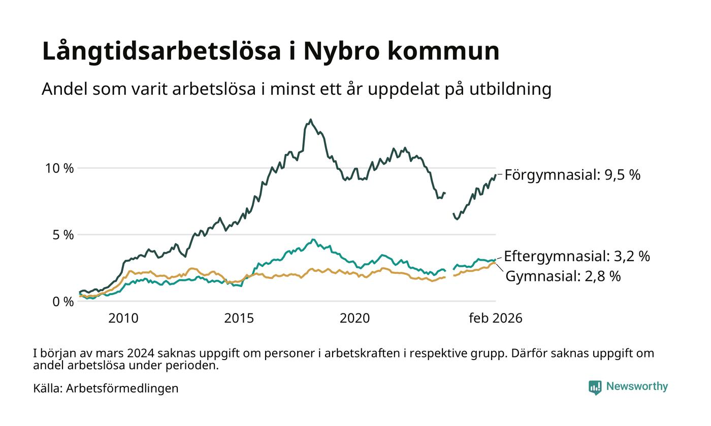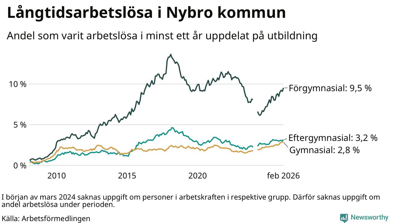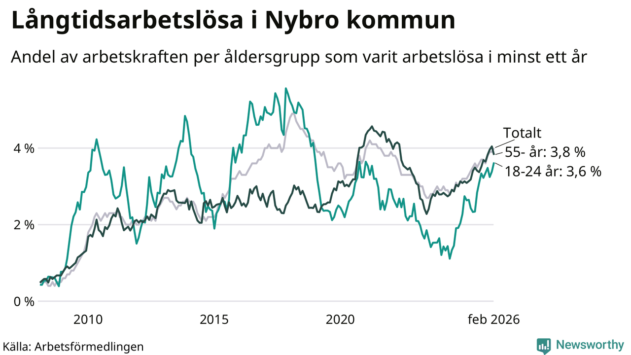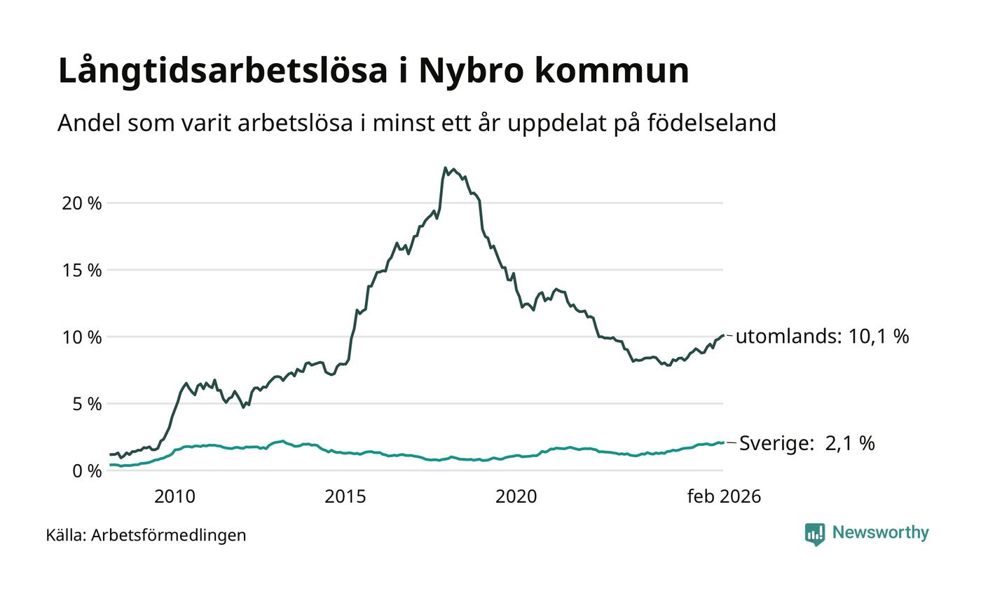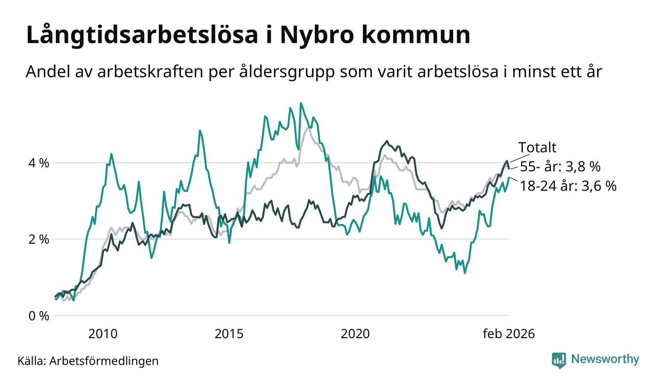 I februari hade 366 Nybrobor varit arbetslösa i minst ett år, vilket är sju fler än månaden innan. Det är den fjärde månaden i rad med ökande antal långtidsarbetslösa. 366 personer motsvarar 4,0 procent av arbetskraften i kommunen – andelen långtidsarbetslösa är 0,7 procentenheter högre än samma månad för ett år sedan.