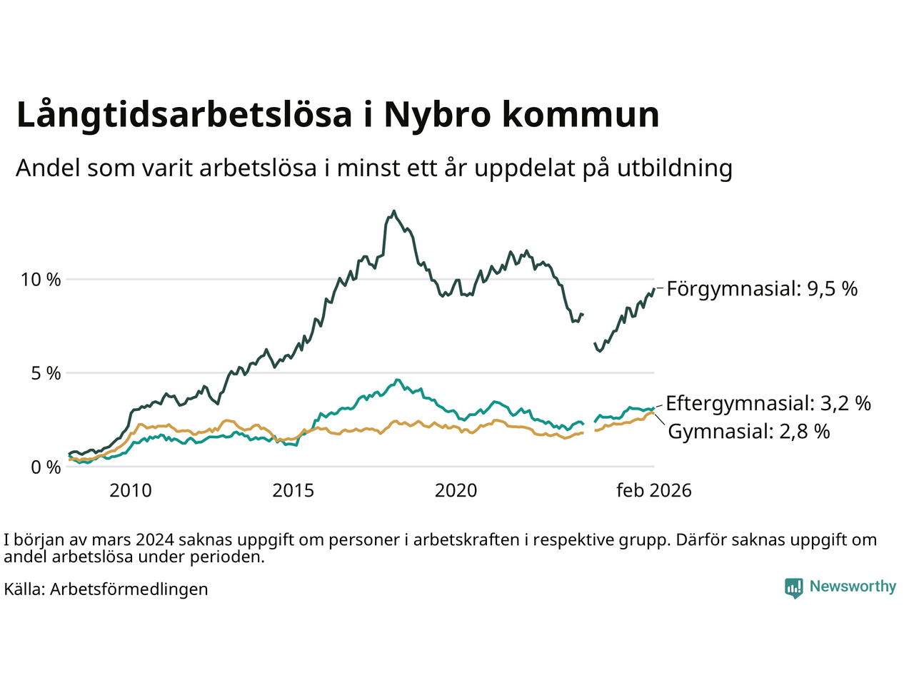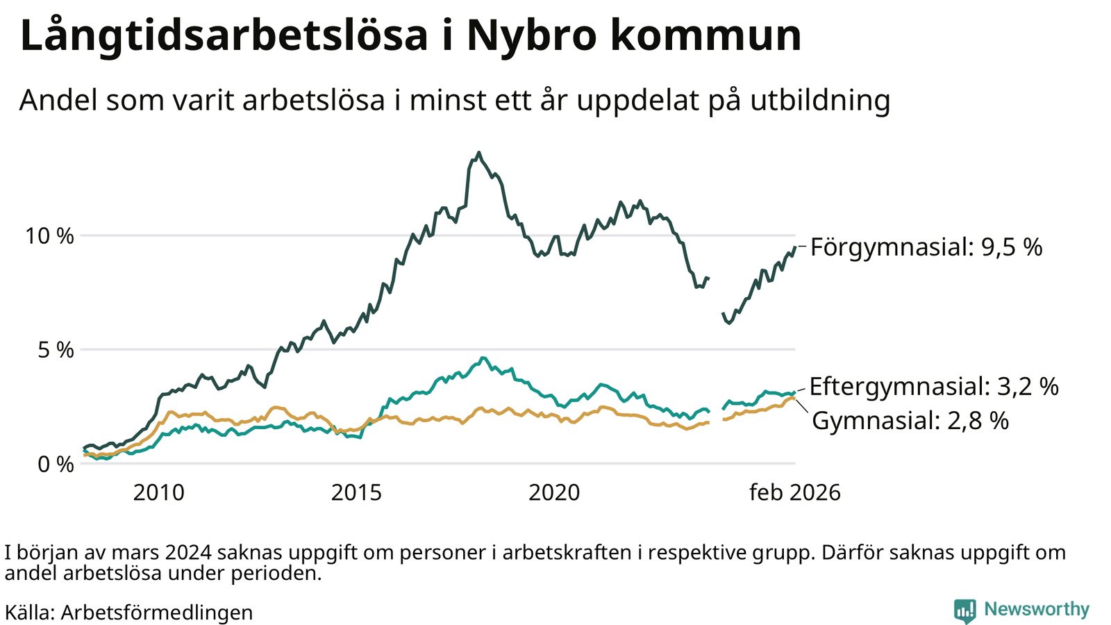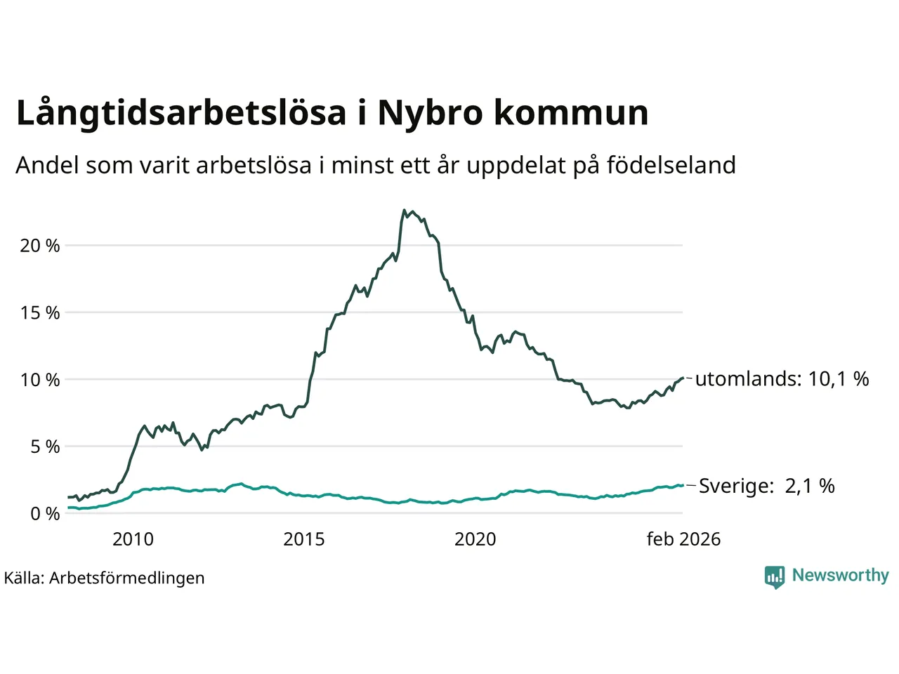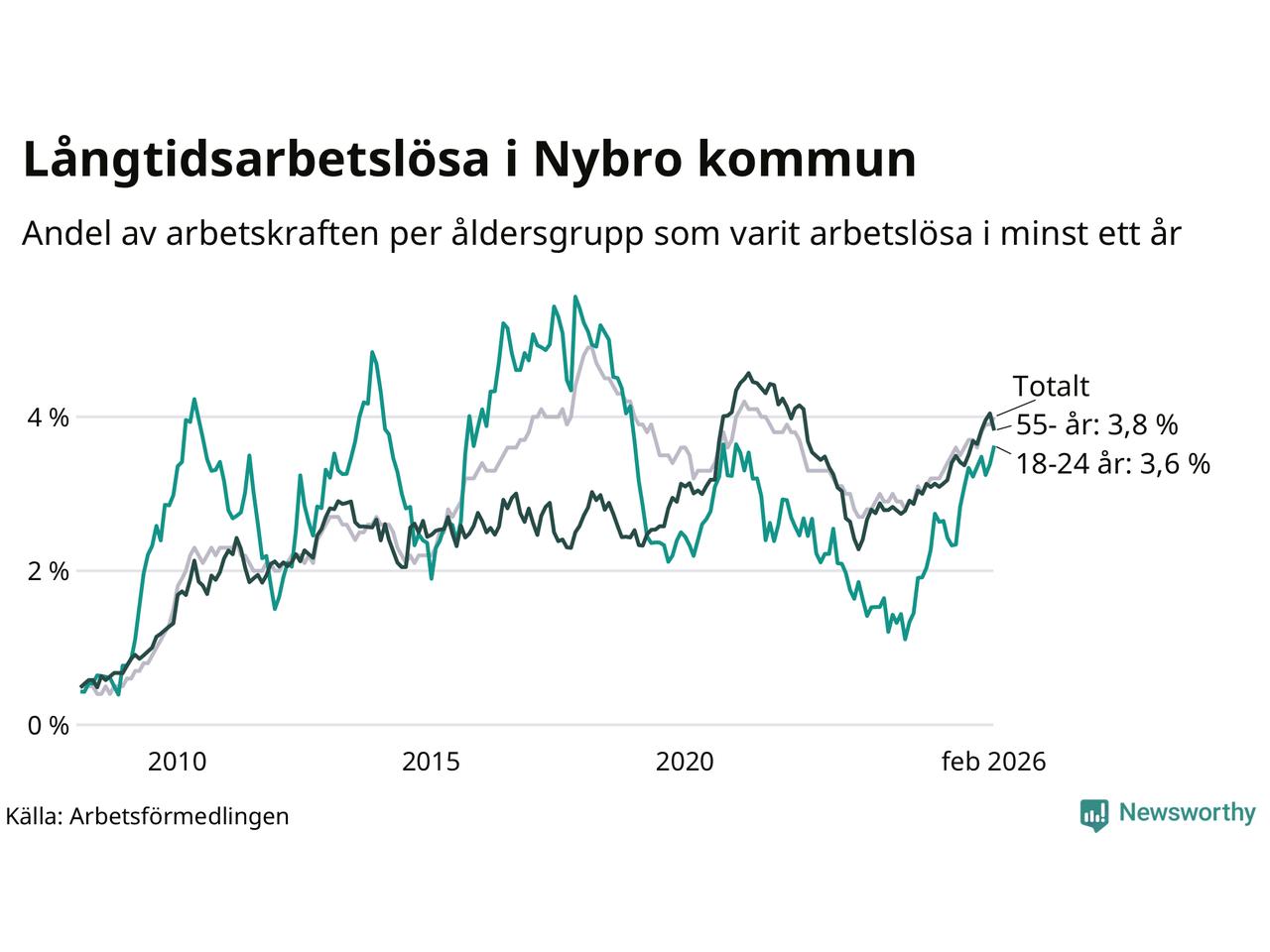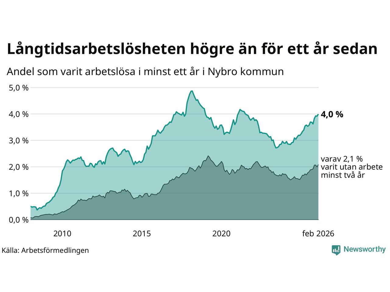 I februari hade 366 Nybrobor varit arbetslösa i minst ett år, vilket är sju fler än månaden innan. Det är den fjärde månaden i rad med ökande antal långtidsarbetslösa. 366 personer motsvarar 4,0 procent av arbetskraften i kommunen – andelen långtidsarbetslösa är 0,7 procentenheter högre än samma månad för ett år sedan.