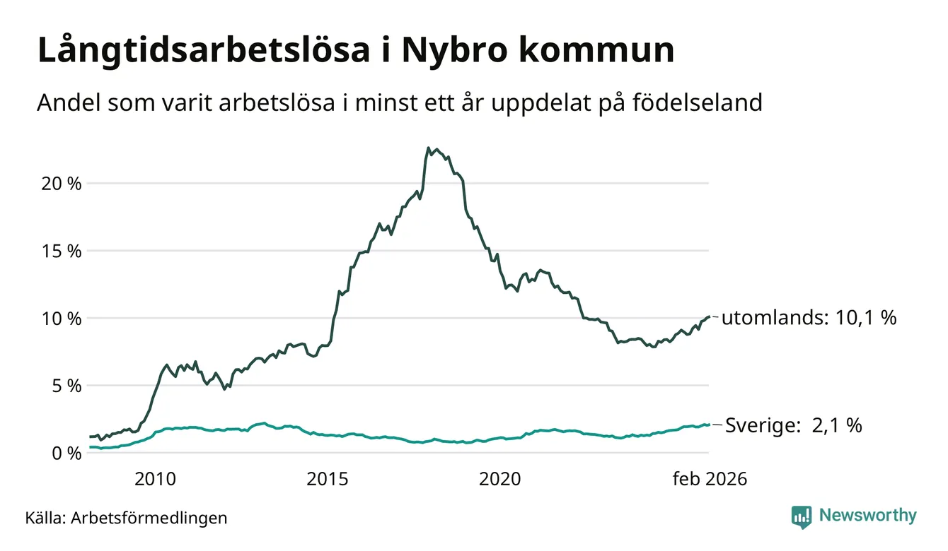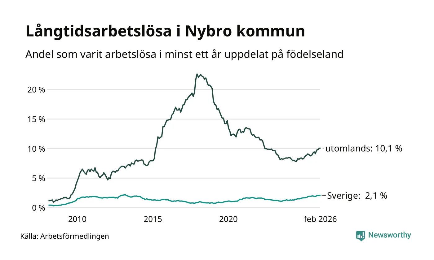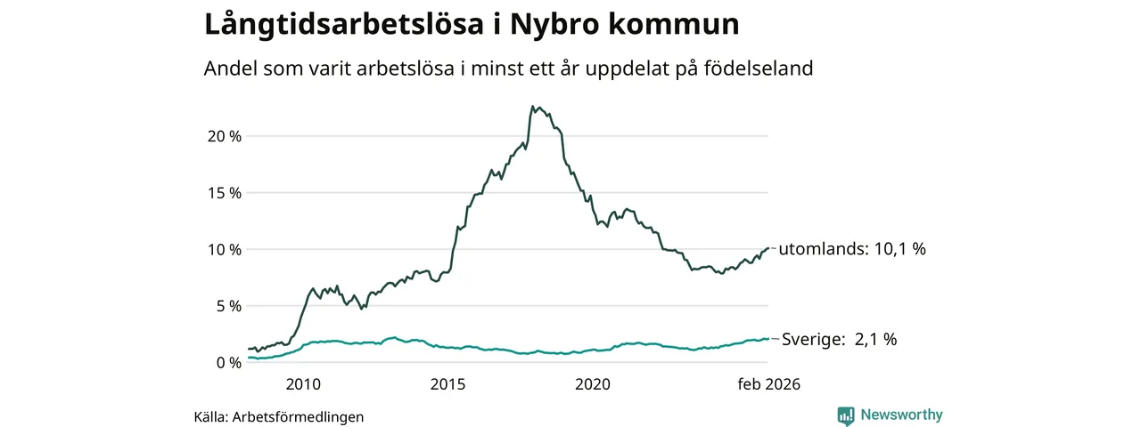 147 av de långtidsarbetslösa i Nybro är födda i Sverige, medan 219 är födda utomlands. Det innebär att långtidsarbetslösheten bland Sverigefödda är 2,1 procent, medan den är fem gånger så hög – 10,1 procent – bland födda utomlands. Även i riket som helhet är arbetslösheten högre bland utrikesfödda.