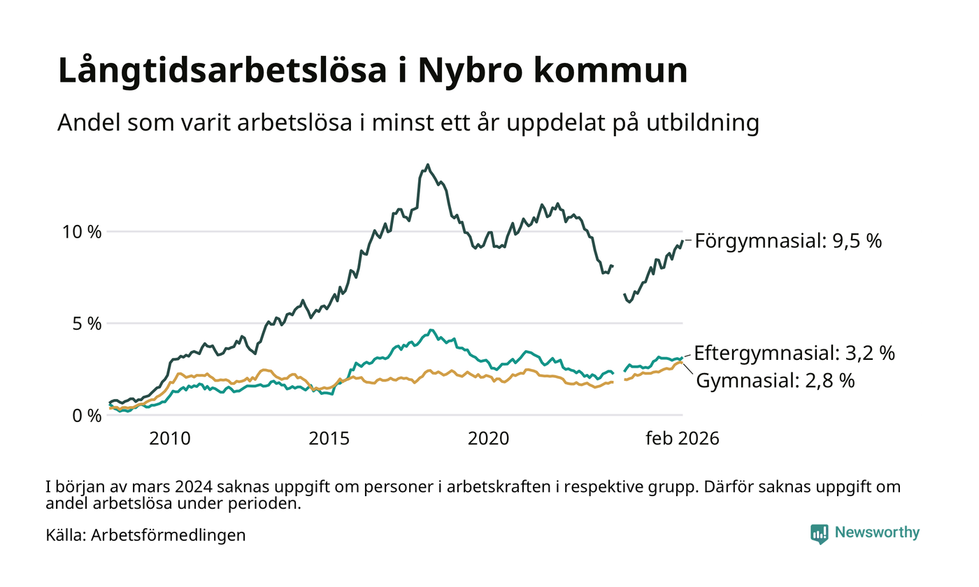 Inte sedan juli 2021 har andelen långtidsarbetslösa varit så hög i Nybro. Det visar Arbetsförmedlingens senaste månadsstatistik.