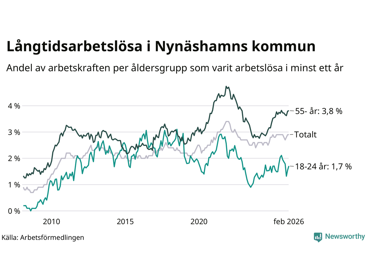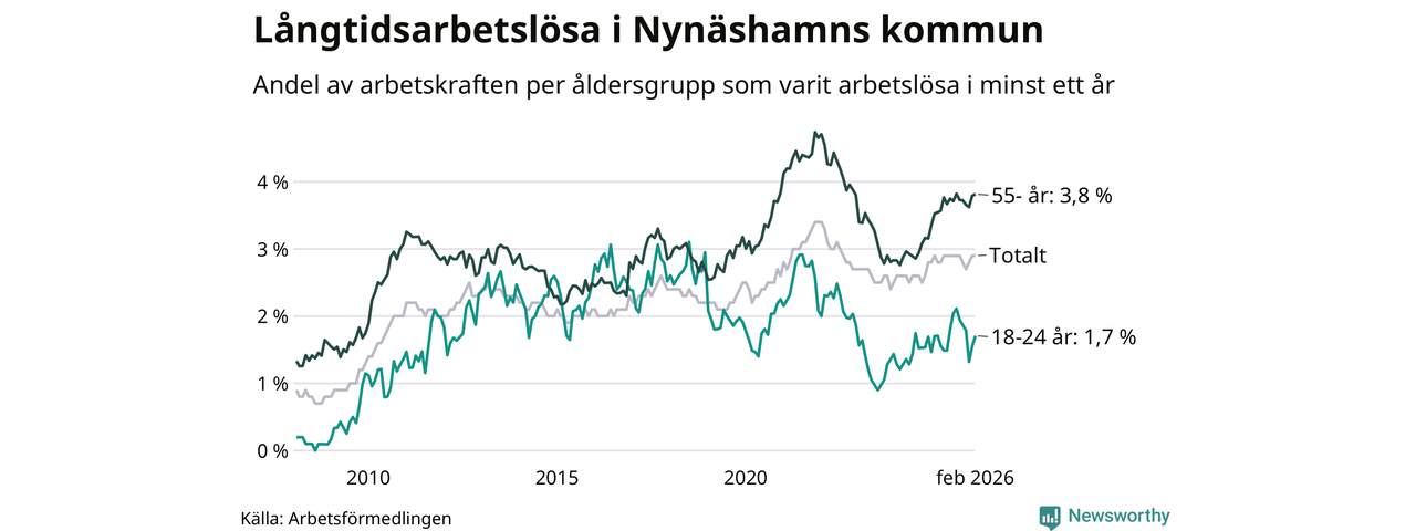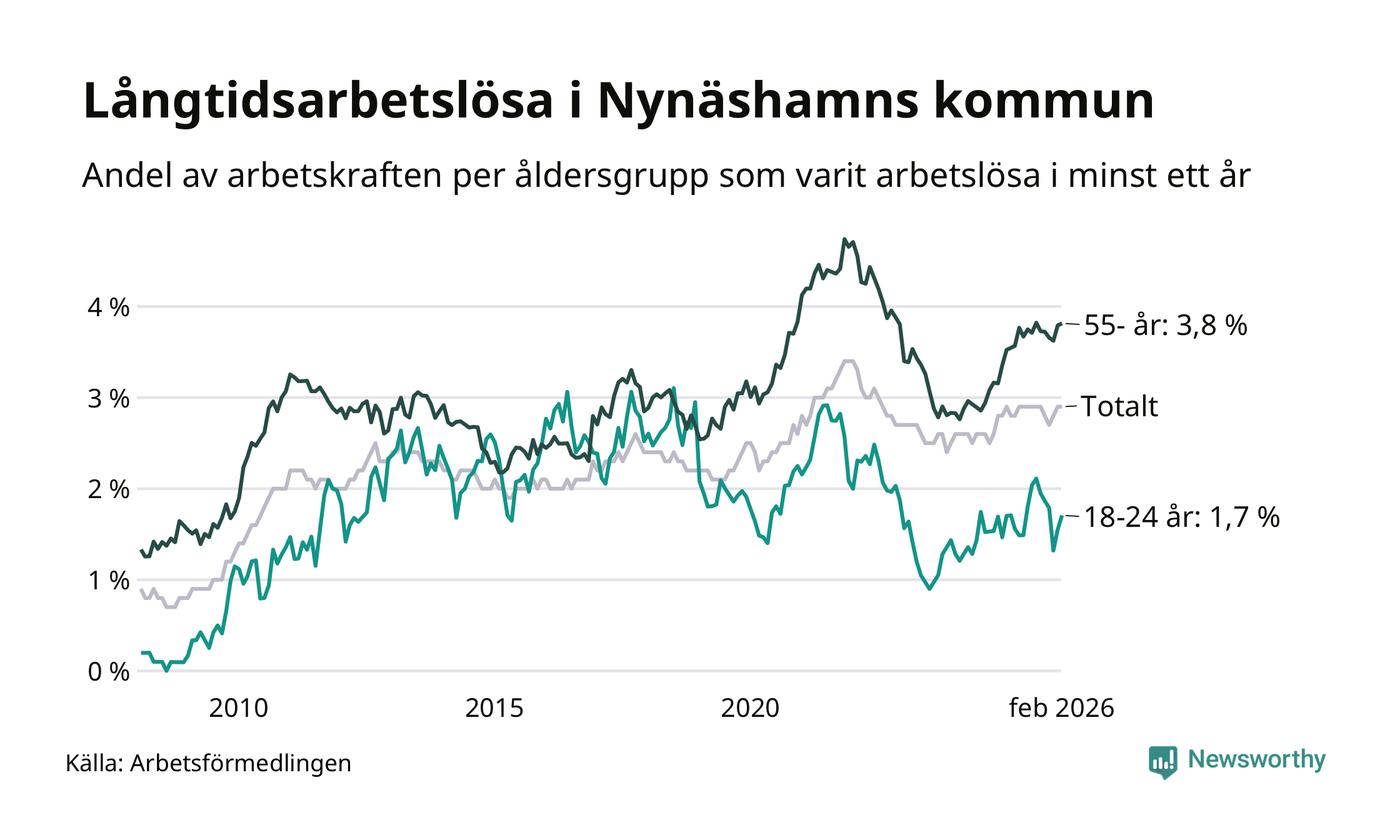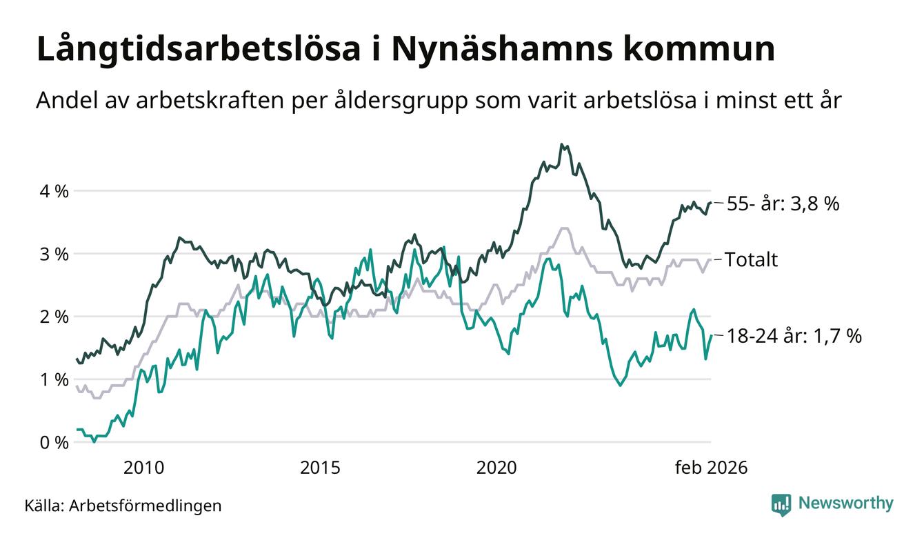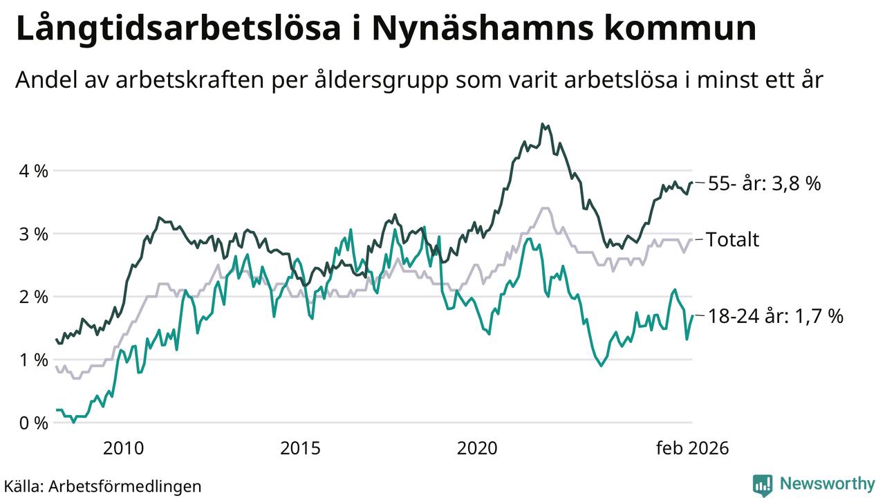 Av de 428 personerna som varit arbetslösa i mer än ett år i Nynäshamns kommun är 132 personer mellan 55 och 661 år och 22 är mellan 18 och 24 år. För den äldre gruppen är andelen arbetslösa 3,8 procent medan den i den yngre gruppen är 1,7 procent. Även i riket som helhet är långtidsarbetslösheten högre i gruppen äldre.