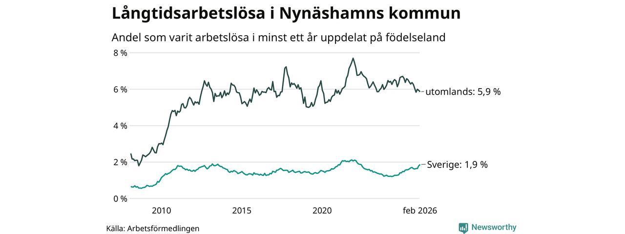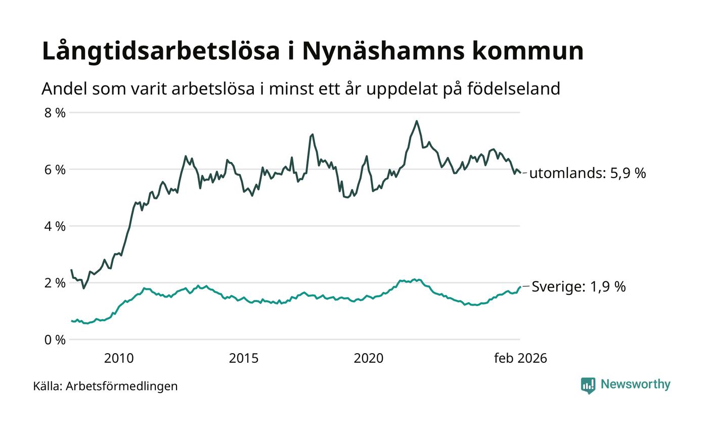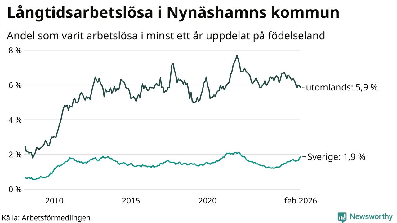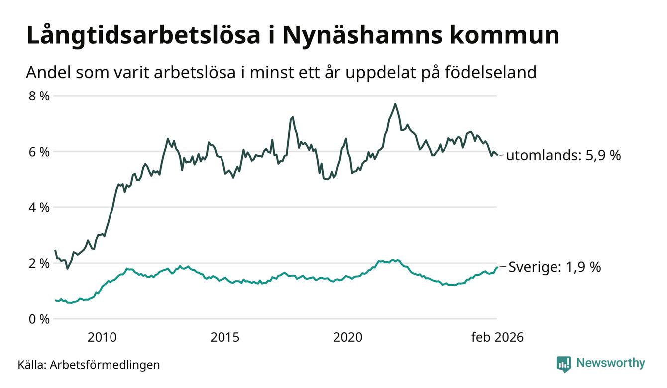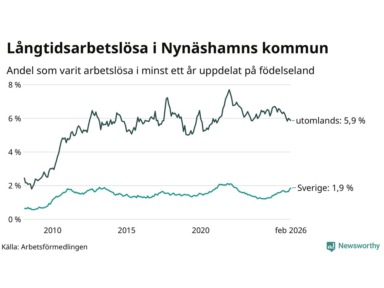 203 av de långtidsarbetslösa i Nynäshamn är födda i Sverige, medan 225 är födda utomlands. Det innebär att långtidsarbetslösheten bland Sverigefödda är 1,9 procent, medan den är tre gånger så hög – 5,9 procent – bland födda utomlands. Även i riket som helhet är arbetslösheten högre bland utrikesfödda.