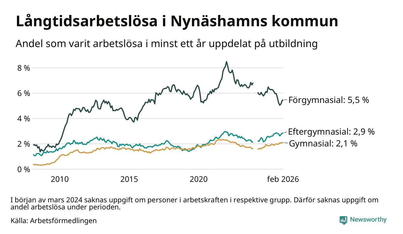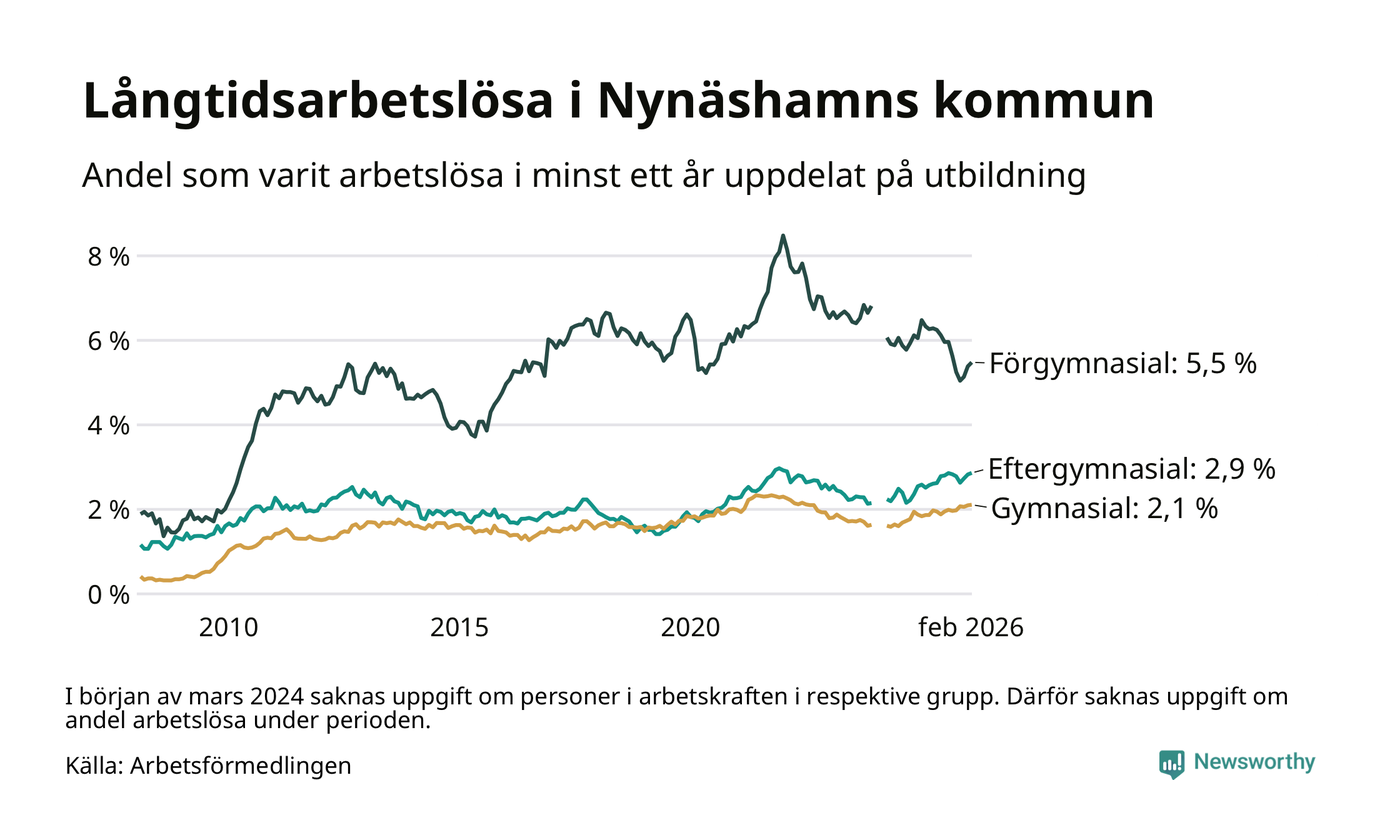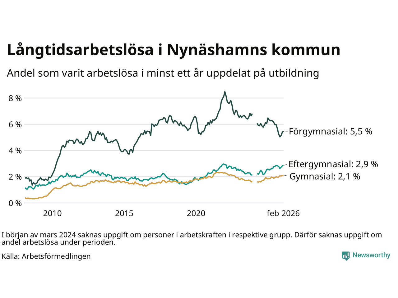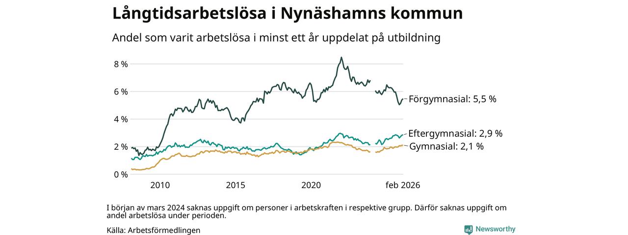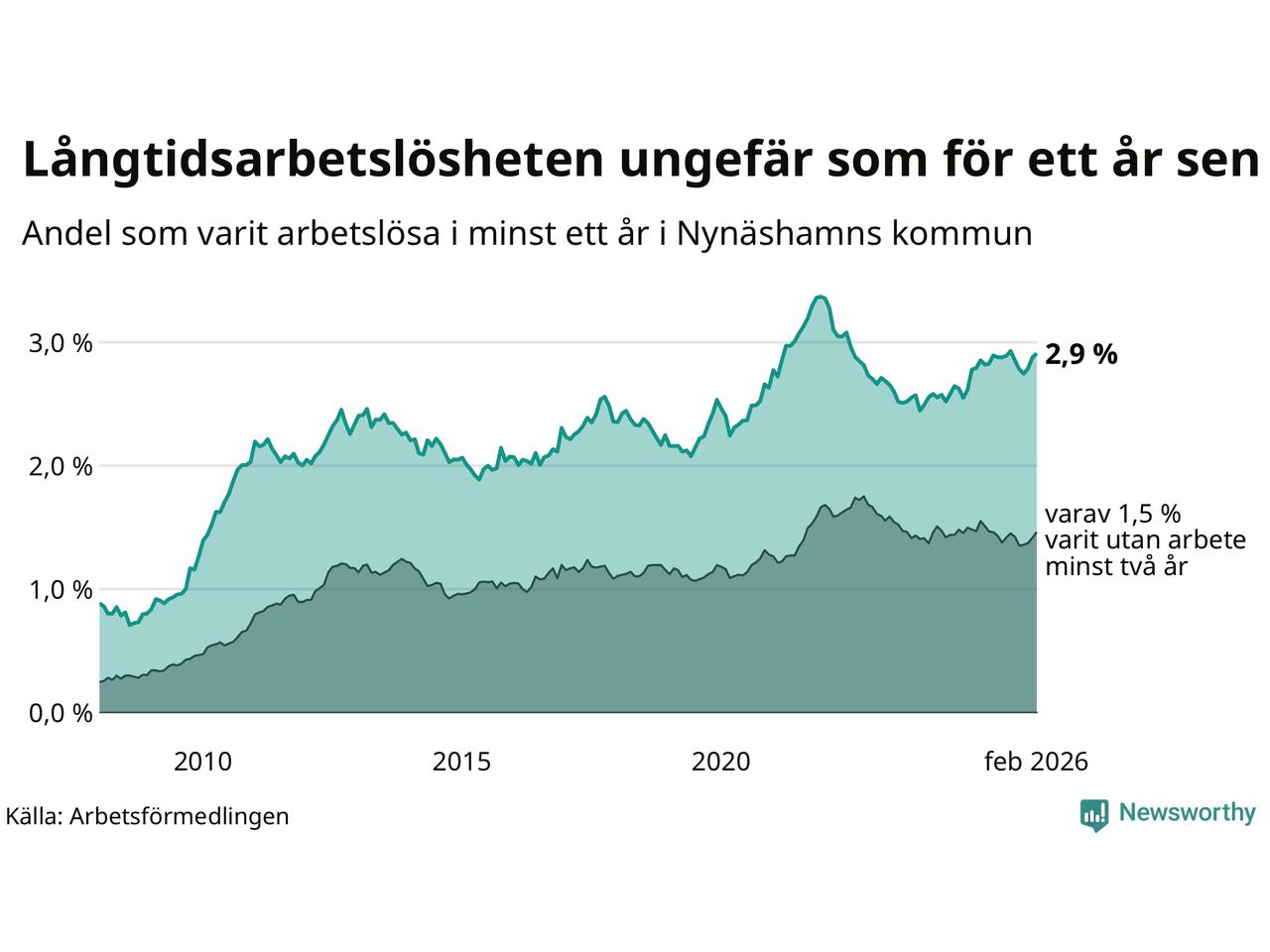 Andelen som varit utan arbete i minst ett år i Nynäshamn var ungefär lika stor i februari jämfört med samma månad för ett år sedan. Det visar Arbetsfömedlingens senaste månadsstatistik.