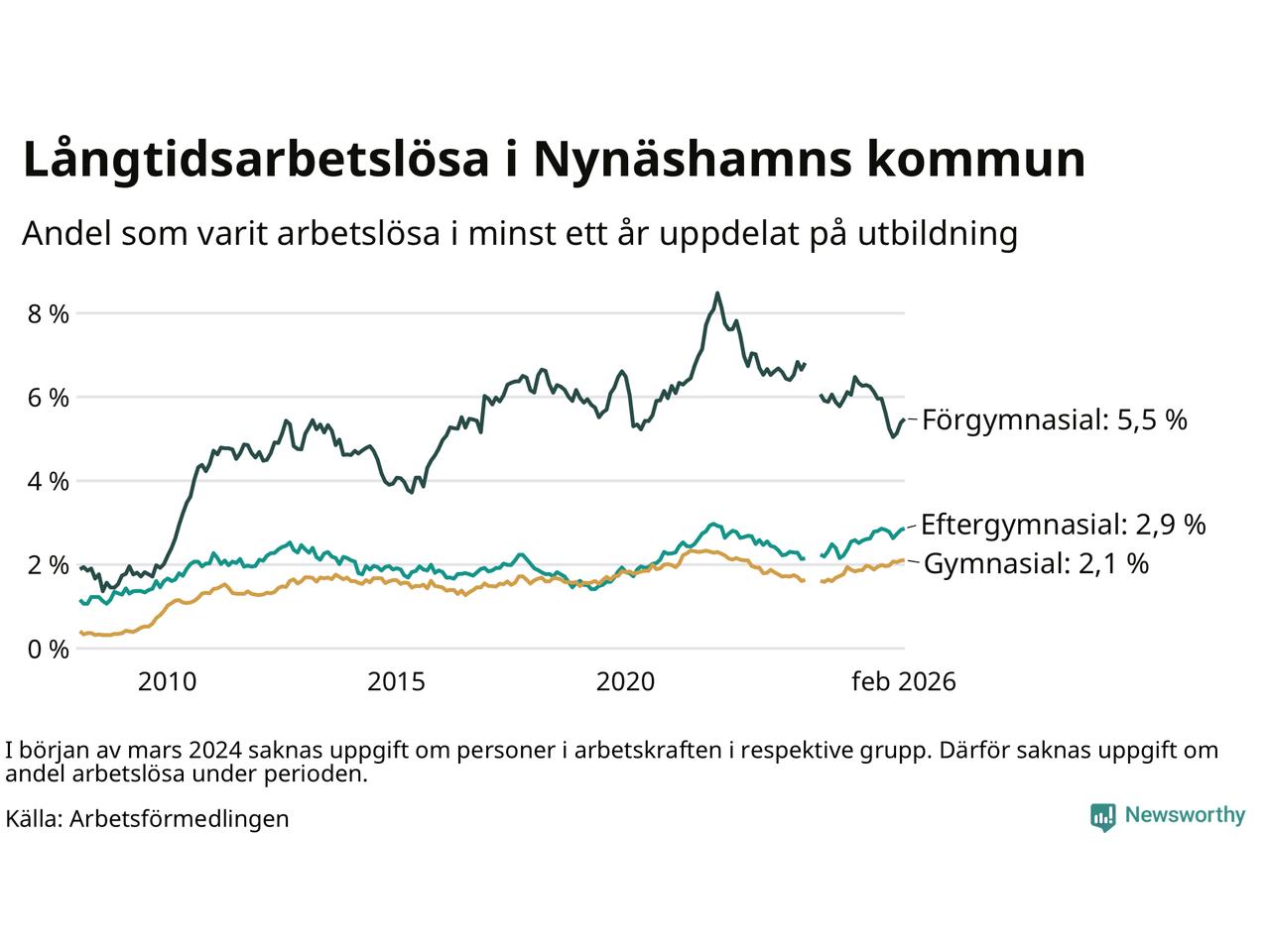 I februari hade 428 Nynäshamnsbor varit arbetslösa i minst ett år, vilket är fem fler än månaden innan. 428 personer motsvarar 2,9 procent av arbetskraften i kommunen – andelen långtidsarbetslösa är ungefär på samma nivå som för ett år sedan.