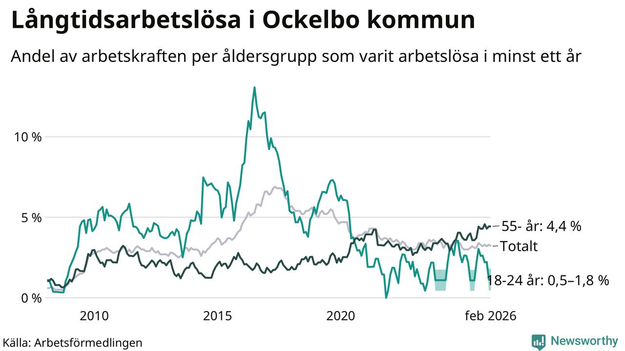 Av de 82 personerna som varit arbetslösa i mer än ett år i Ockelbo kommun är 32 personer mellan 55 och 661 år och mellan en och fyra är mellan 18 och 24 år. För den äldre gruppen är andelen arbetslösa 4,4 procent medan den i den yngre gruppen är mellan 0,5 och 1,8 procent. Även i riket som helhet är långtidsarbetslösheten högre i gruppen äldre.