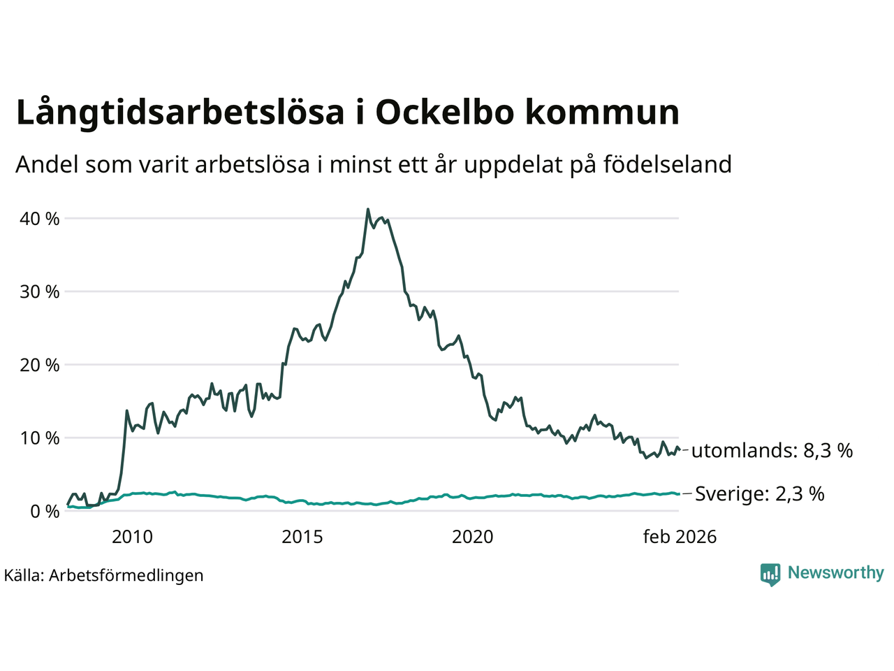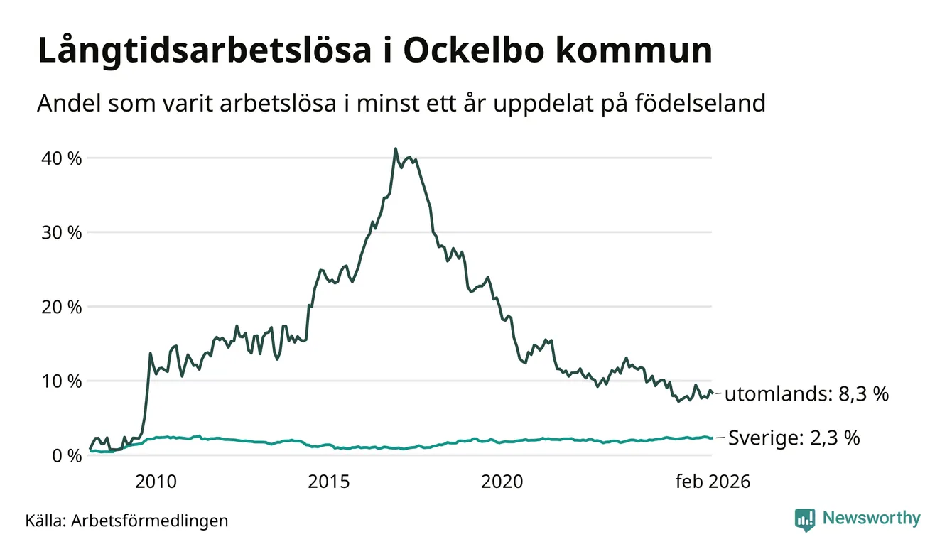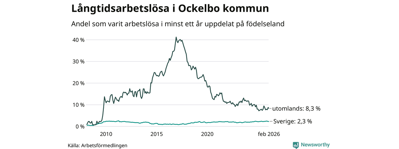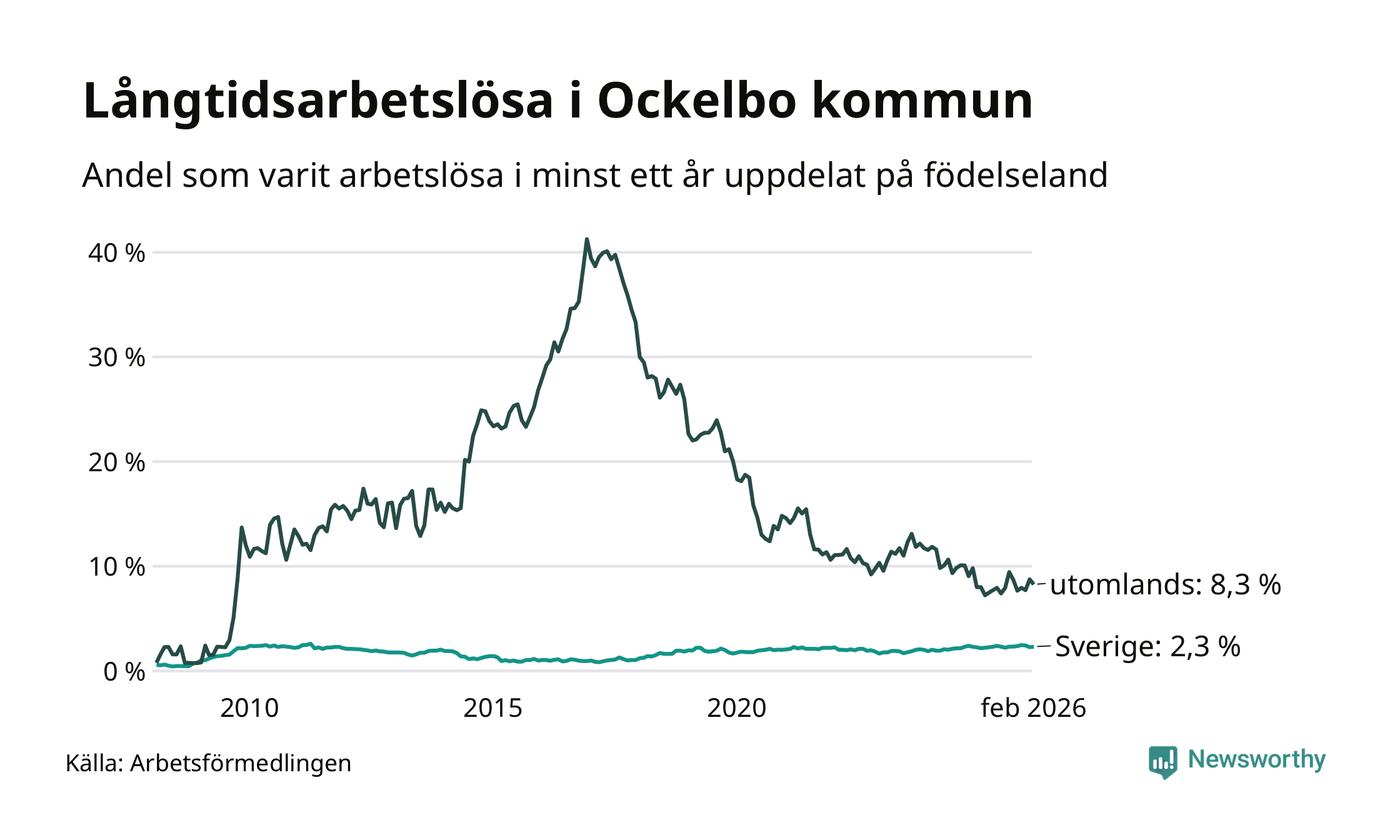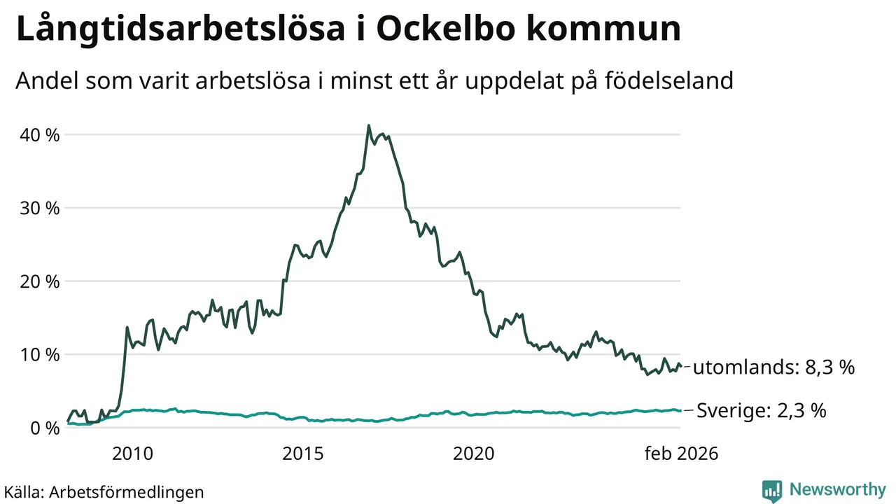 50 av de långtidsarbetslösa i Ockelbo är födda i Sverige, medan 32 är födda utomlands. Det innebär att långtidsarbetslösheten bland Sverigefödda är 2,3 procent, medan den är fyra gånger så hög – 8,3 procent – bland födda utomlands. Även i riket som helhet är arbetslösheten högre bland utrikesfödda.