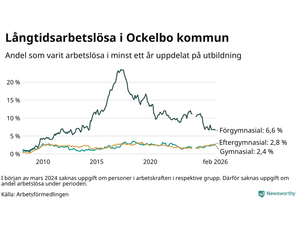I februari hade 82 Ockelbobor varit arbetslösa i minst ett år, vilket är en färre än månaden innan. 82 personer motsvarar 3,2 procent av arbetskraften i kommunen – andelen långtidsarbetslösa är 0,2 procentenheter högre än samma månad för ett år sedan.