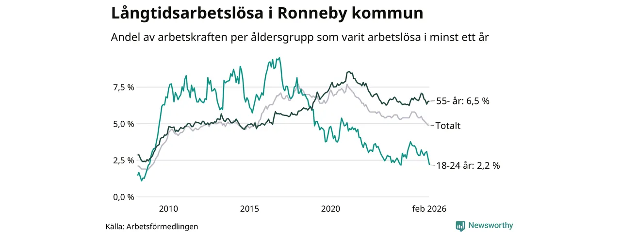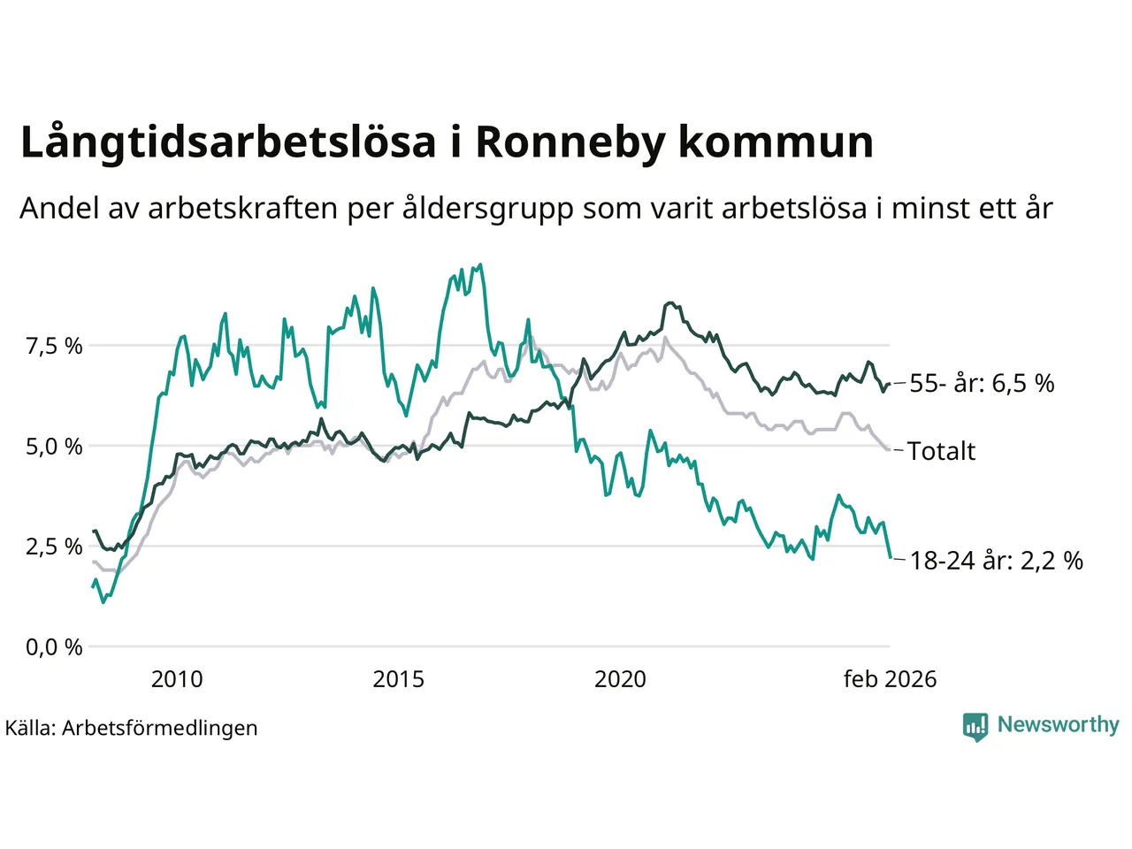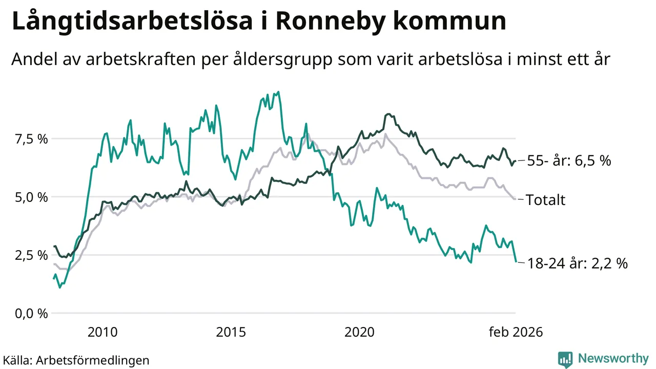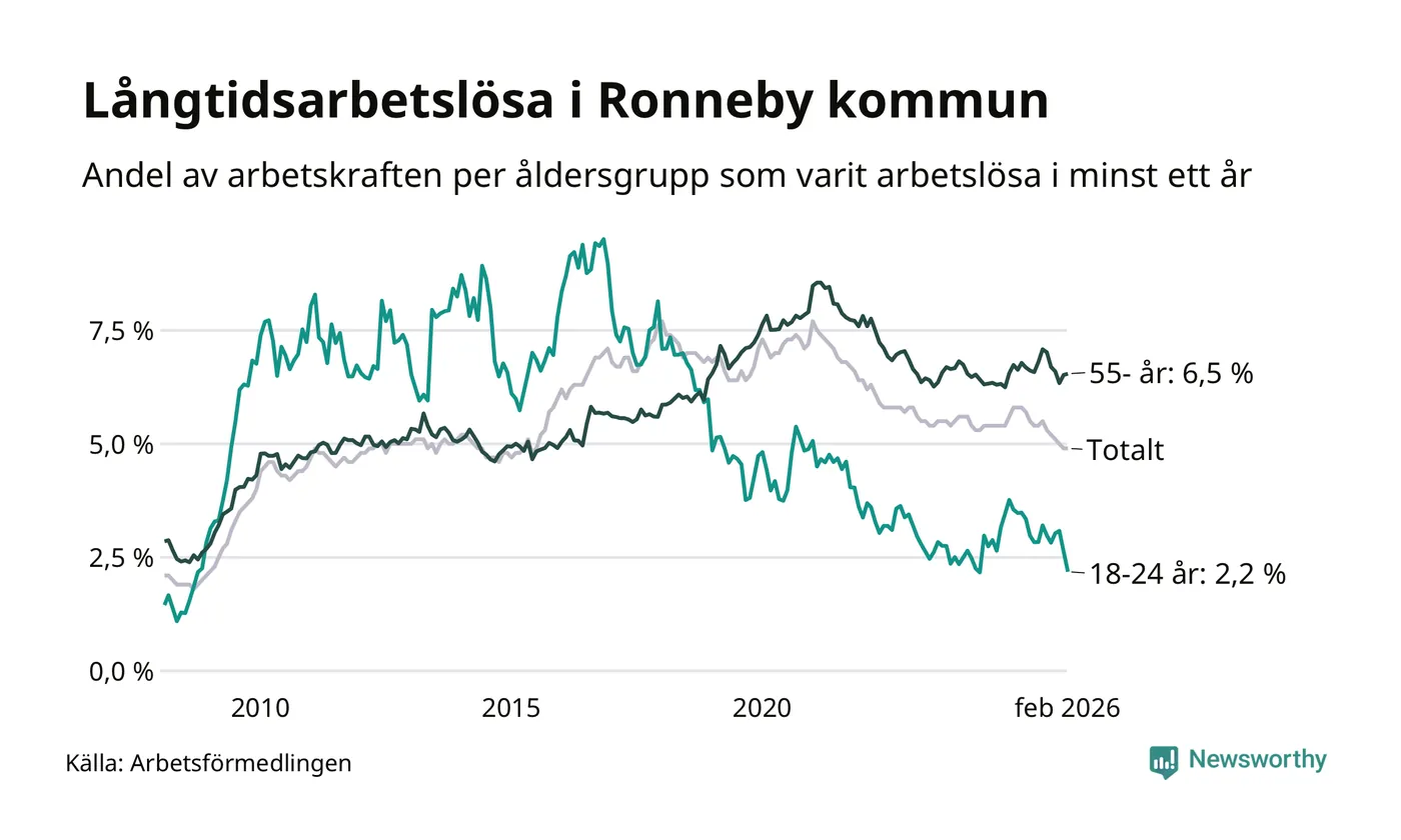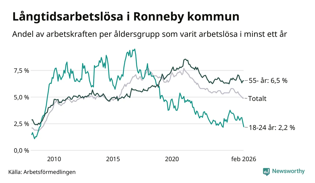 Av de 654 personerna som varit arbetslösa i mer än ett år i Ronneby kommun är 209 personer mellan 55 och 661 år och 30 är mellan 18 och 24 år. För den äldre gruppen är andelen arbetslösa 6,5 procent medan den i den yngre gruppen är 2,2 procent. Även i riket som helhet är långtidsarbetslösheten högre i gruppen äldre.