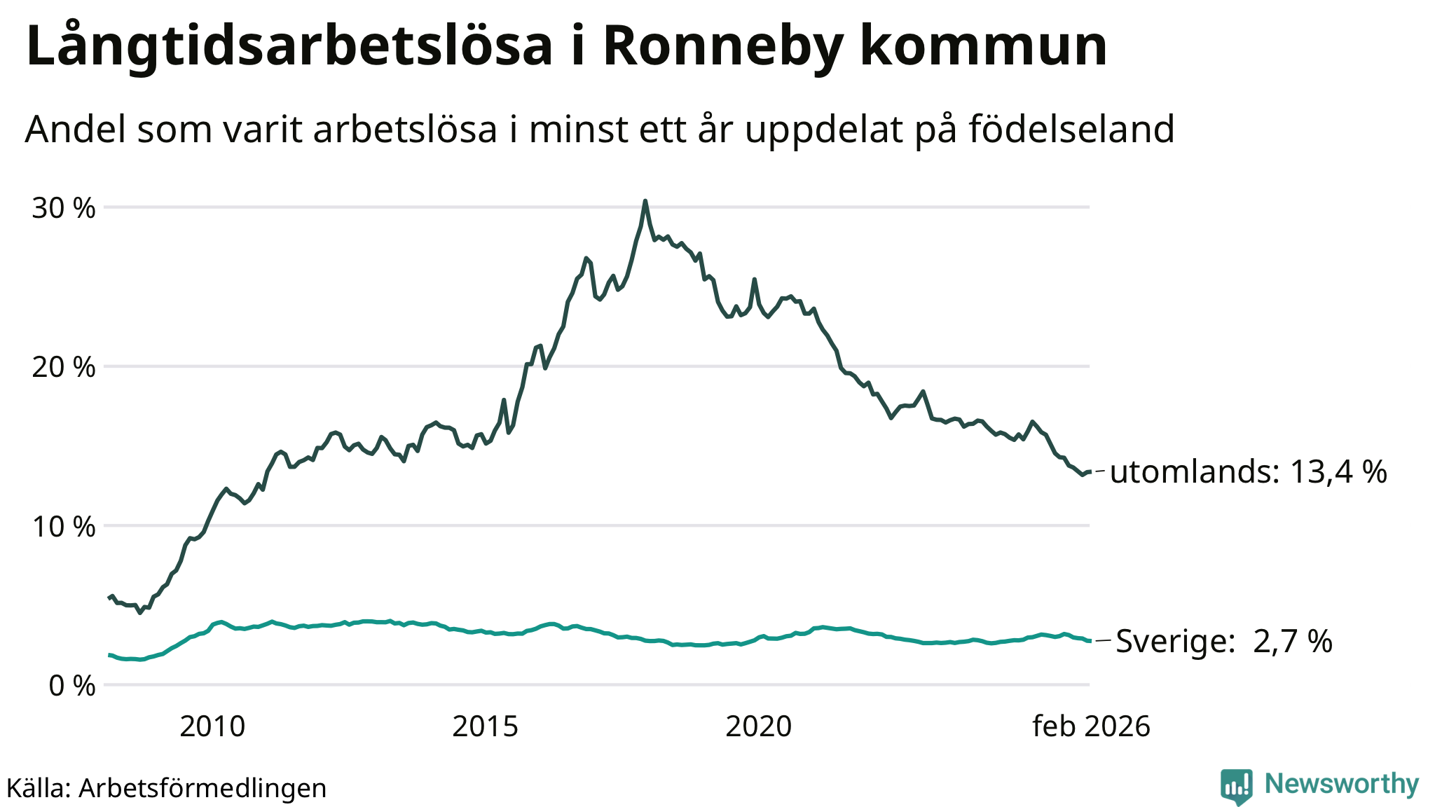 290 av de långtidsarbetslösa i Ronneby är födda i Sverige, medan 364 är födda utomlands. Det innebär att långtidsarbetslösheten bland Sverigefödda är 2,7 procent, medan den är fem gånger så hög – 13,4 procent – bland födda utomlands. Även i riket som helhet är arbetslösheten högre bland utrikesfödda.