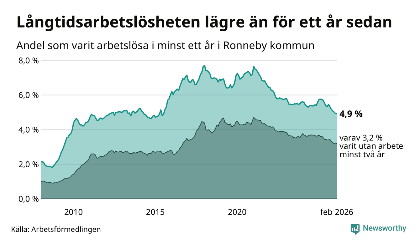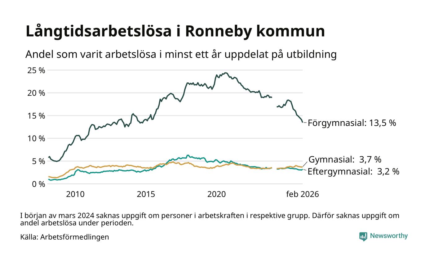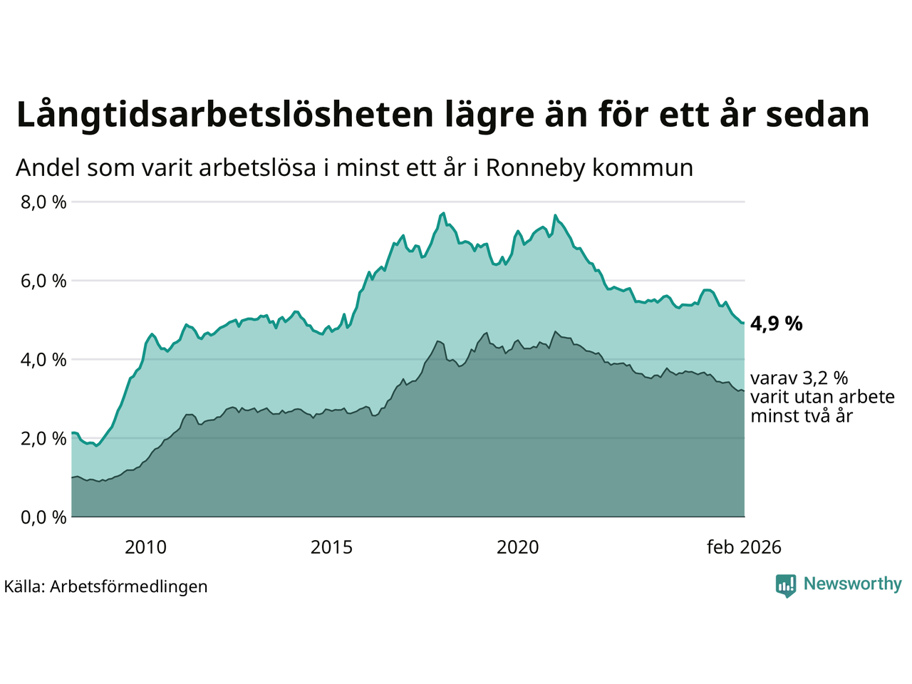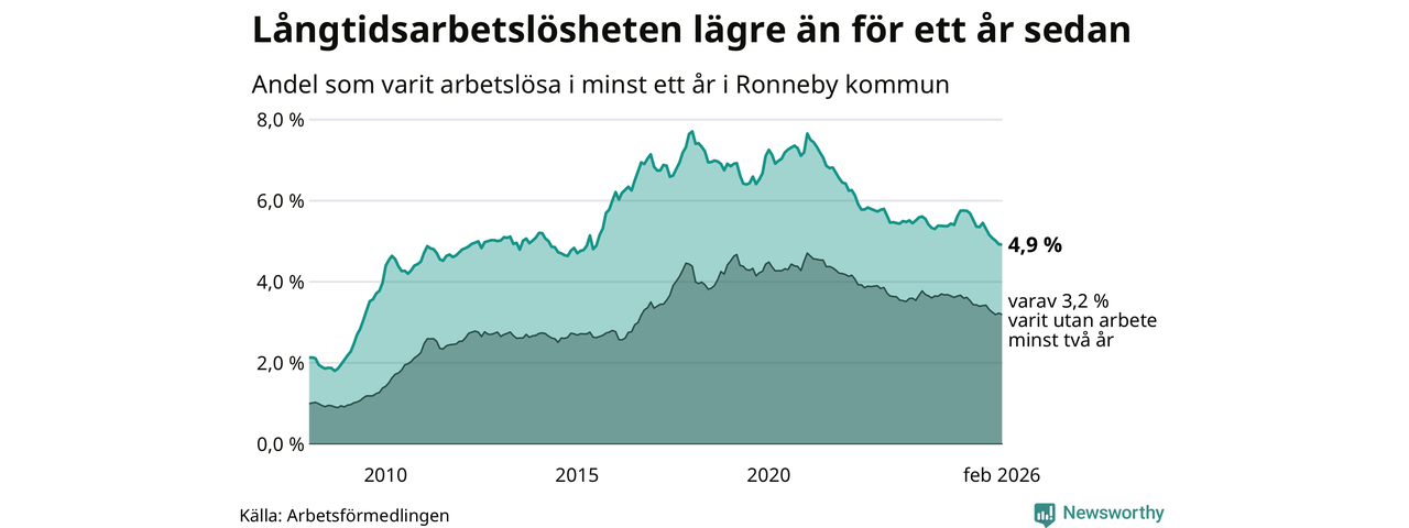 Andelen långtidsarbetslösa i Ronneby är den högsta i Blekinge län. I Karlskrona finns länets lägsta långtidsarbetslöshet, 2,3 procent. I Blekinge som helhet hade 2 431 personer (3,2 procent) varit arbetslösa i minst ett år i februari. Det är åtta personer färre än månaden innan.