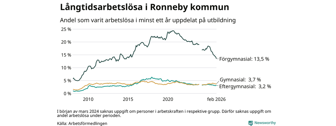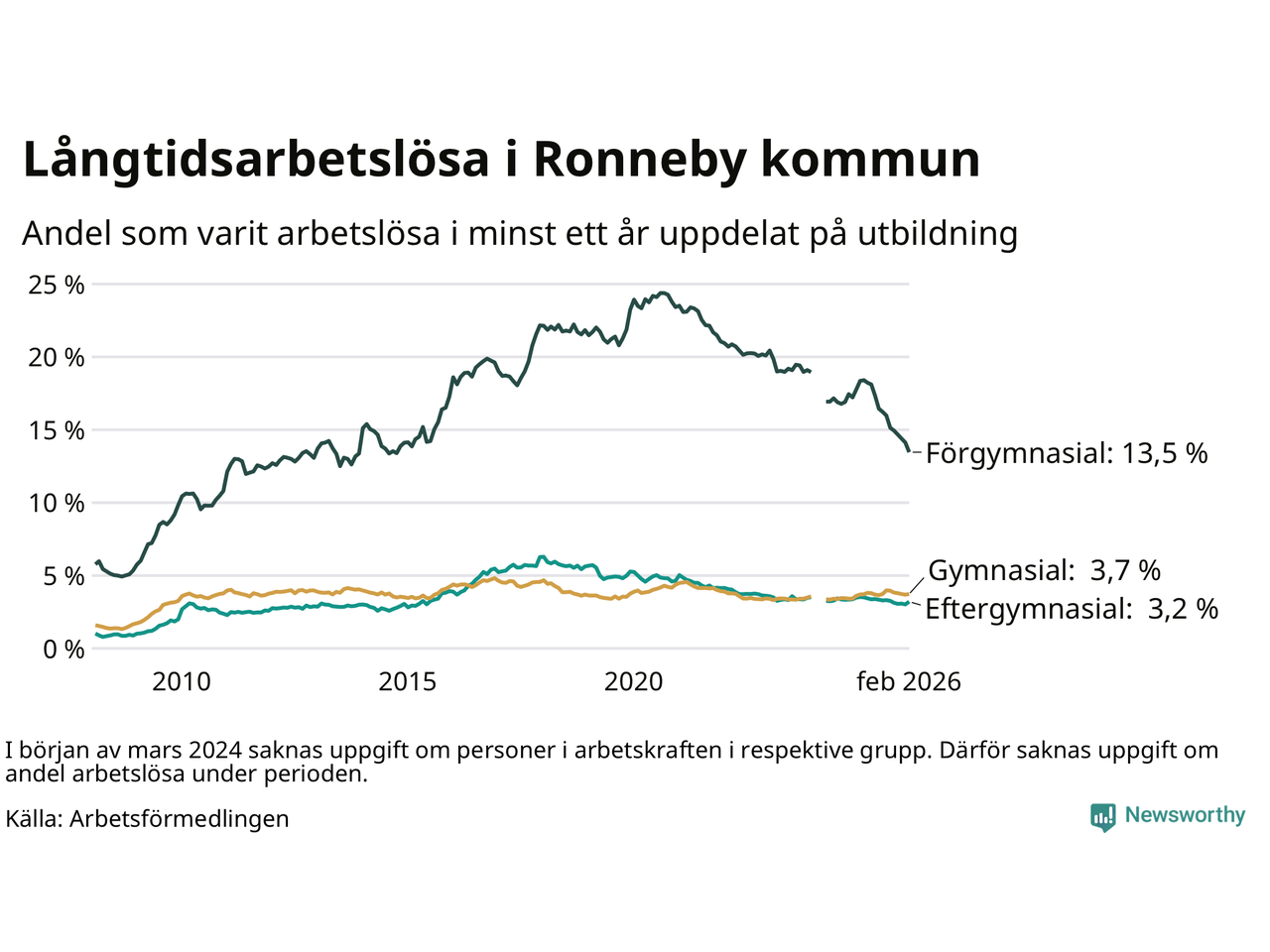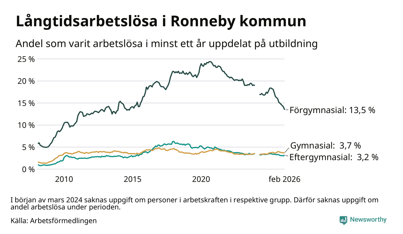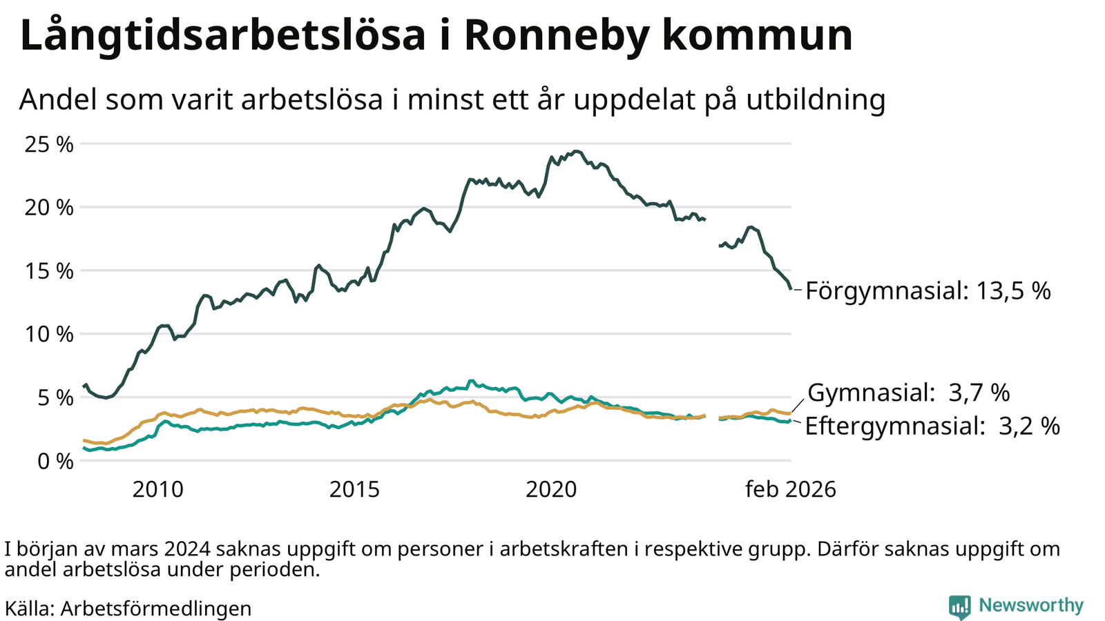 Andelen långtidsarbetslösa i Ronneby är den högsta i Blekinge län. I Karlskrona finns länets lägsta långtidsarbetslöshet, 2,3 procent. I Blekinge som helhet hade 2 431 personer (3,2 procent) varit arbetslösa i minst ett år i februari. Det är åtta personer färre än månaden innan.