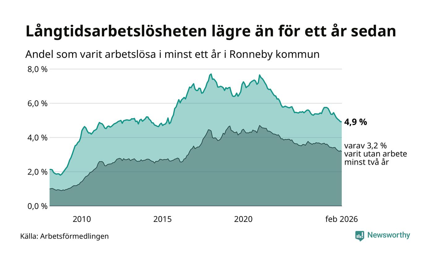 I februari hade 654 Ronnebybor varit arbetslösa i minst ett år, vilket är en färre än månaden innan. Det är den sjätte månaden i rad med minskande antal långtidsarbetslösa. 654 personer motsvarar 4,9 procent av arbetskraften i kommunen – andelen långtidsarbetslösa är 0,9 procentenheter lägre än samma månad för ett år sedan. Ronneby tillhör de kommuner som har högst andel långtidsarbetslösa i hela landet just nu.