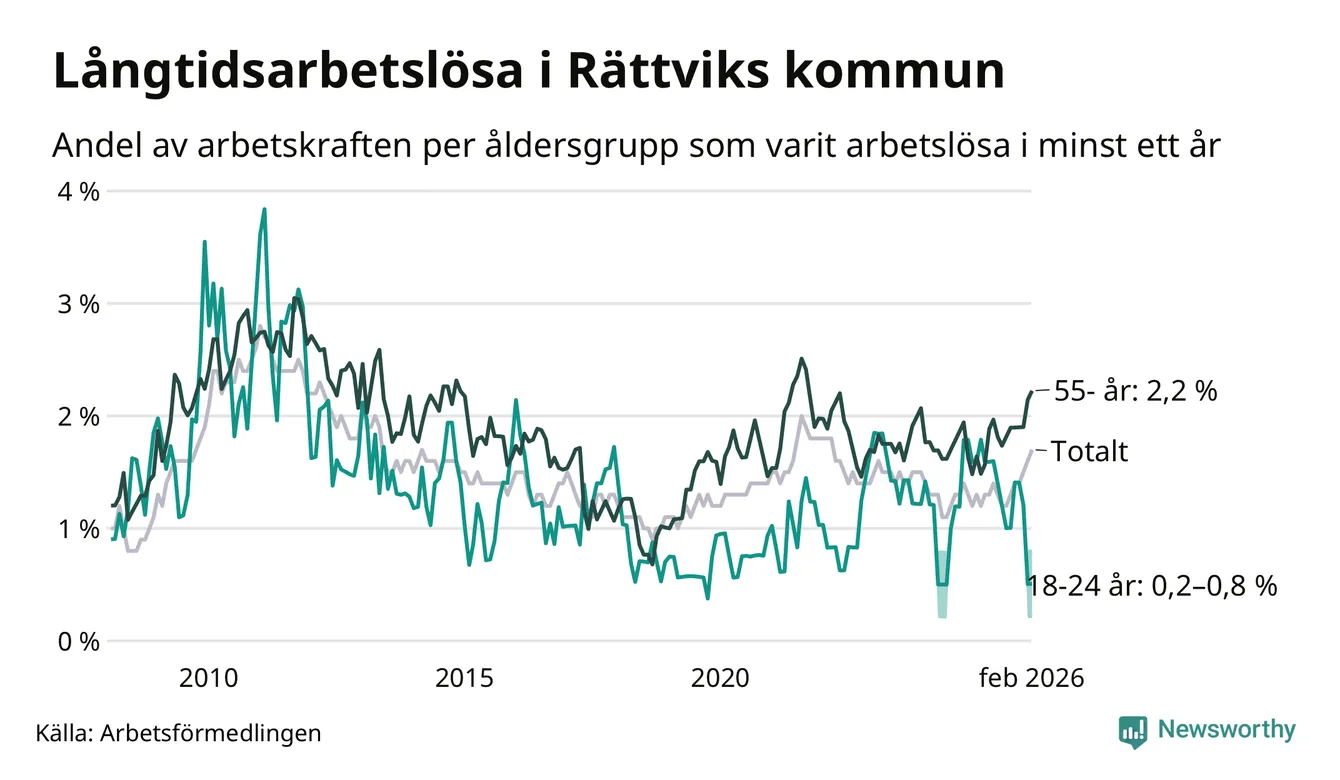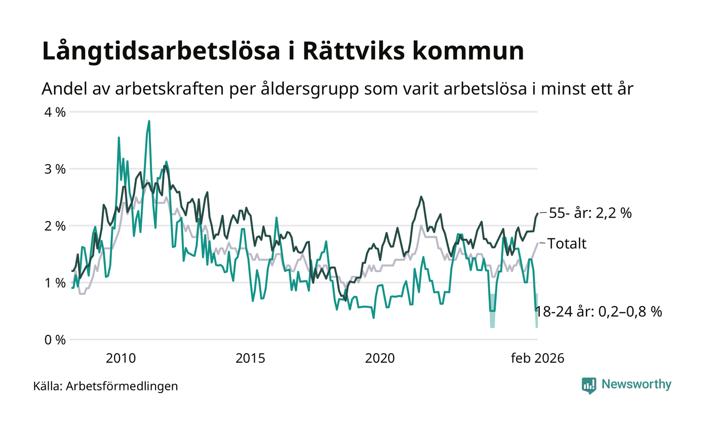 Av de 81 personerna som varit arbetslösa i mer än ett år i Rättviks kommun är 28 personer mellan 55 och 661 år och mellan en och fyra är mellan 18 och 24 år. För den äldre gruppen är andelen arbetslösa 2,2 procent medan den i den yngre gruppen är mellan 0,2 och 0,8 procent. Även i riket som helhet är långtidsarbetslösheten högre i gruppen äldre.