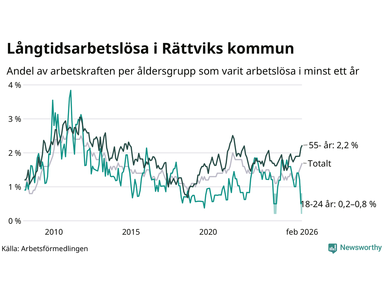 Graf: Andel arbetslösa uppdelat i åldersgrupper i Rättvik