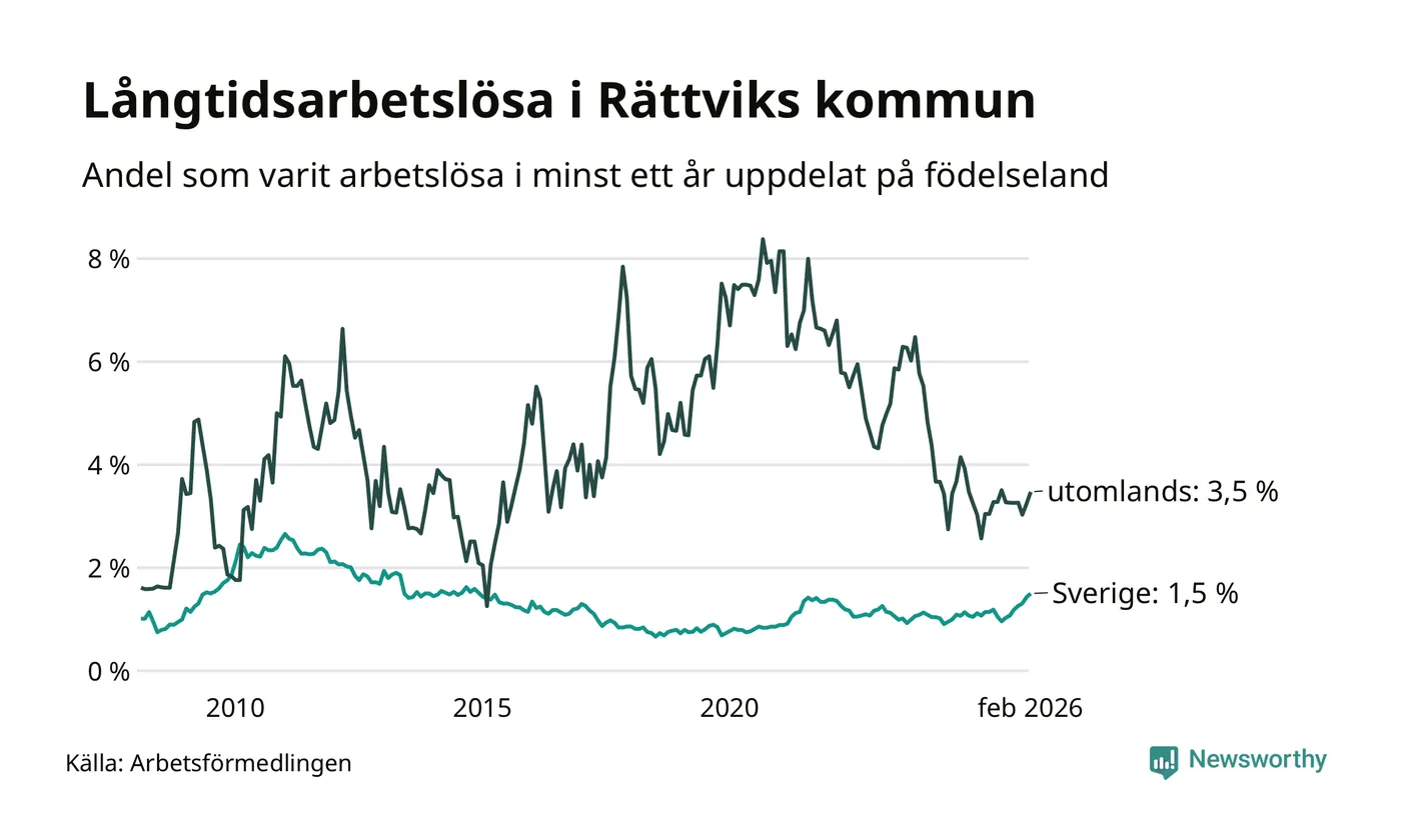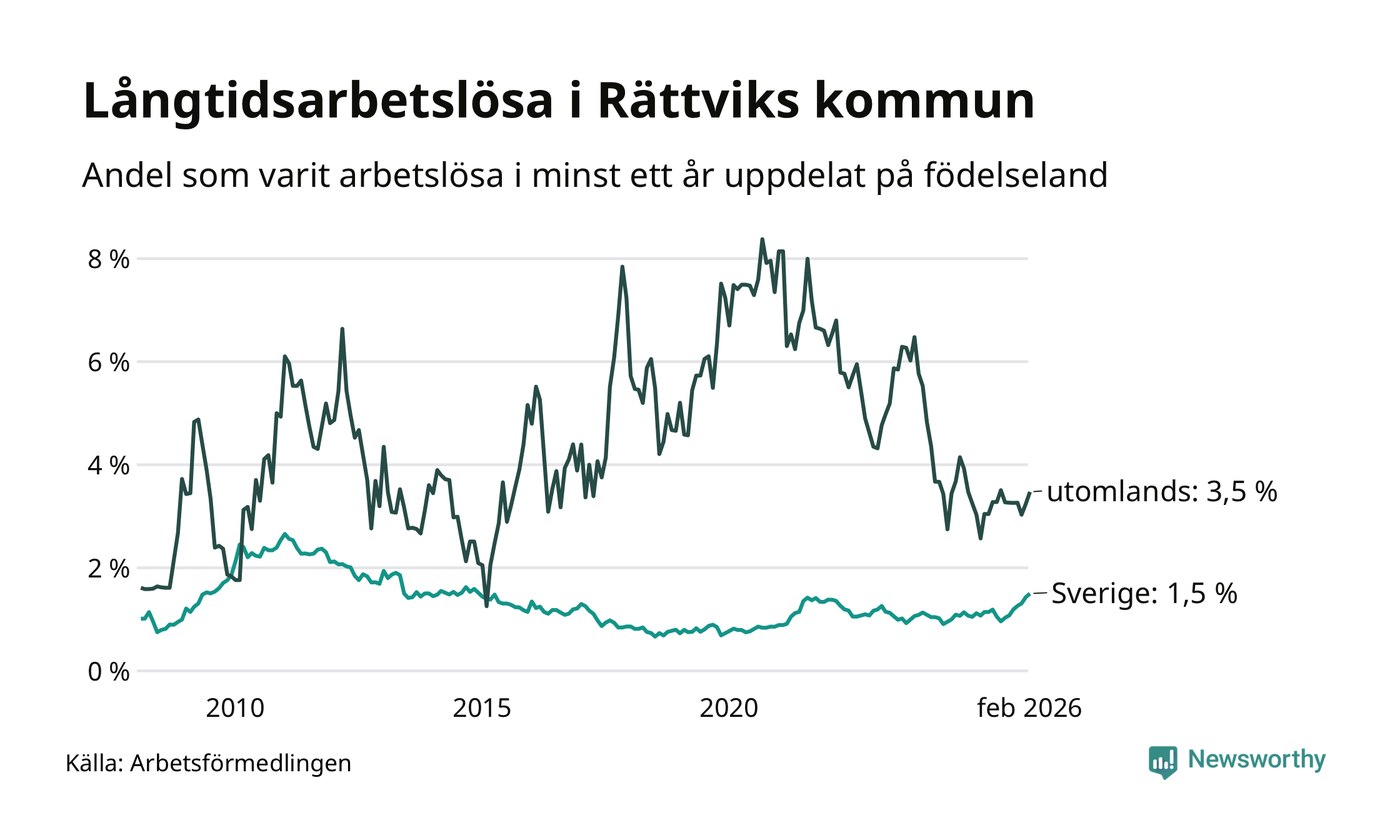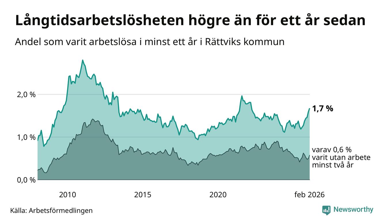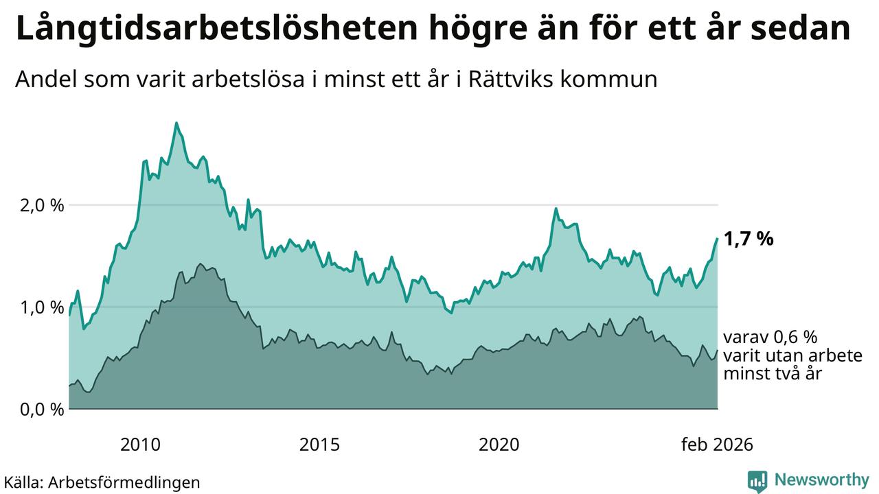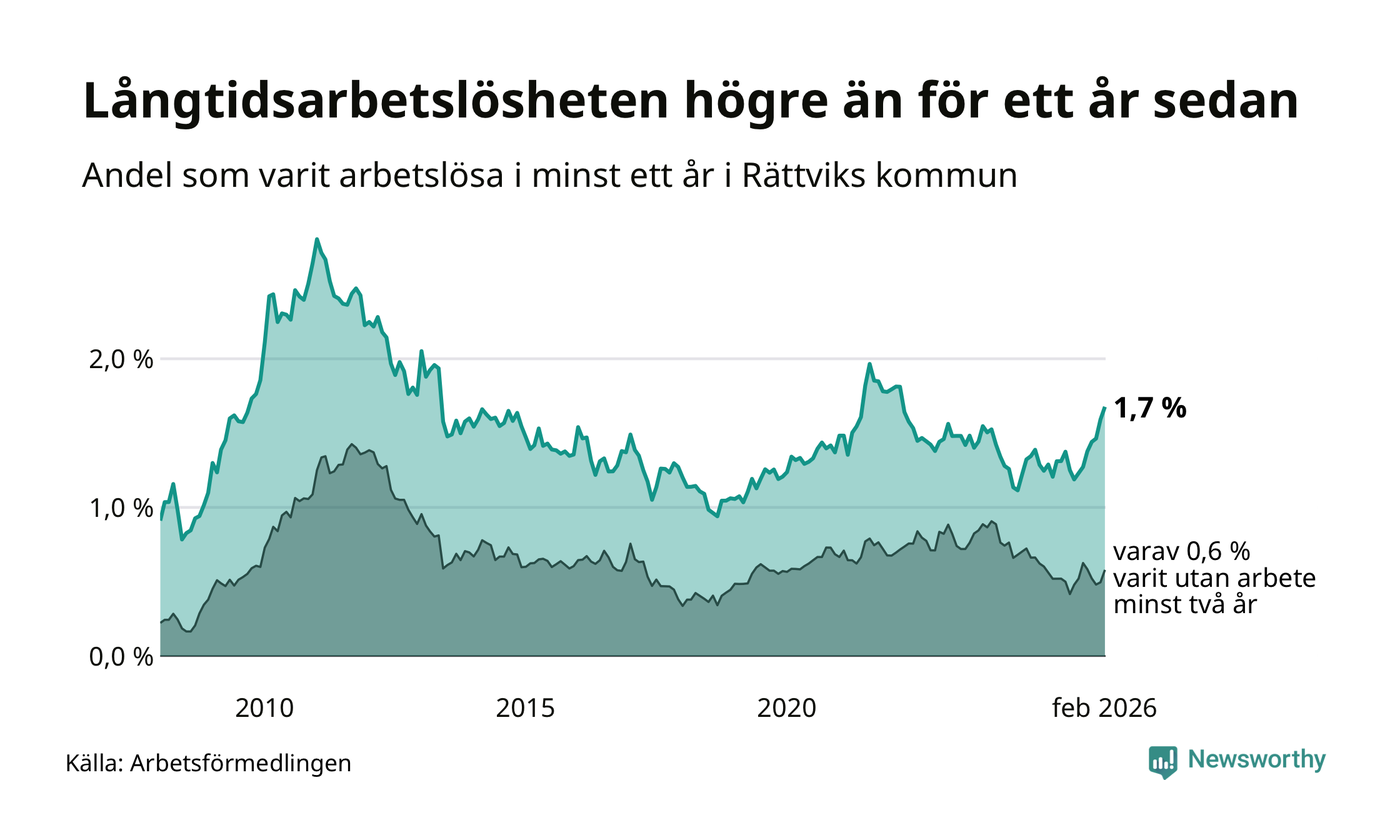 I februari hade 81 Rättviksbor varit arbetslösa i minst ett år, vilket är fyra fler än månaden innan. Det är den sjunde månaden i rad med ökande antal långtidsarbetslösa. 81 personer motsvarar 1,7 procent av arbetskraften i kommunen – andelen långtidsarbetslösa är 0,5 procentenheter högre än samma månad för ett år sedan.