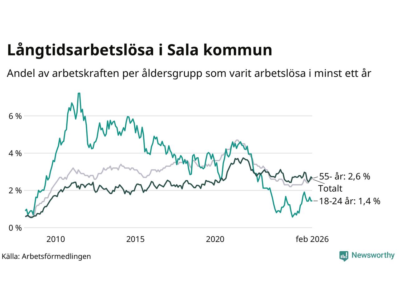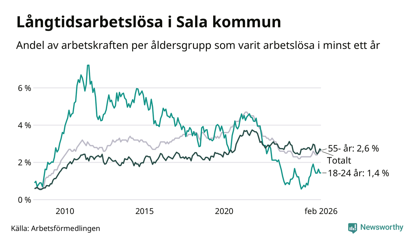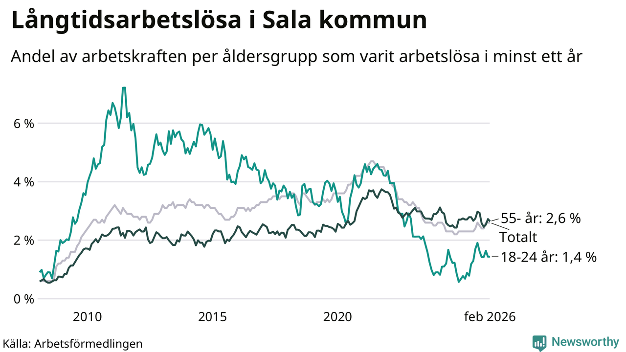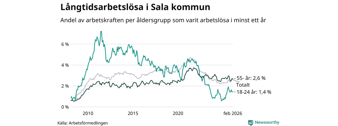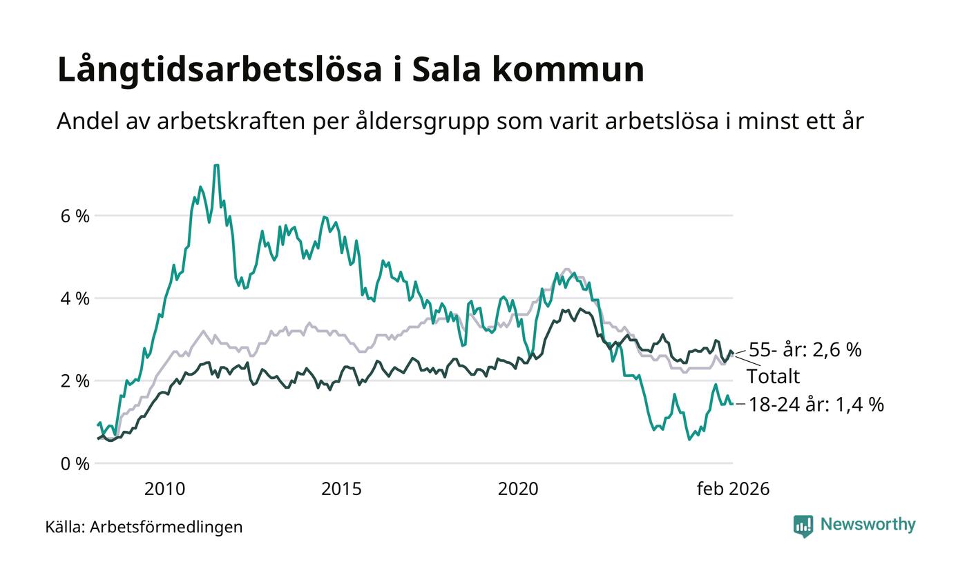 Av de 275 personerna som varit arbetslösa i mer än ett år i Sala kommun är 68 personer mellan 55 och 661 år och 14 är mellan 18 och 24 år. För den äldre gruppen är andelen arbetslösa 2,6 procent medan den i den yngre gruppen är 1,4 procent. Även i riket som helhet är långtidsarbetslösheten högre i gruppen äldre.